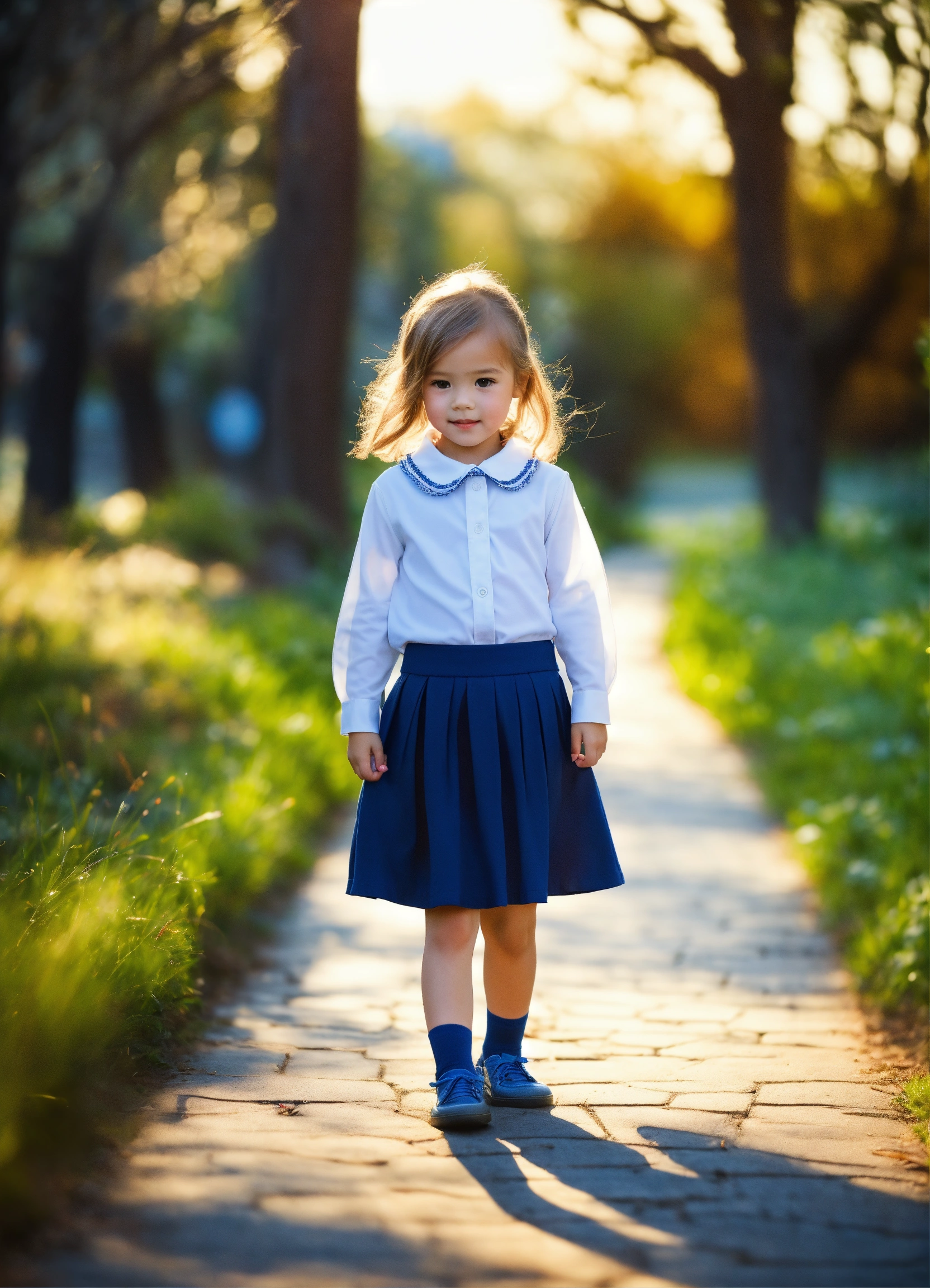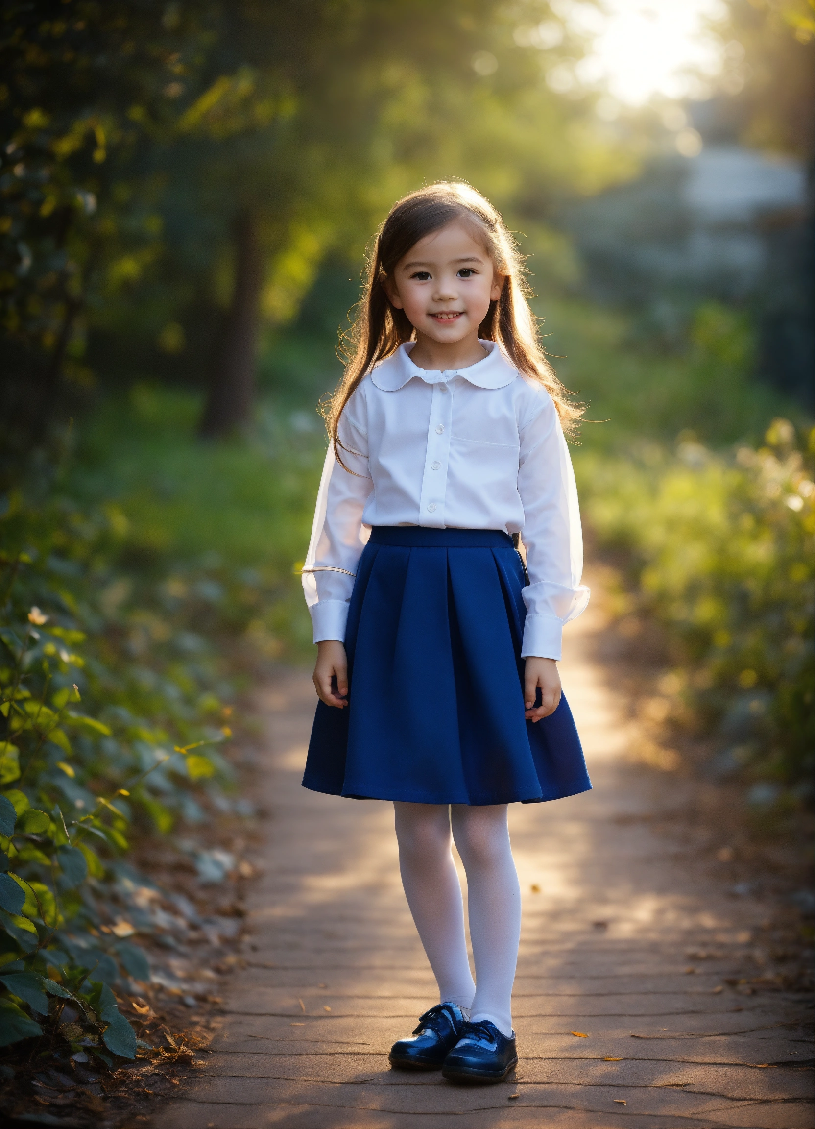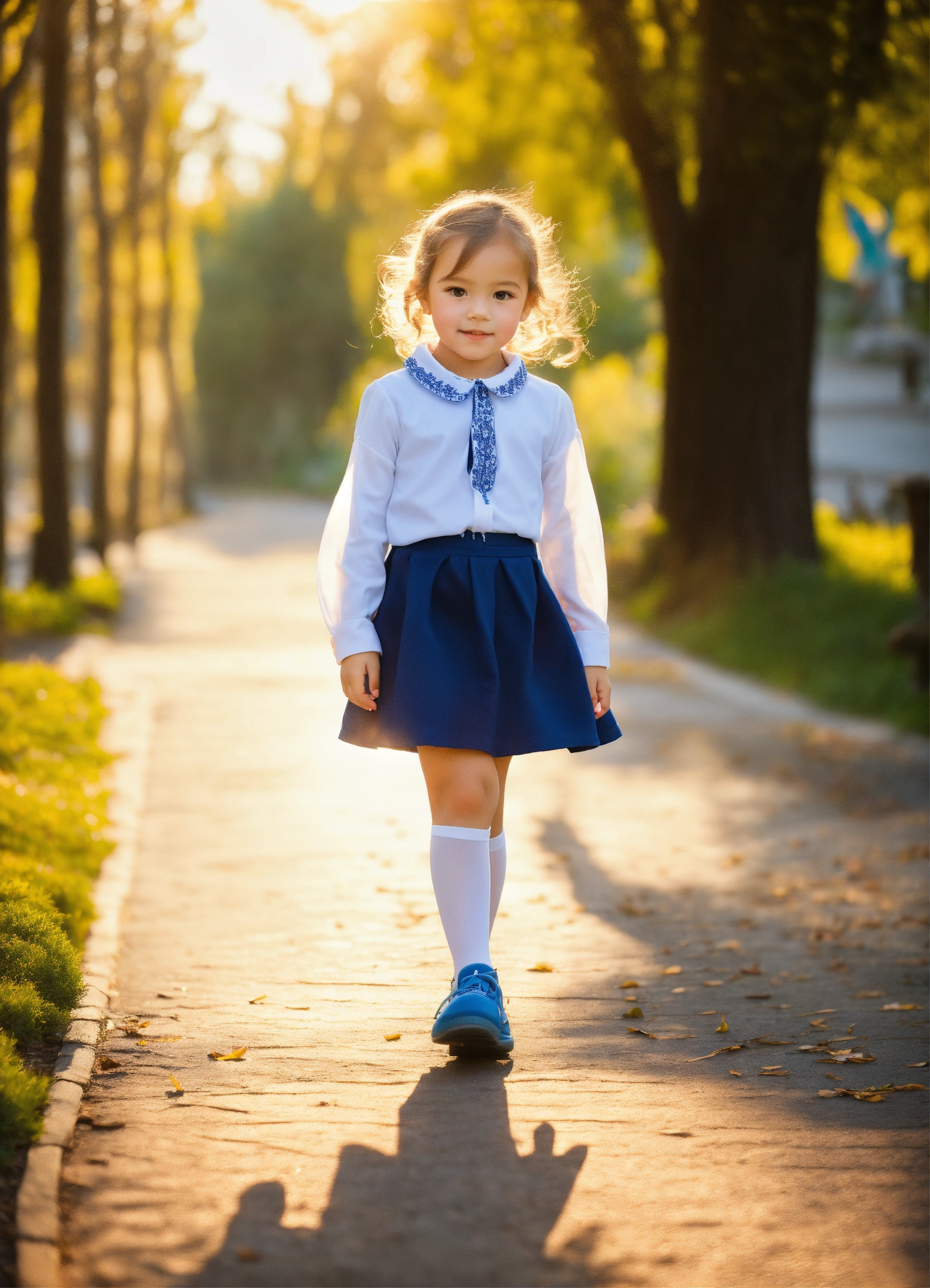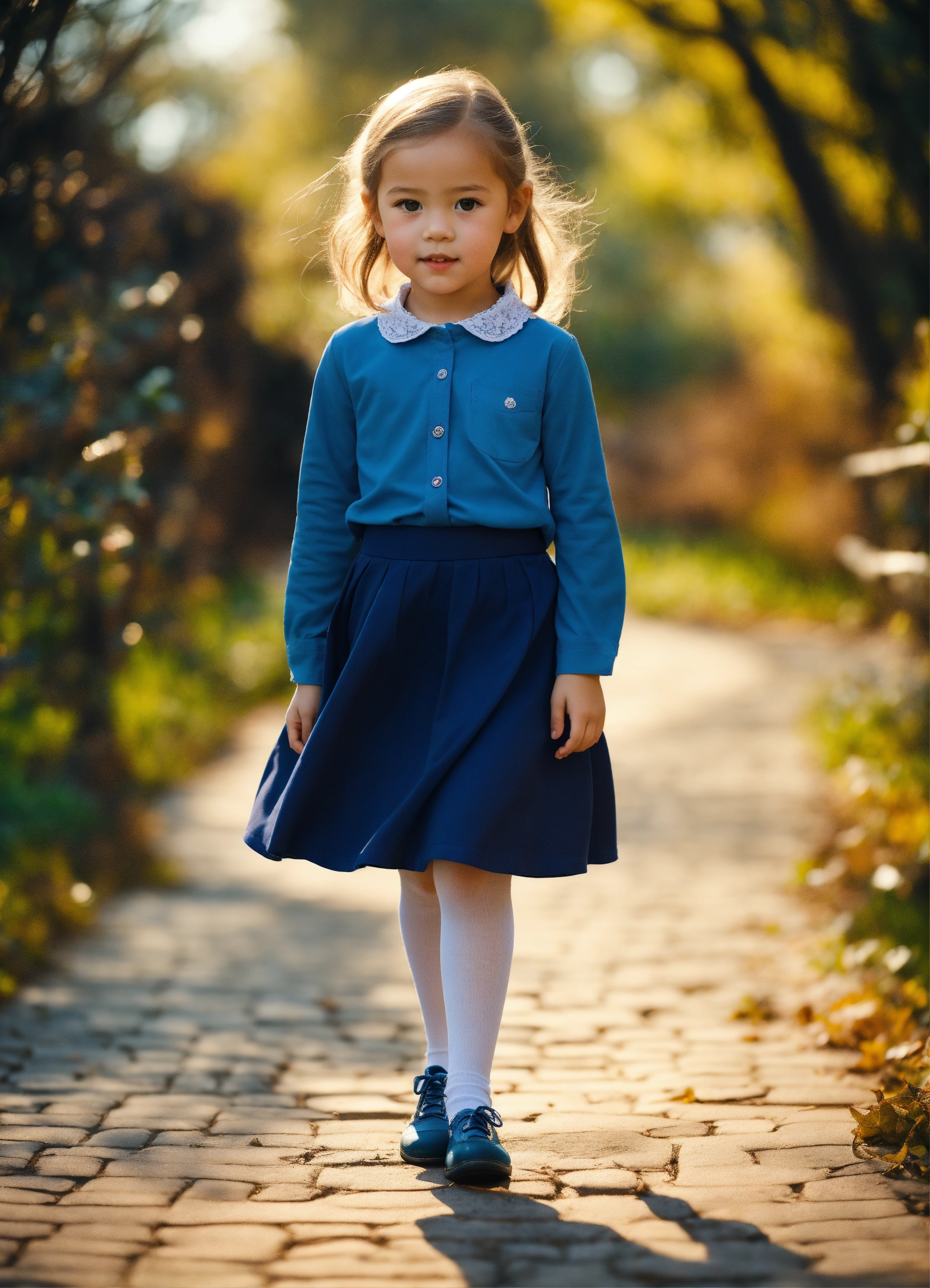 A cute five-year-old girl wearing a shirt with long sleeves and a collar, a long dark blue skirt and white tights that cover the leg, blue shoes walking on the path summer lighting, photo realistic style