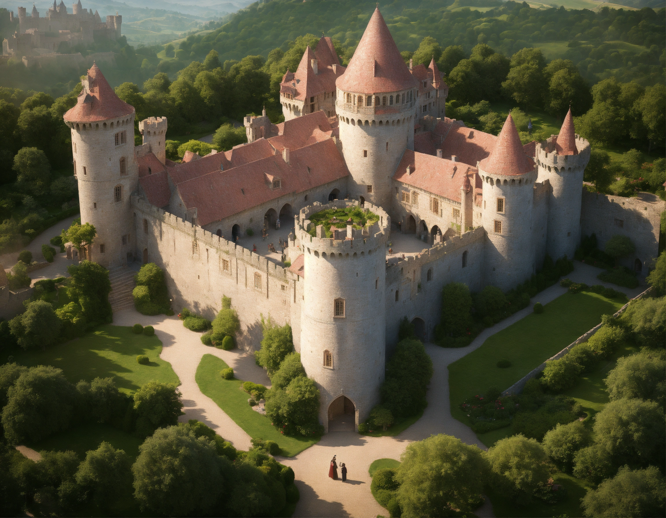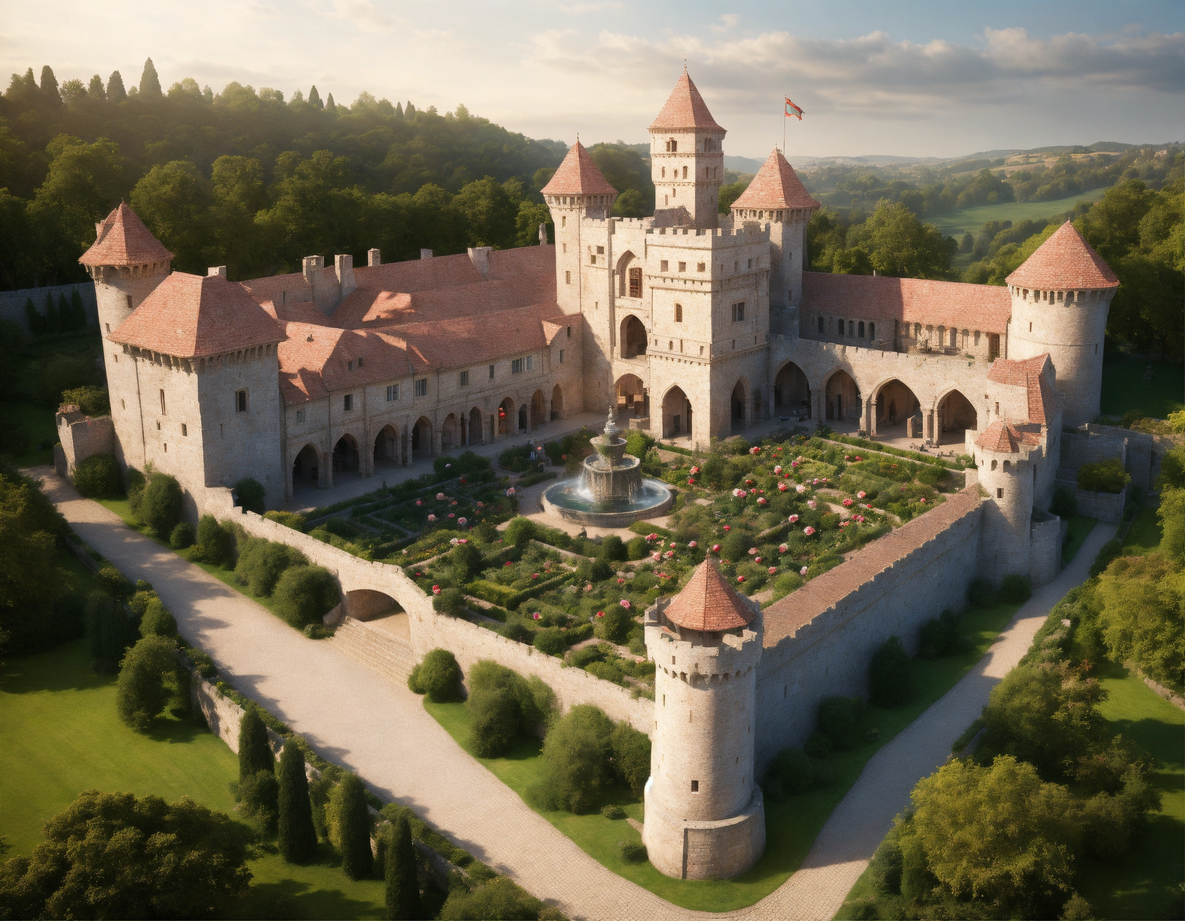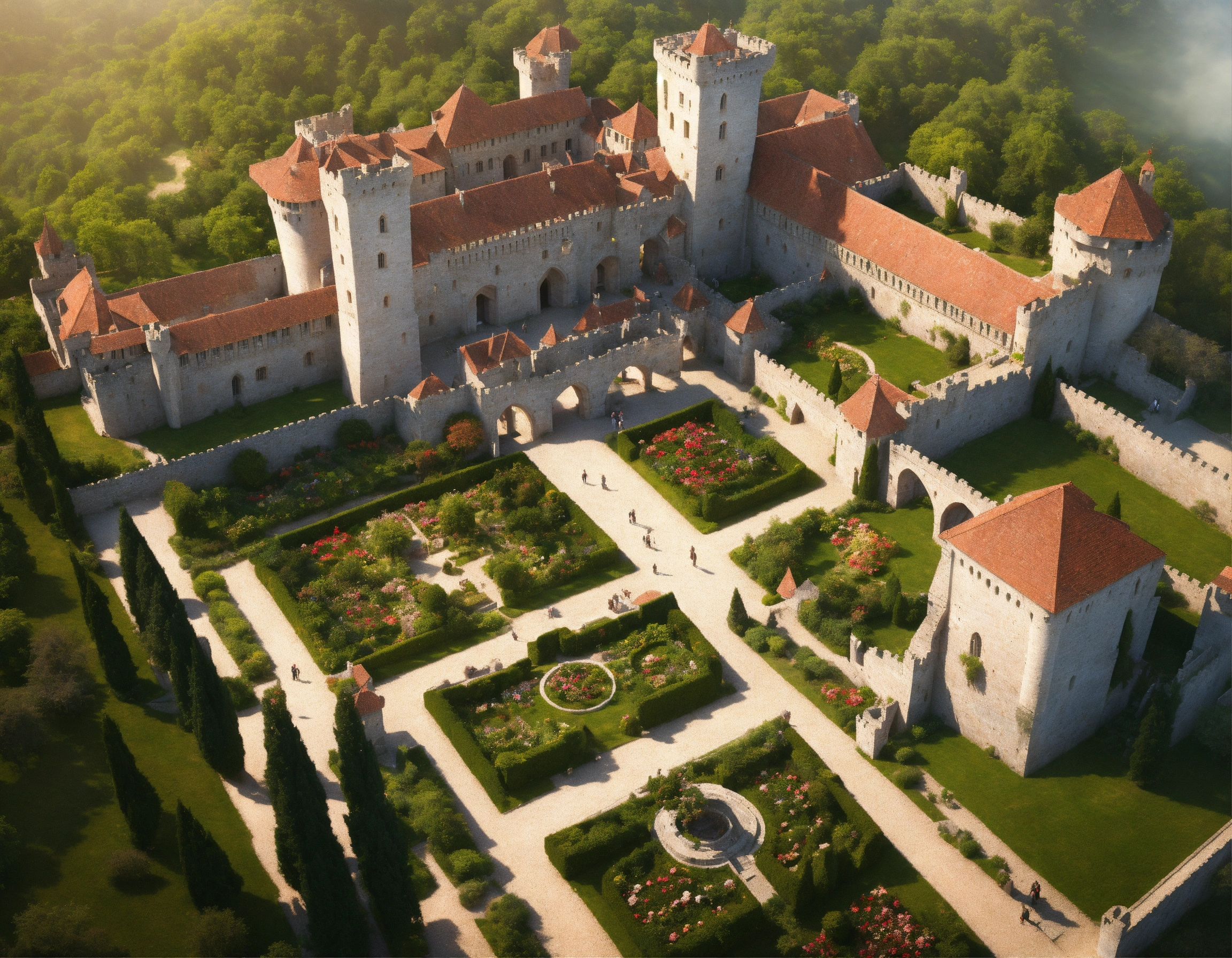 Ultra realistic, photorealistic, bird's eye view of a medieval castle, palace of roses, rose bowers, magnificent rose garden and arcades, magnificent fountain, marble figures, massive crenellated stone wall with wall gate and watchtowers, with a large inner courtyard and several servants' quarters, extensive rose fields on hilly landscapes in the area, very detailled, focus on castle, sharp focus, sharp, ambient lighting
