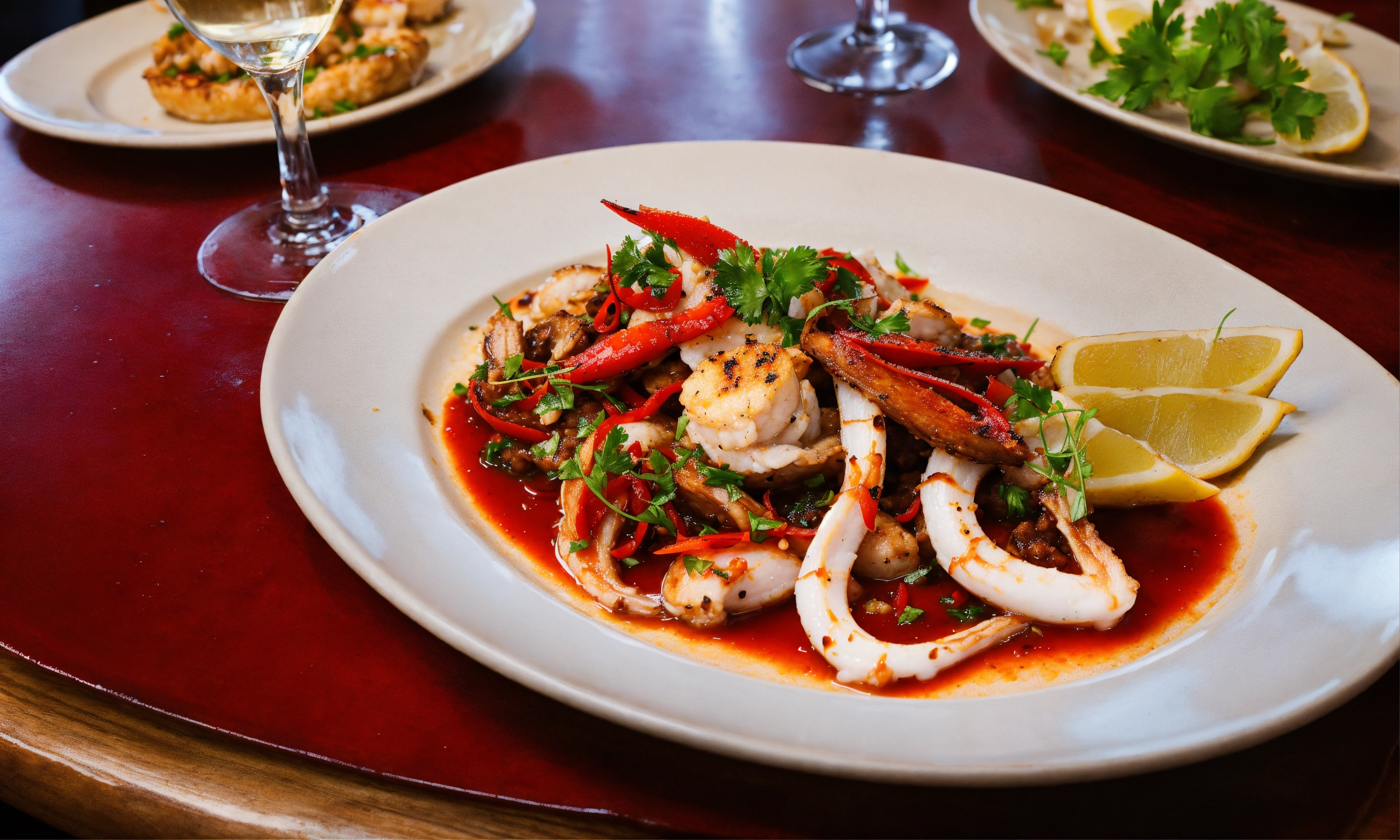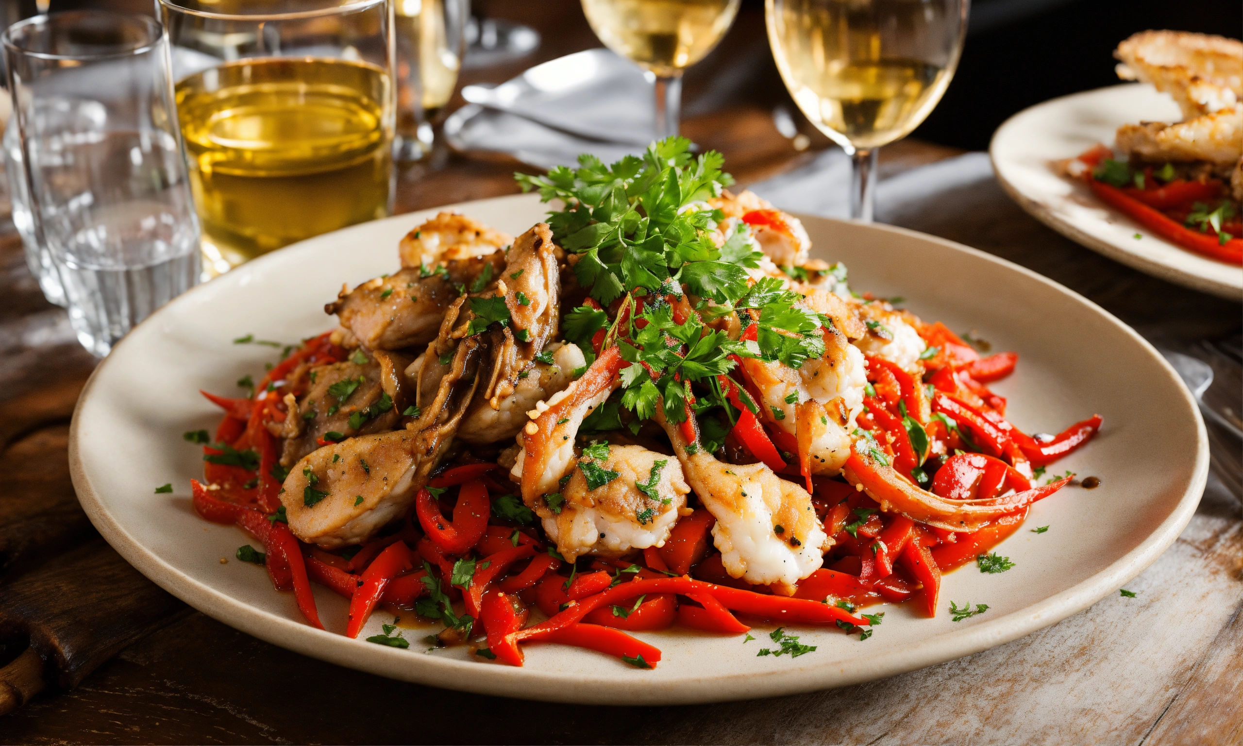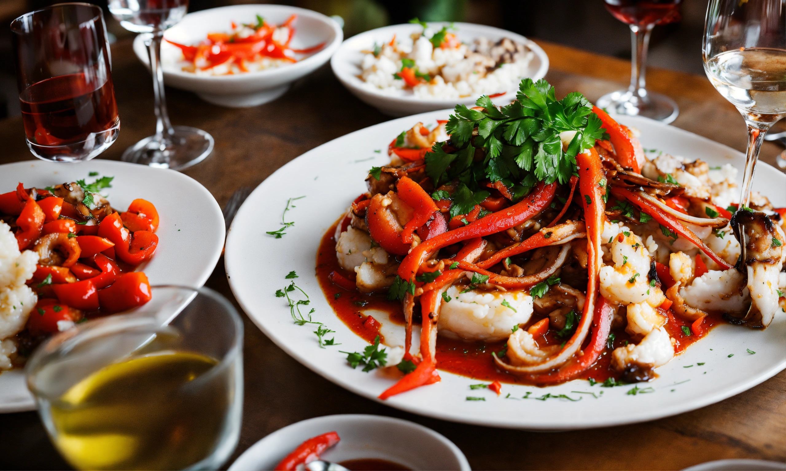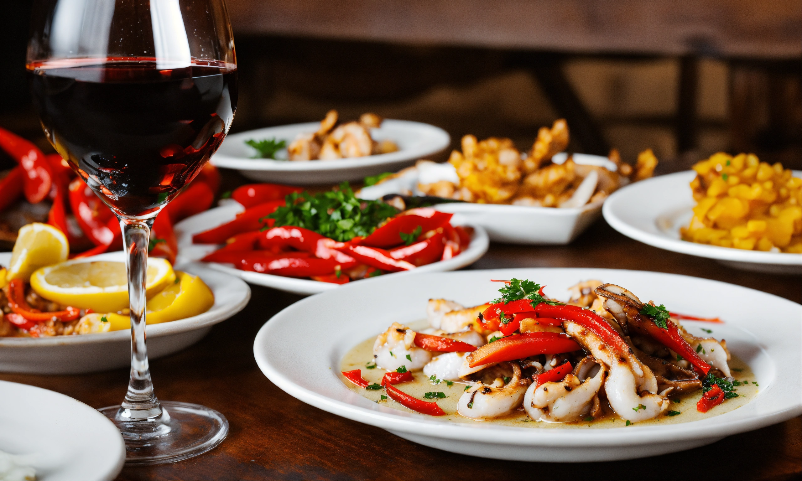 A table at a rustic restaurant with plates of frogs legs and squid sauteed with red peppers and glasses of wine