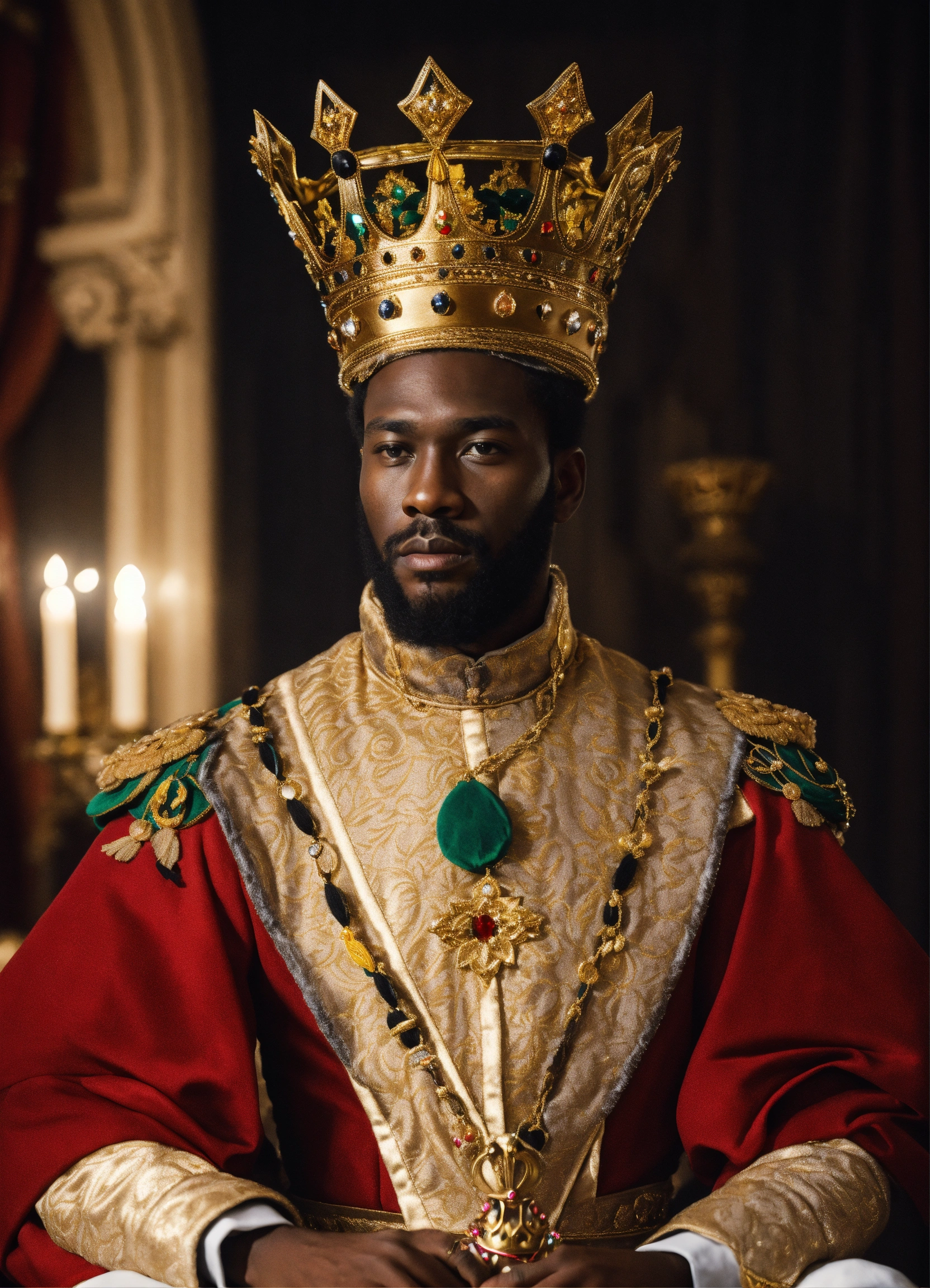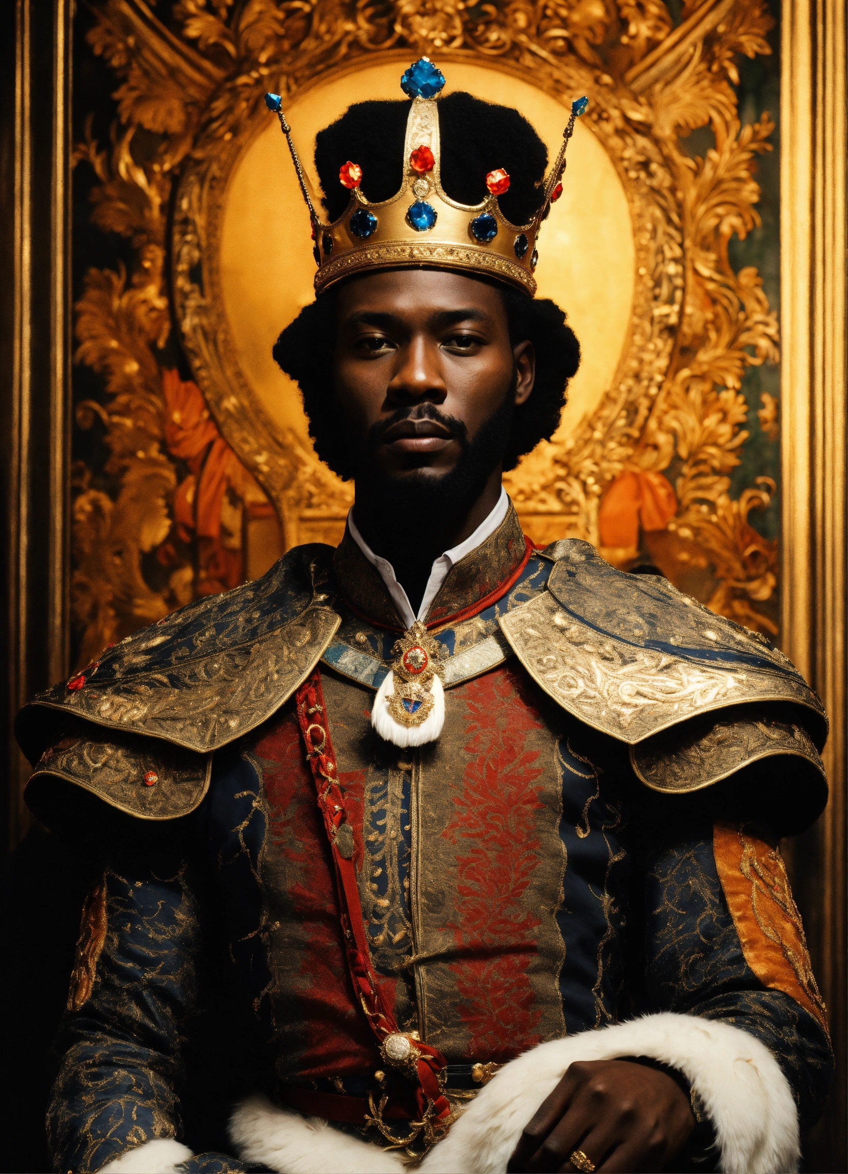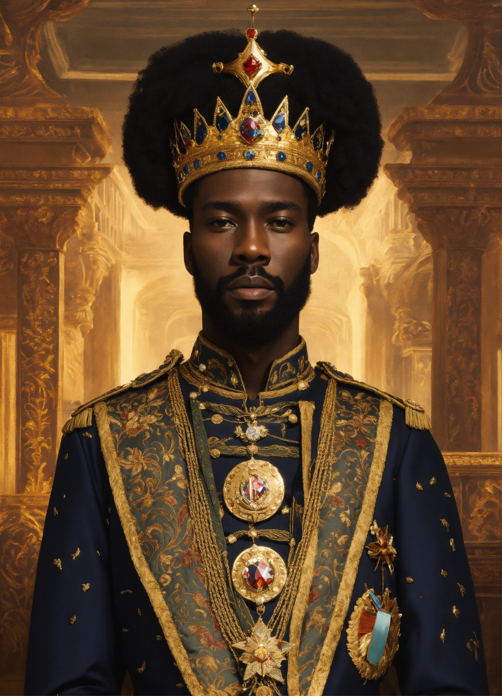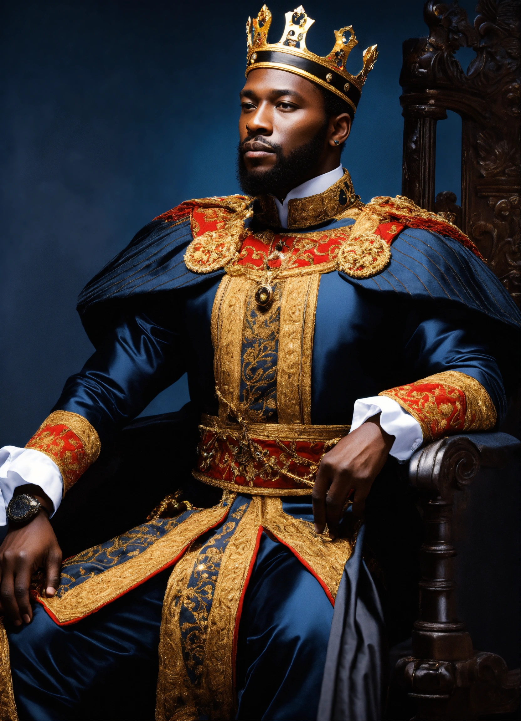 A black king with a beautiful crown and uniform
