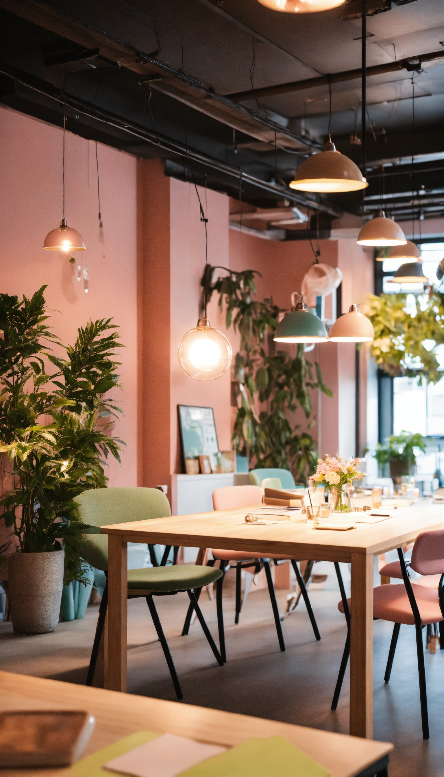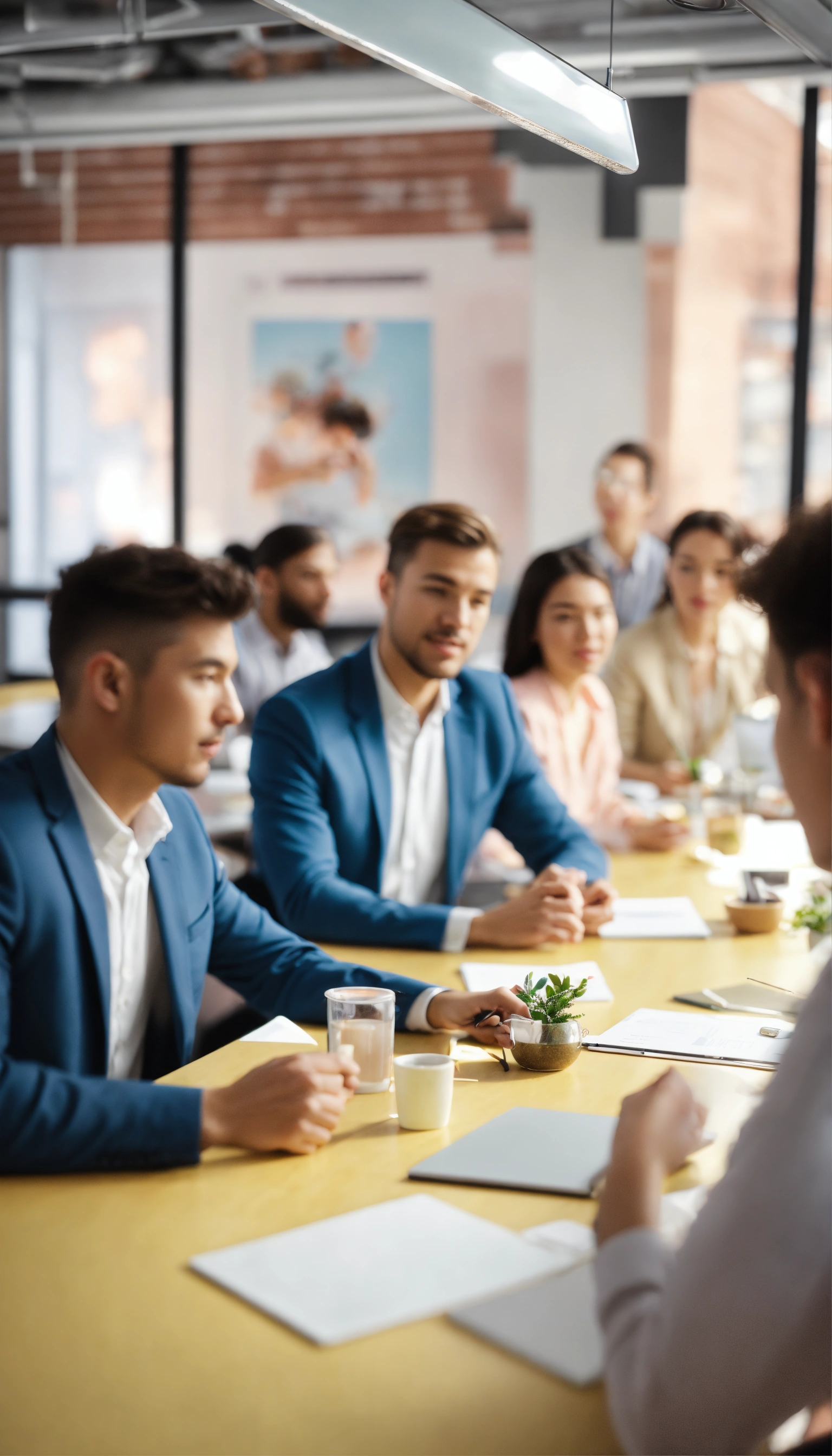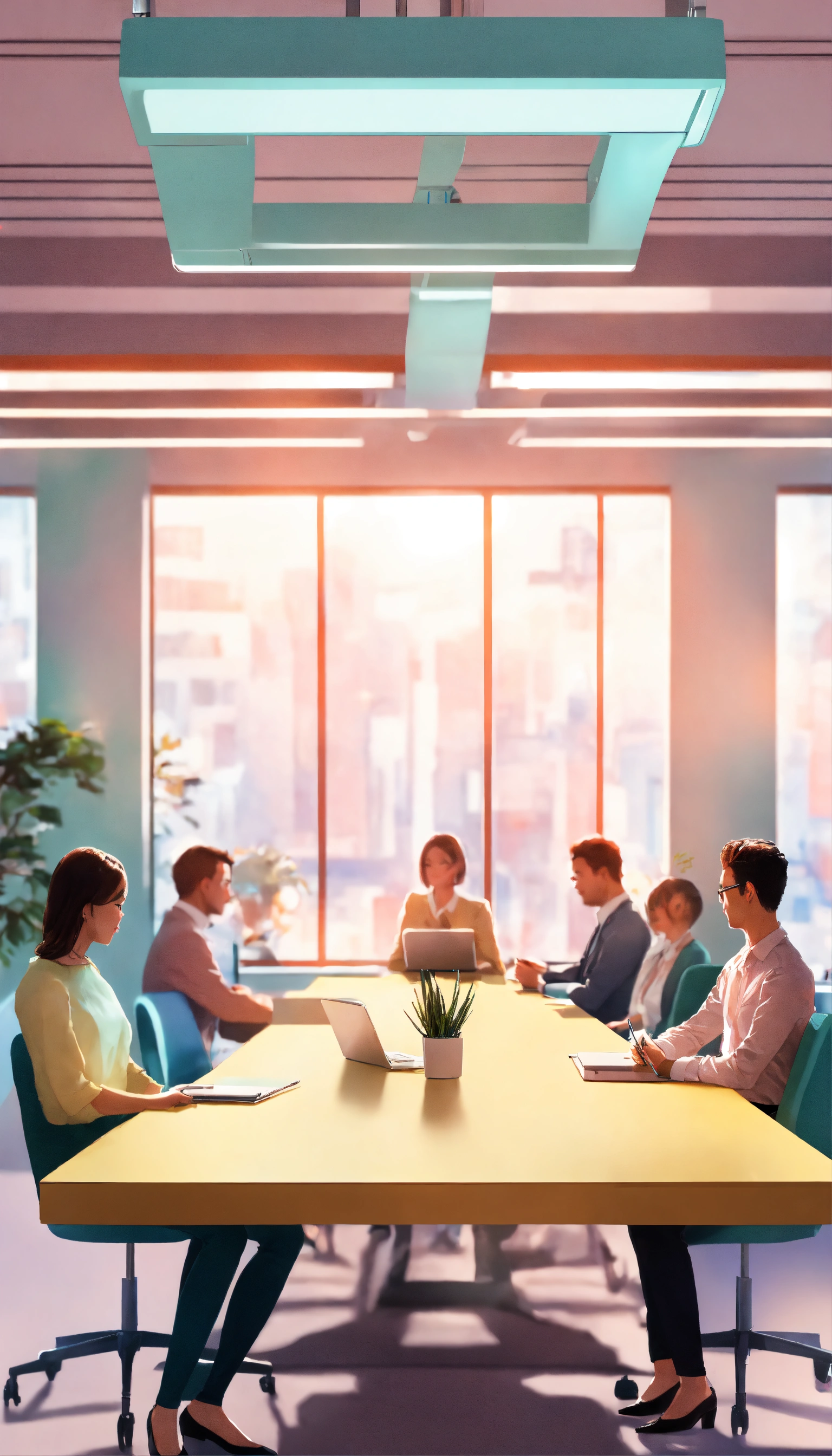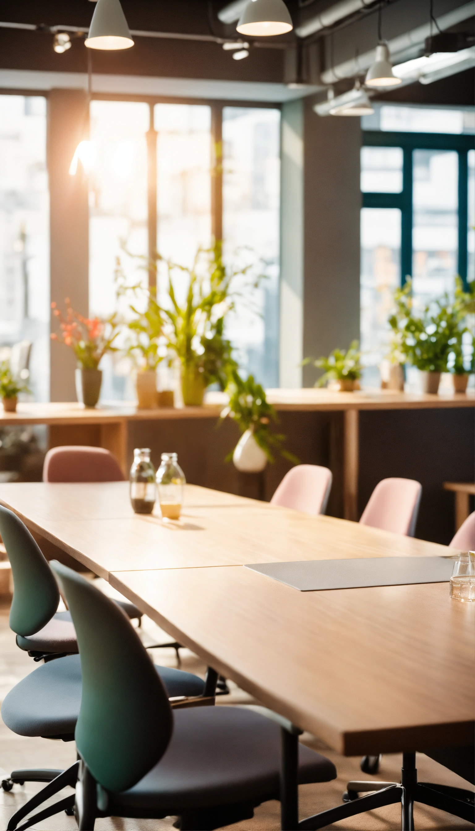 Table close-up, there is a meeting in the background, office space, bright lighting, lots of people, pastel colors, real photo