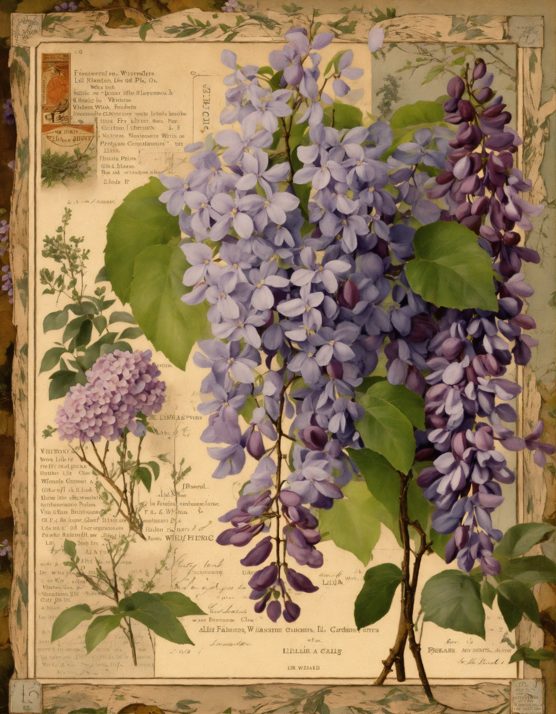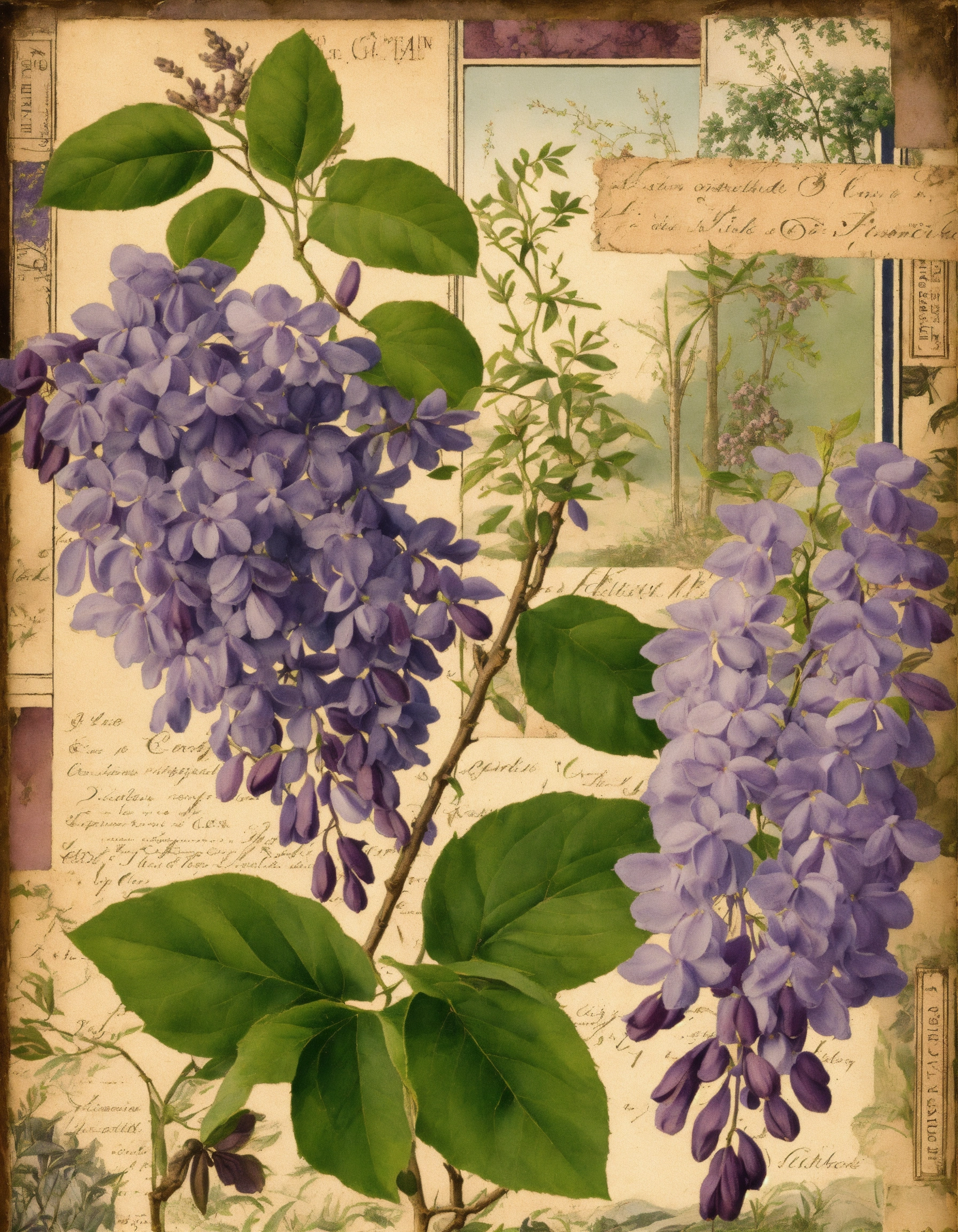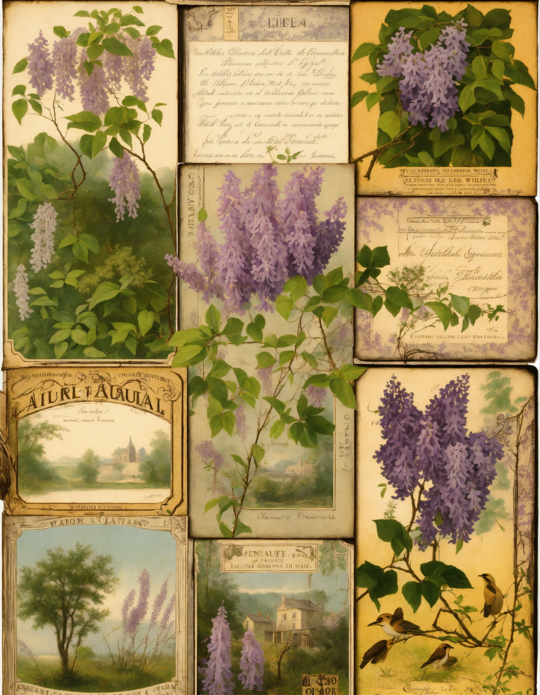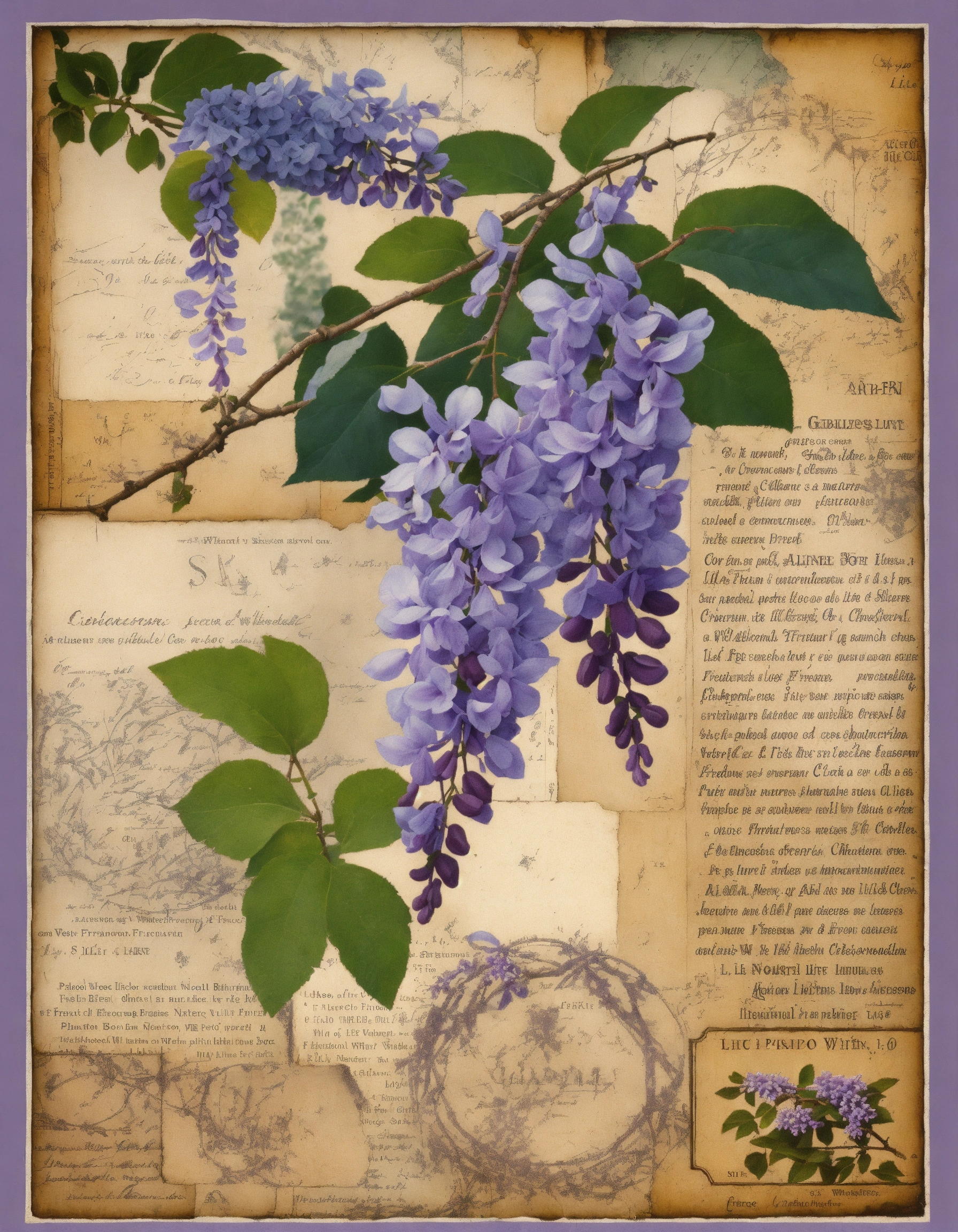Lilac wisteria, collage background of various old labels, french country style art, vintage, nature, with the theme of branches with little foliage, grass, composition of various prints glued together with themes related to nature, soft natural colors and