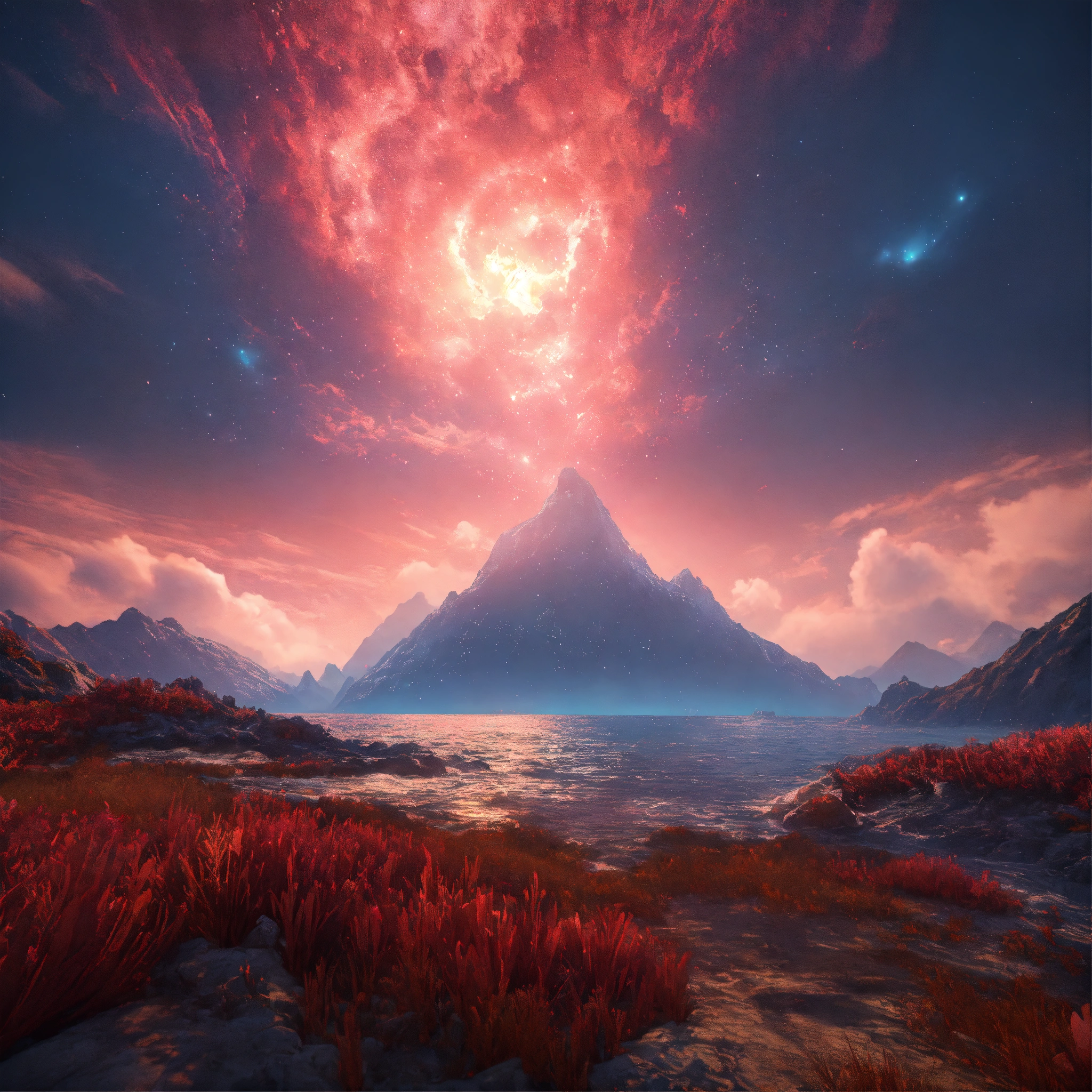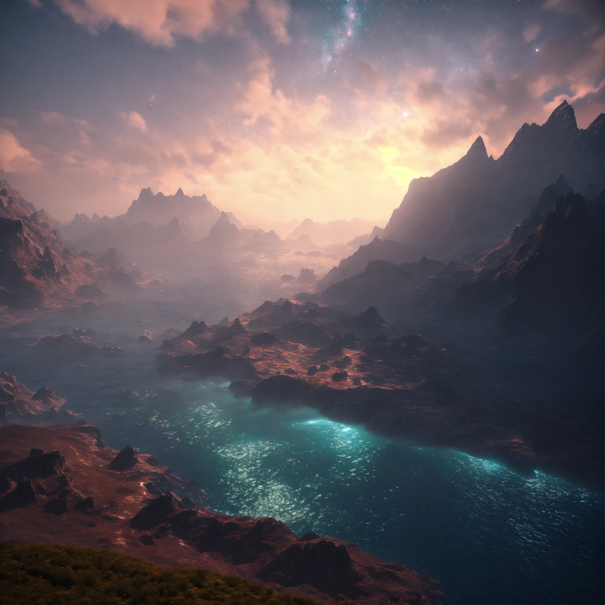 Being reincarnated into a ocean world, sky nebula, artstation scifi 3d scene of a showing mountains, maximalism, ambient occlusion, atmospheric haze, unreal engine, hyper realism, realistic shading, cinematic composition, realistic render, octane render, detailed textures, photorealistic, wide shot