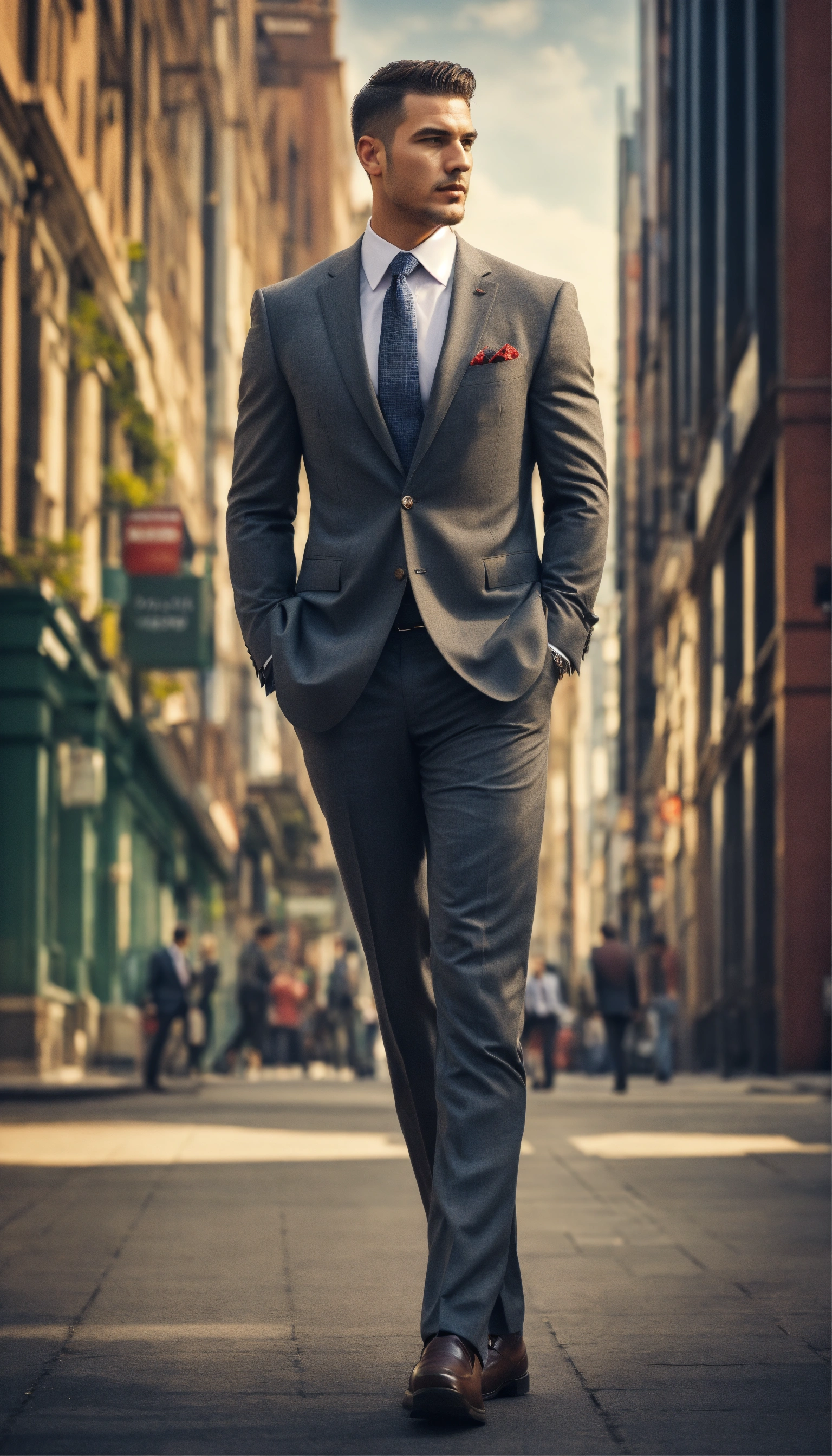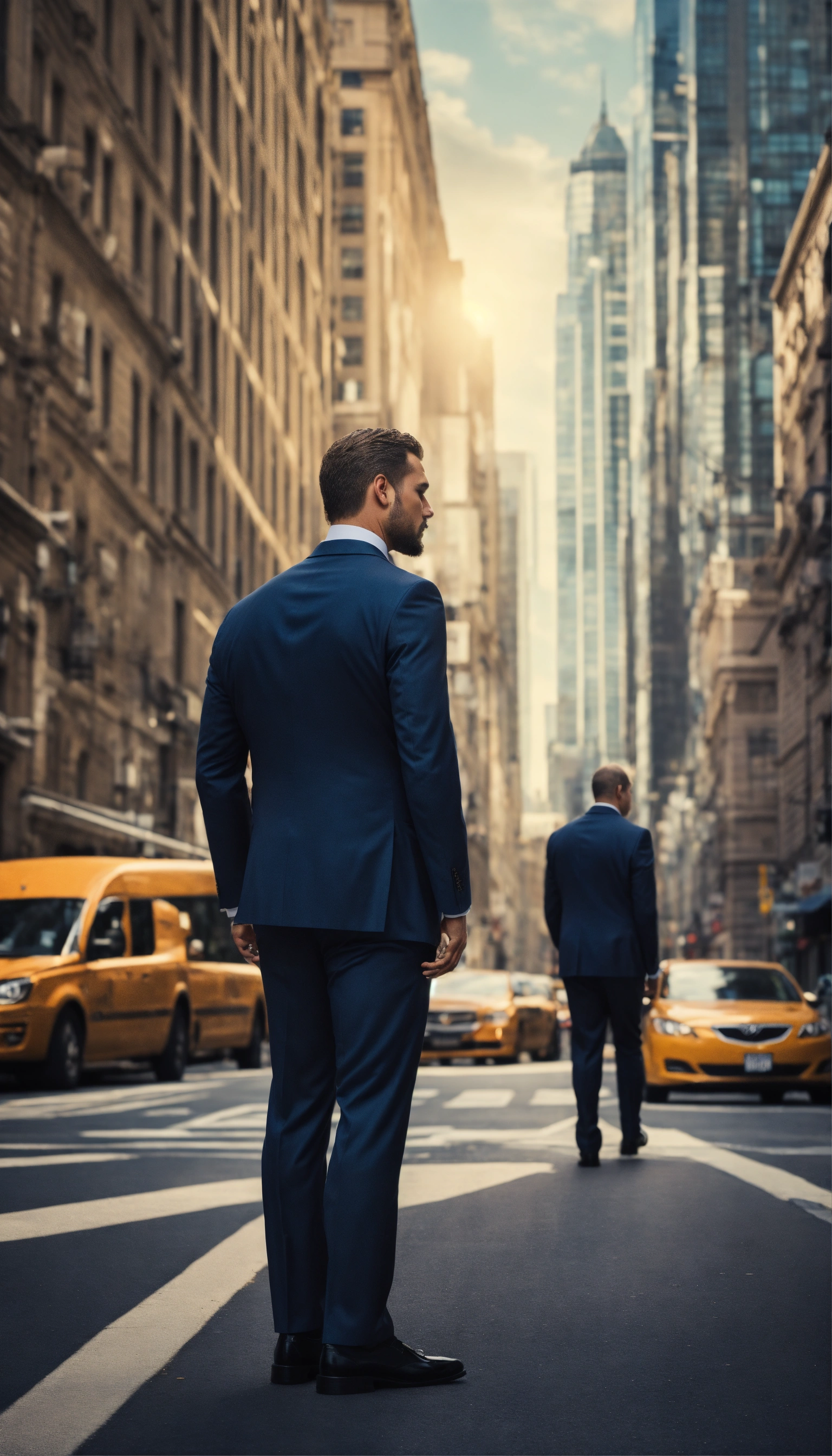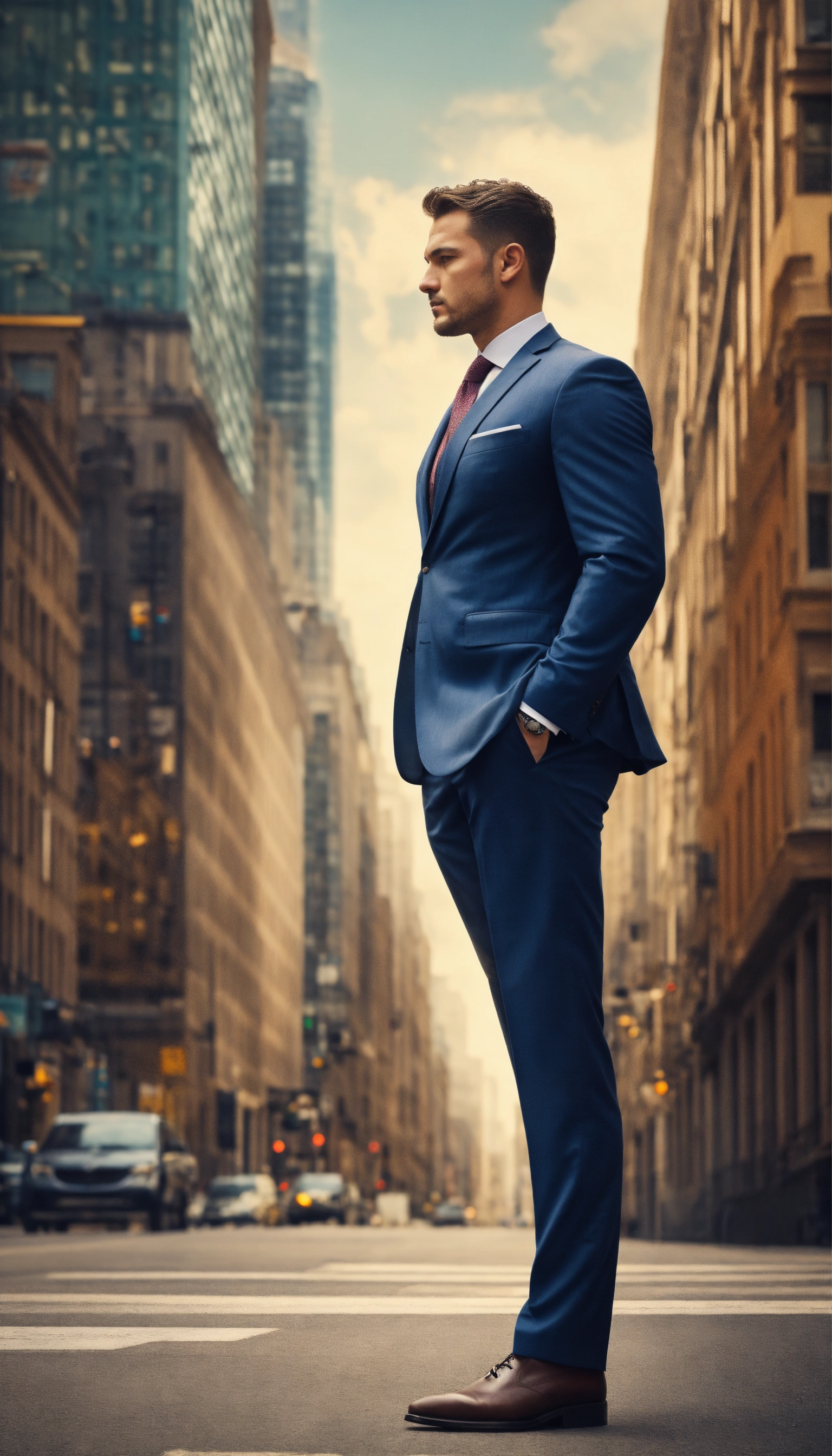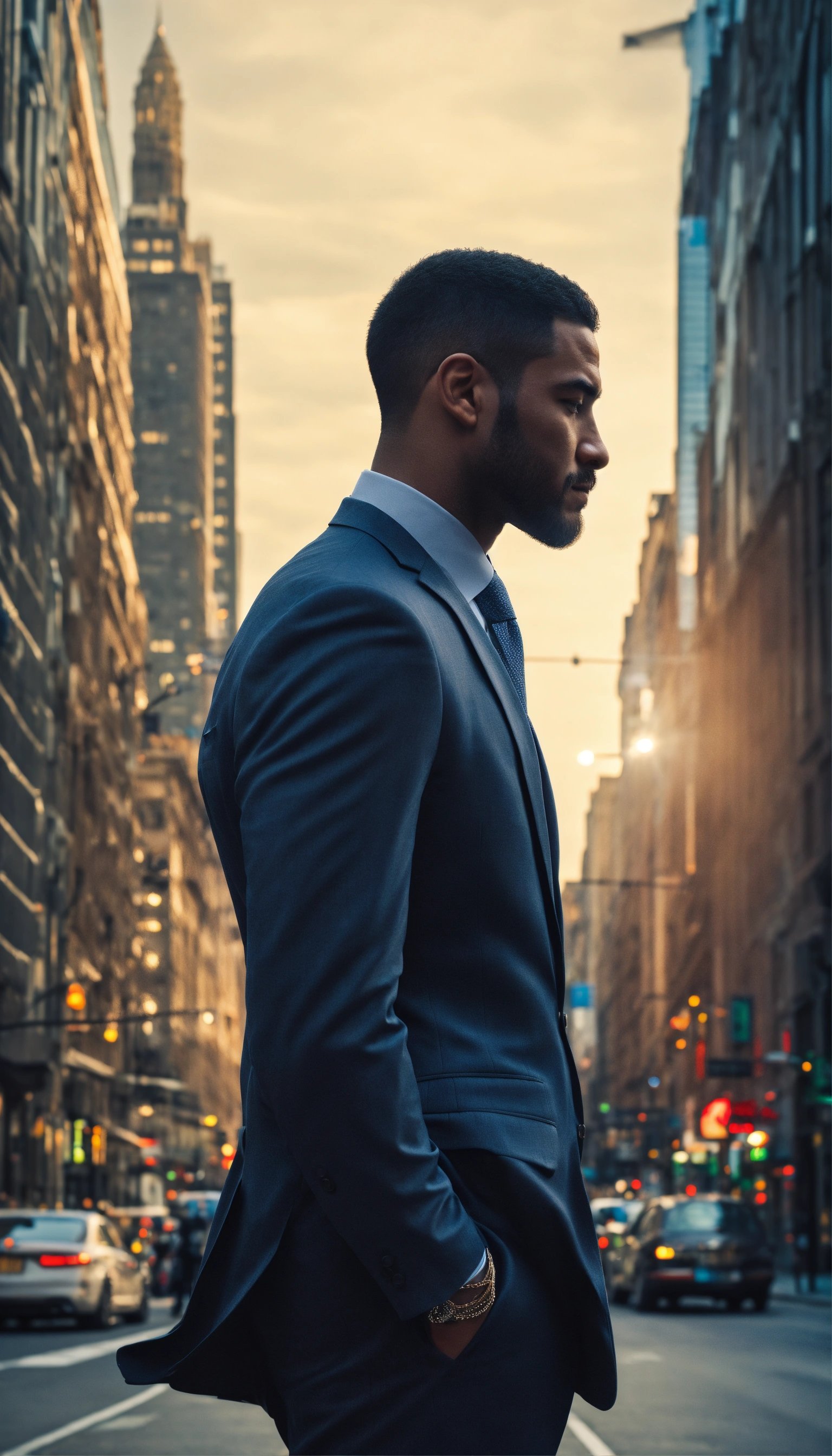 Design a compelling image, tall and strong man, side profile, dressed in a suit, city street, that represents empowerment and self-belief. no text added.