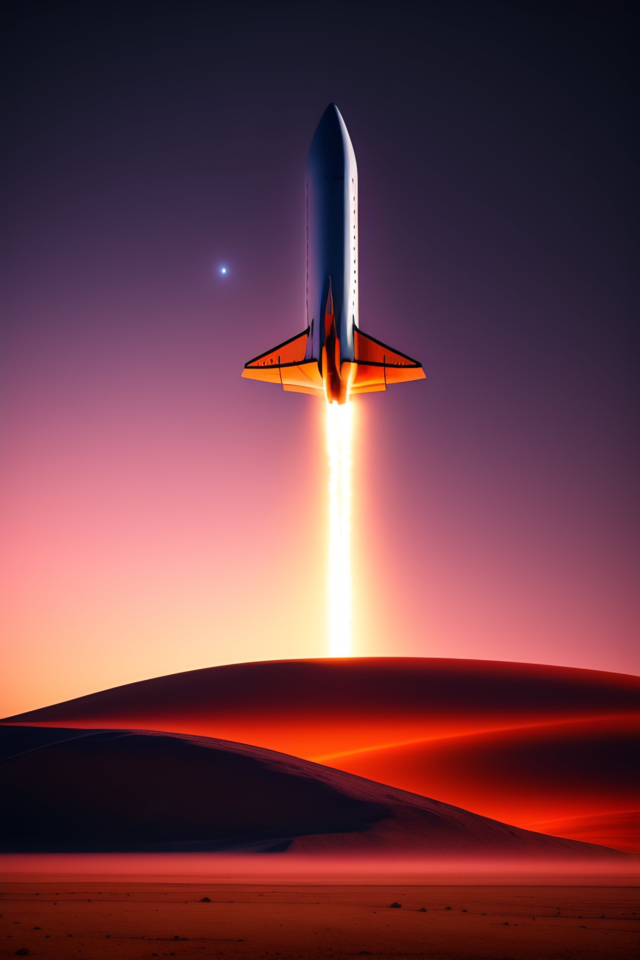50mm photograph of spacex starship designed by braun landed on a mars realistic nighttime landscape, smoke and dust, uhd, 8k, unreal 5 render