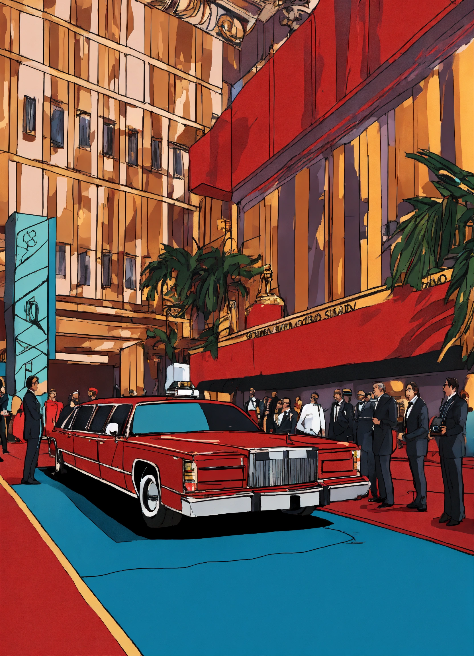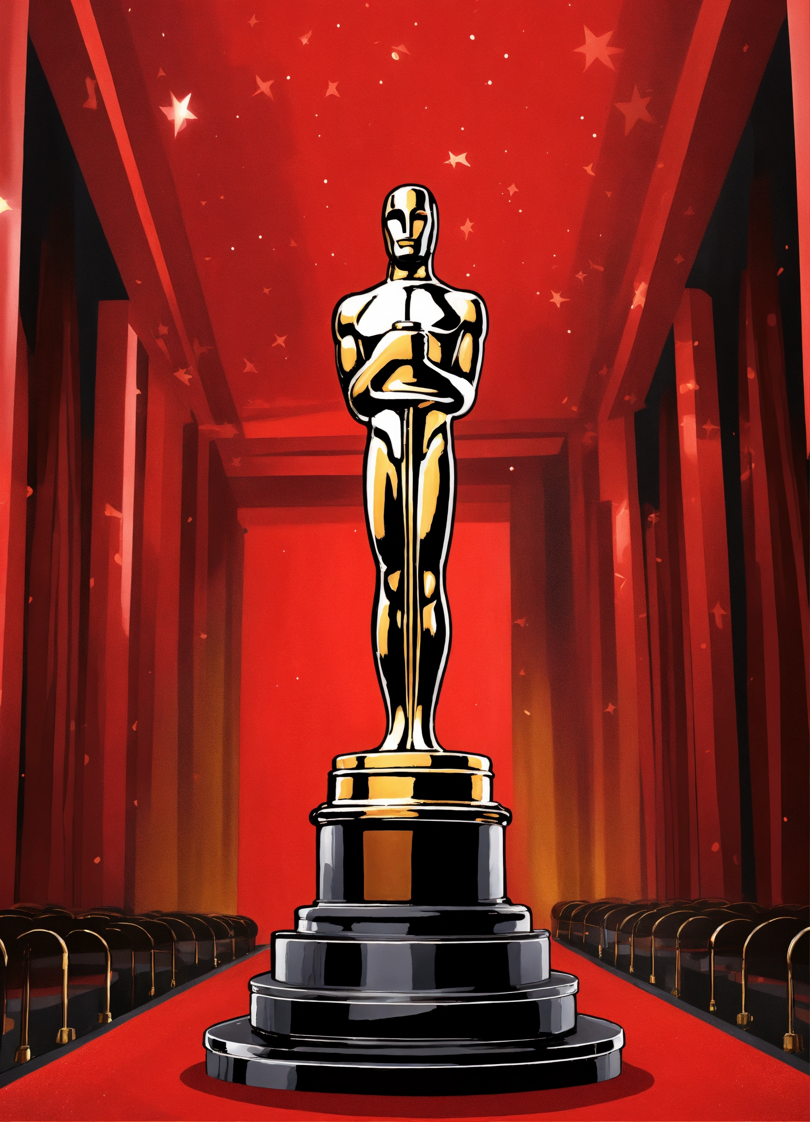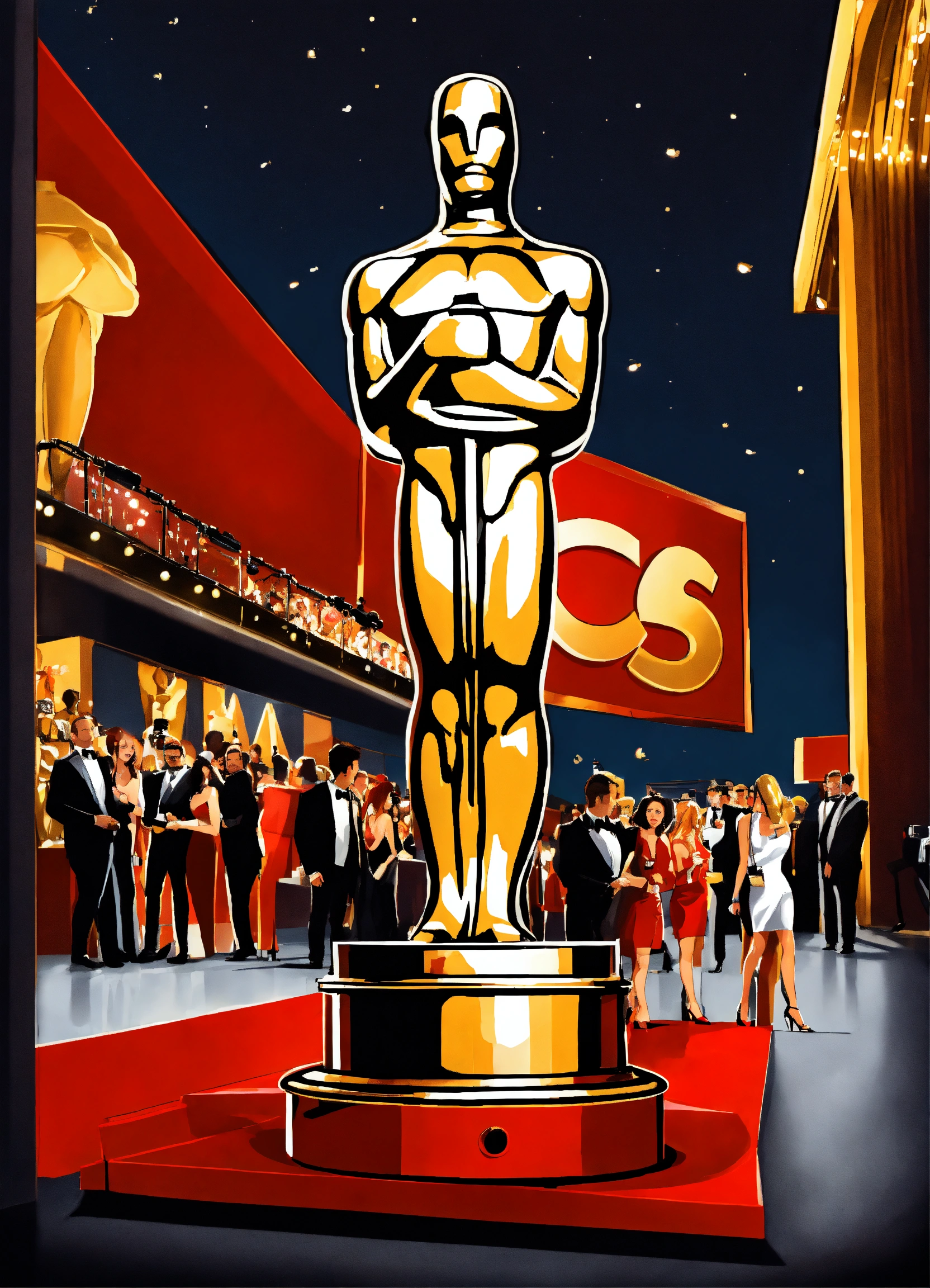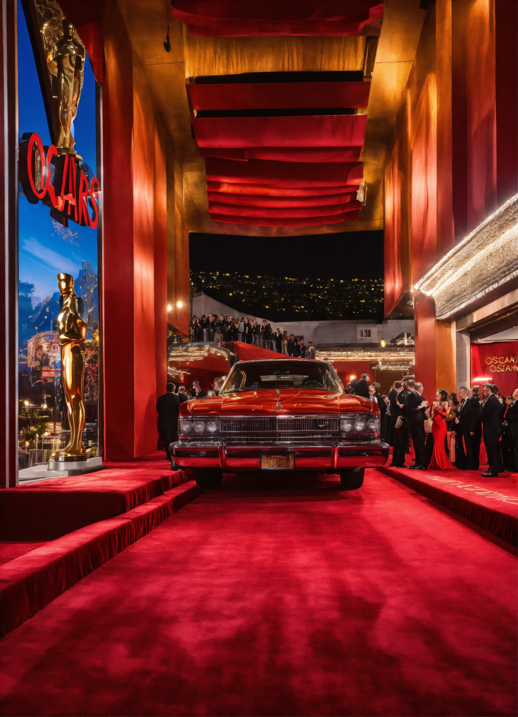 Superrealist style, urban style, hollywood cinema, oscars gala, oscar trophy, red carpet entrance, limousine, cameras, interviews, night, lot of red
