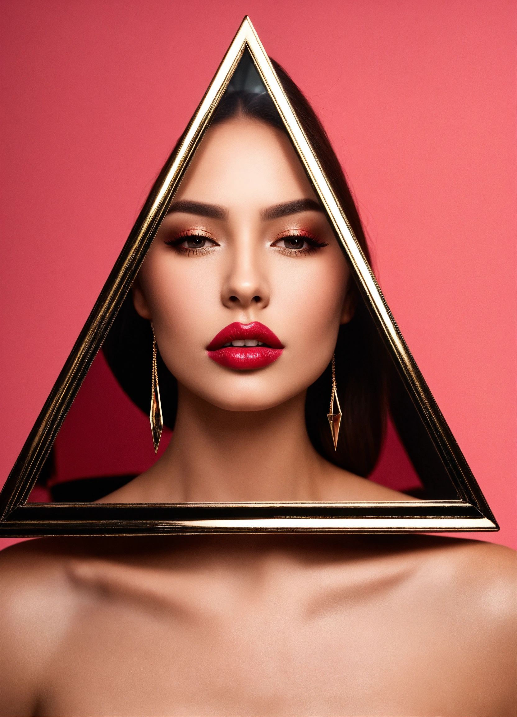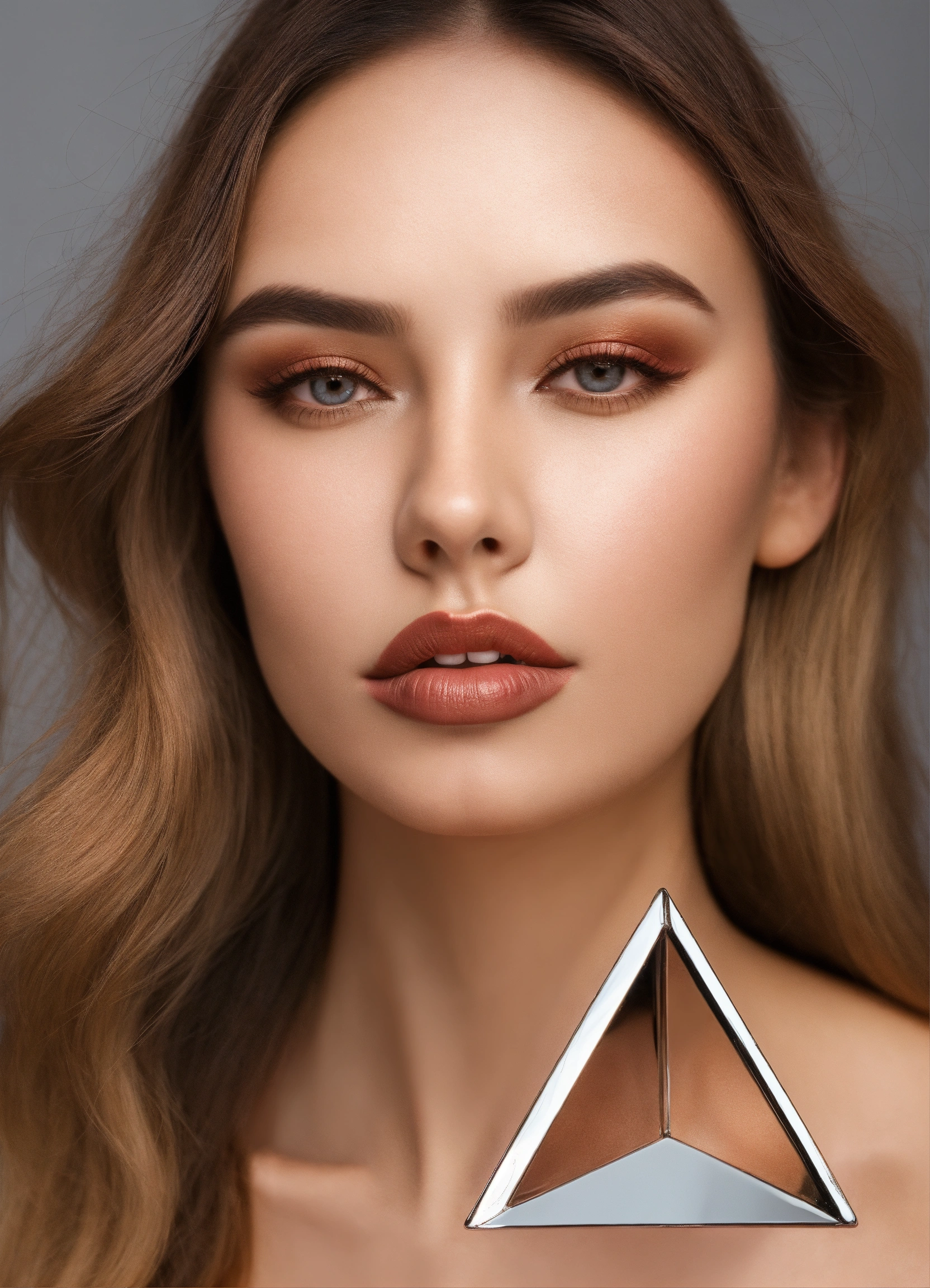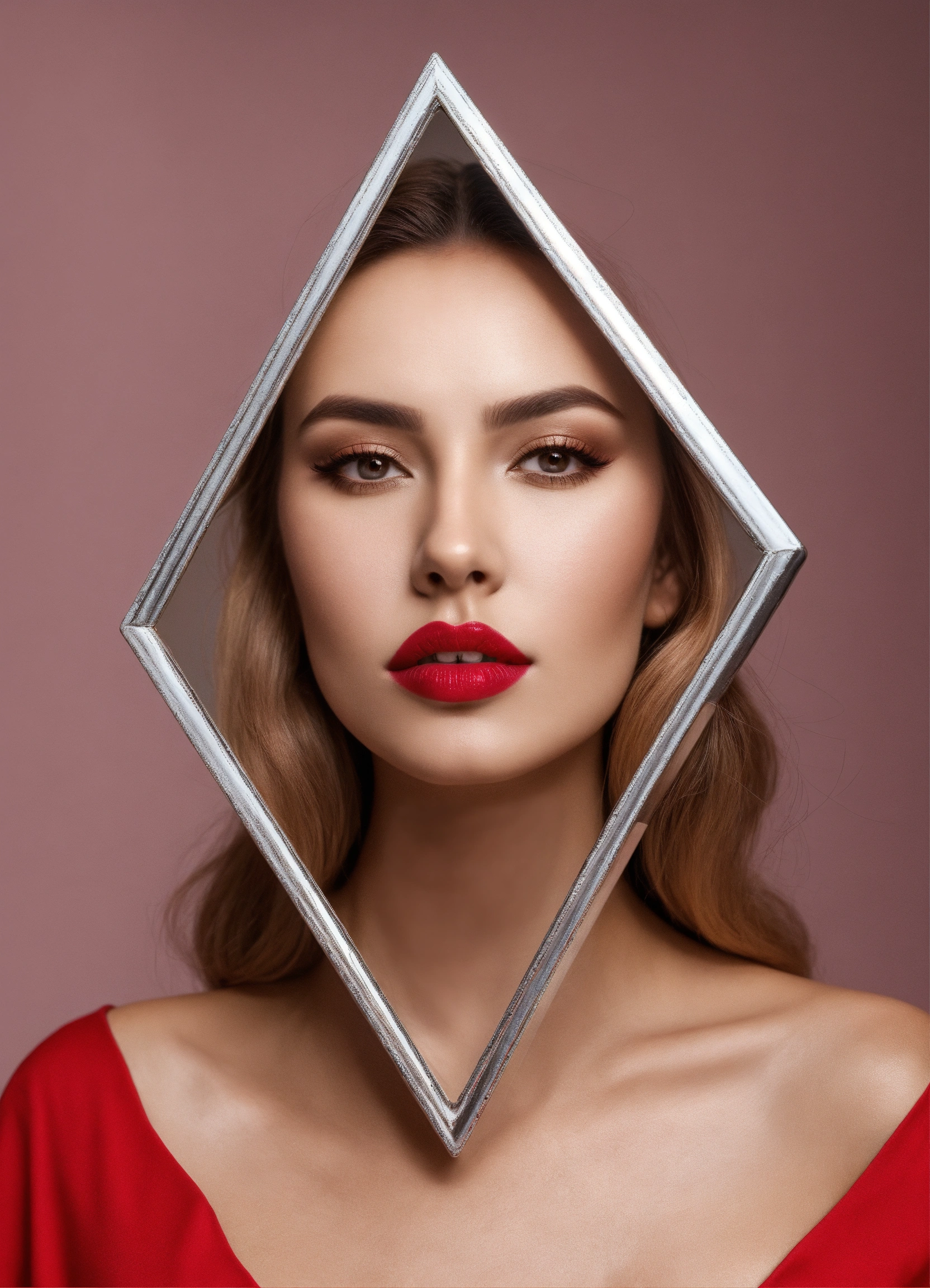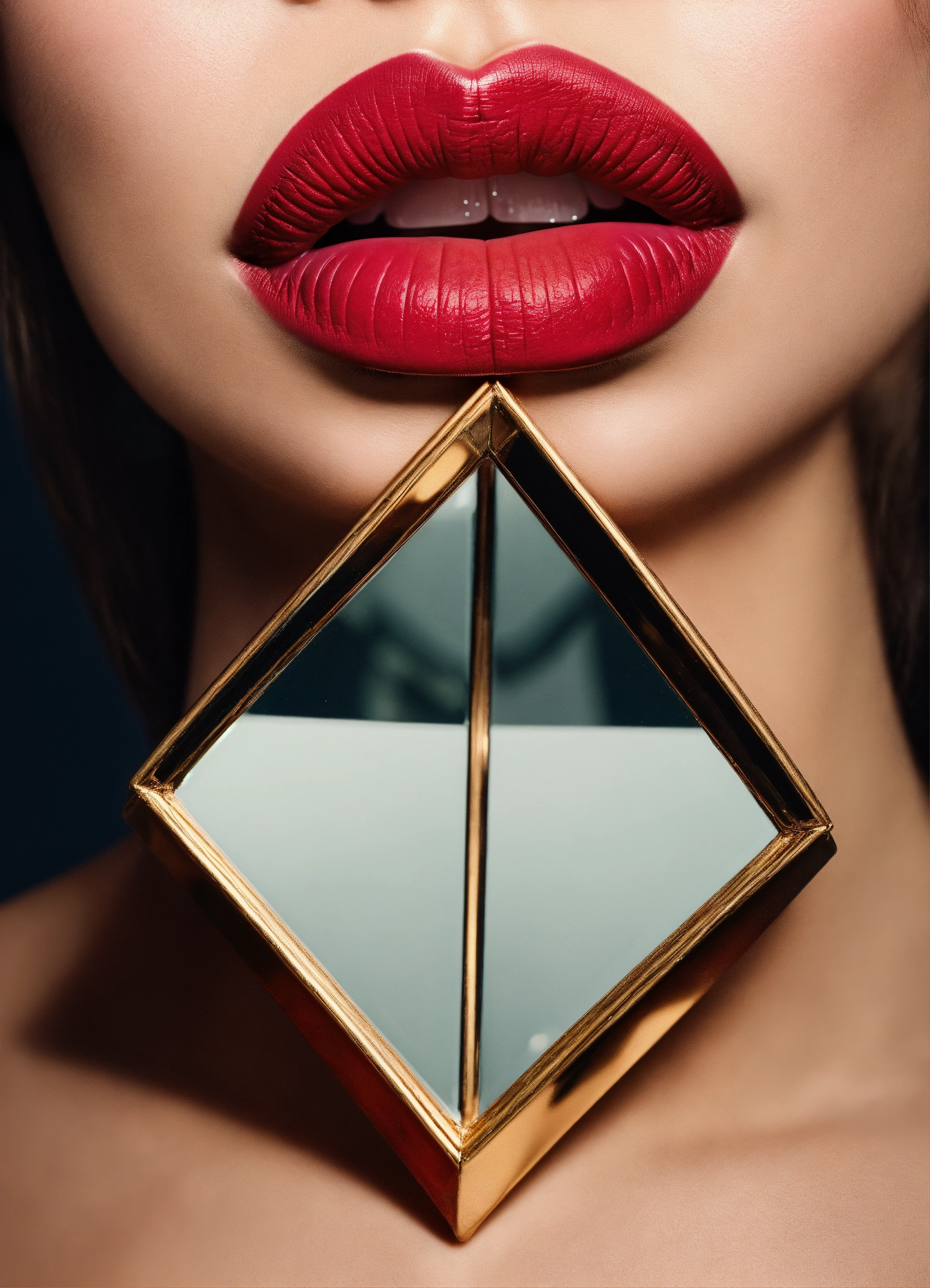 Lips makeup in triangle downwards pointed shaped mirror, beautiful woman with triangle downturned shaped face with large forefront and thin chin