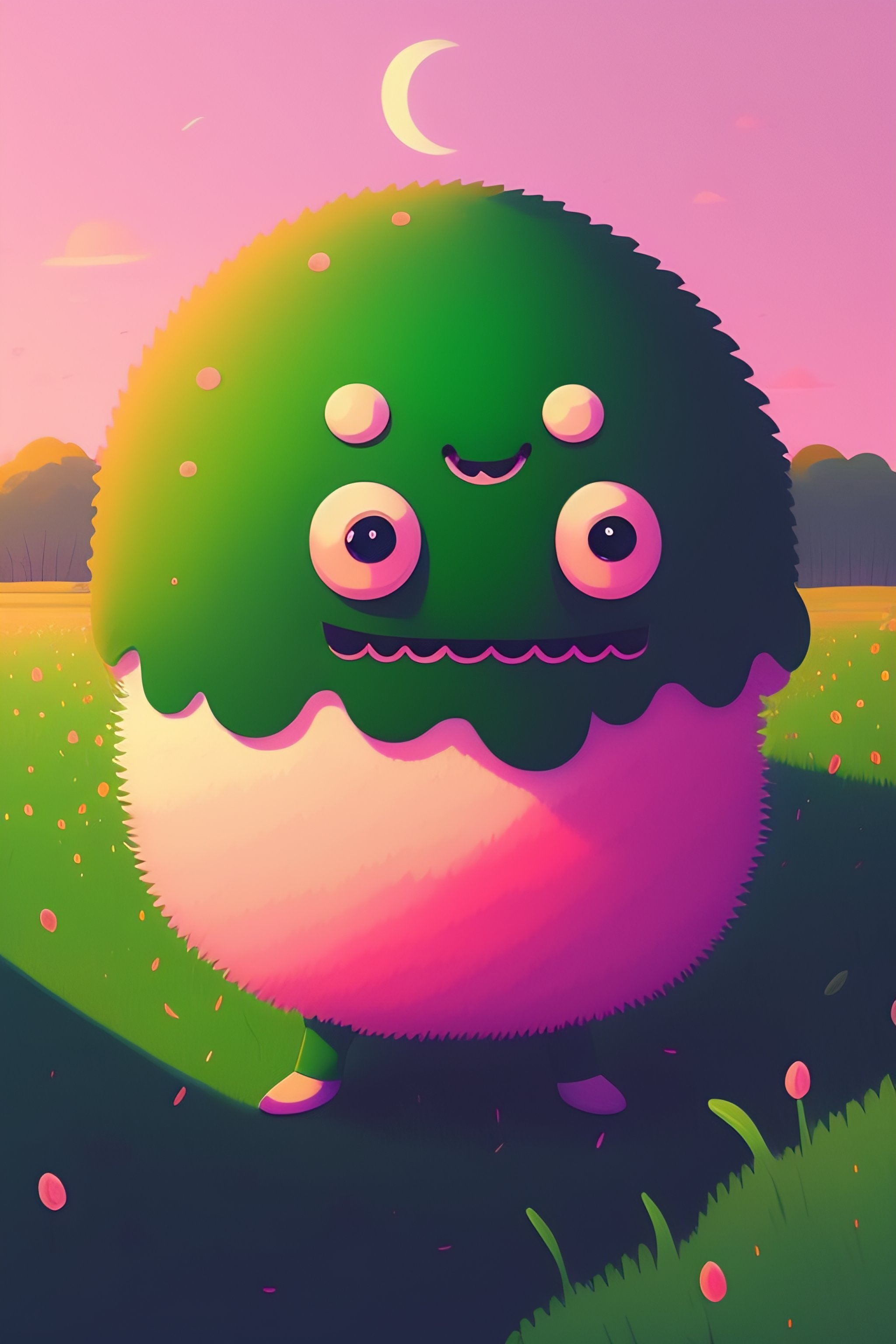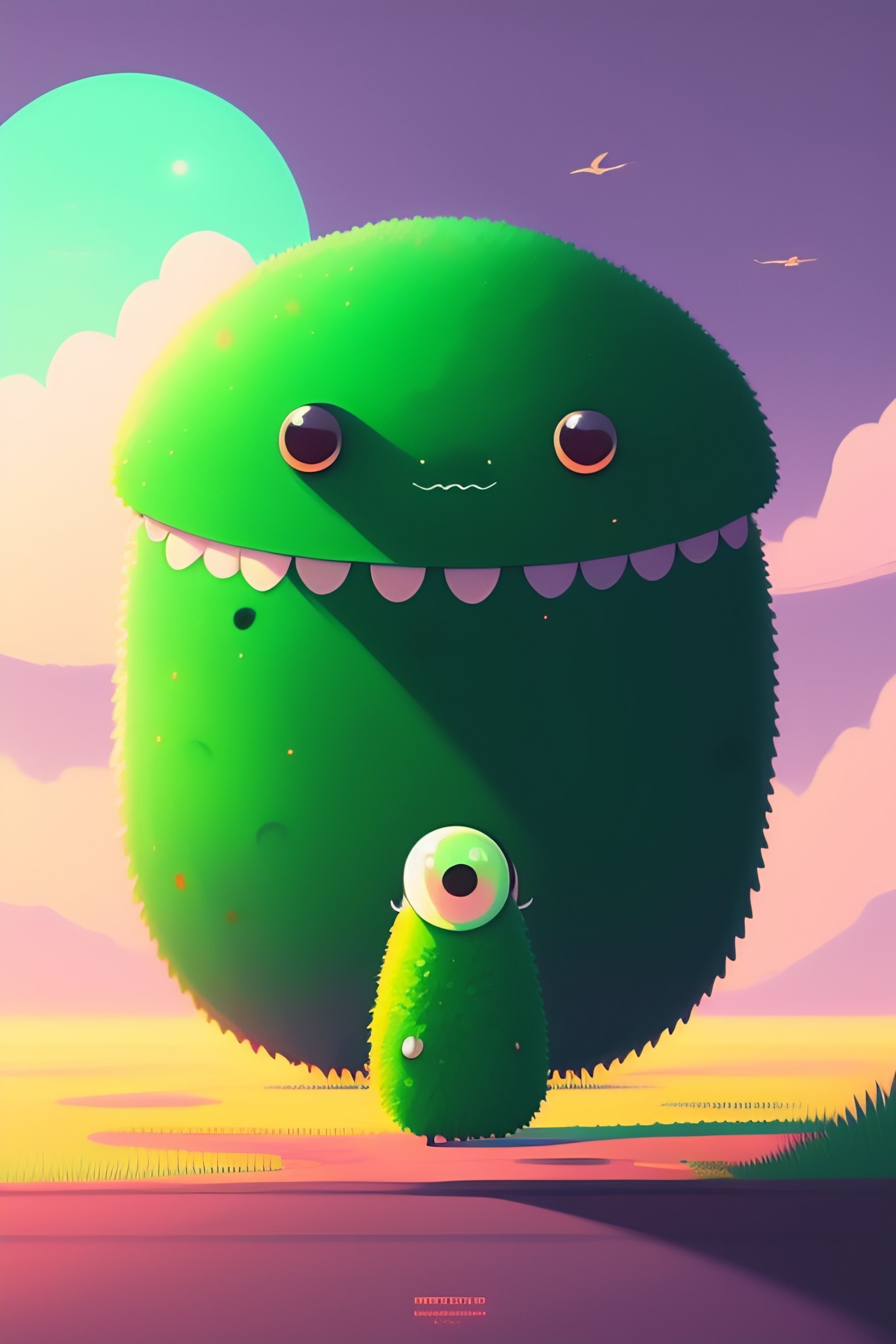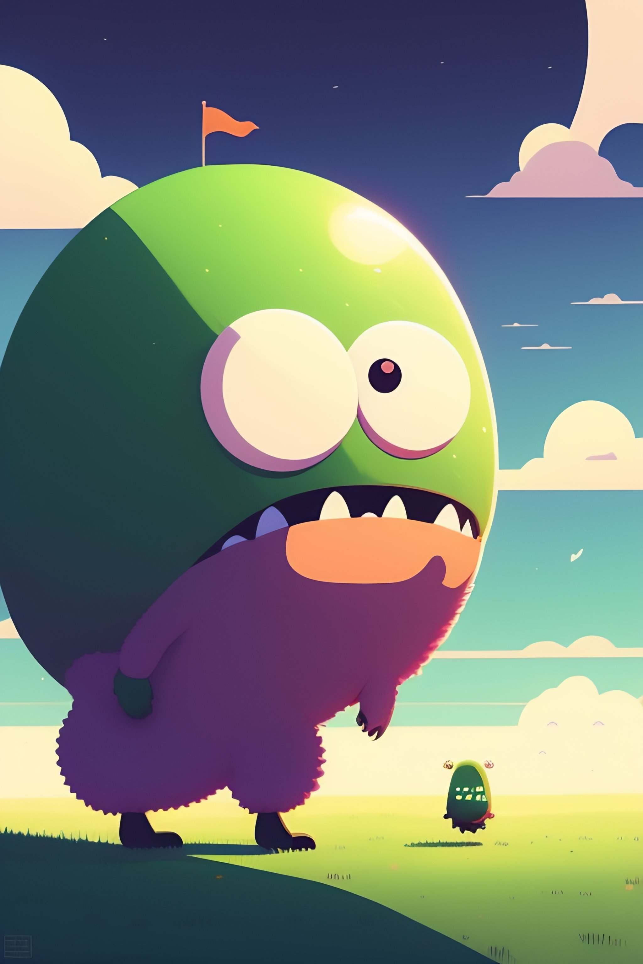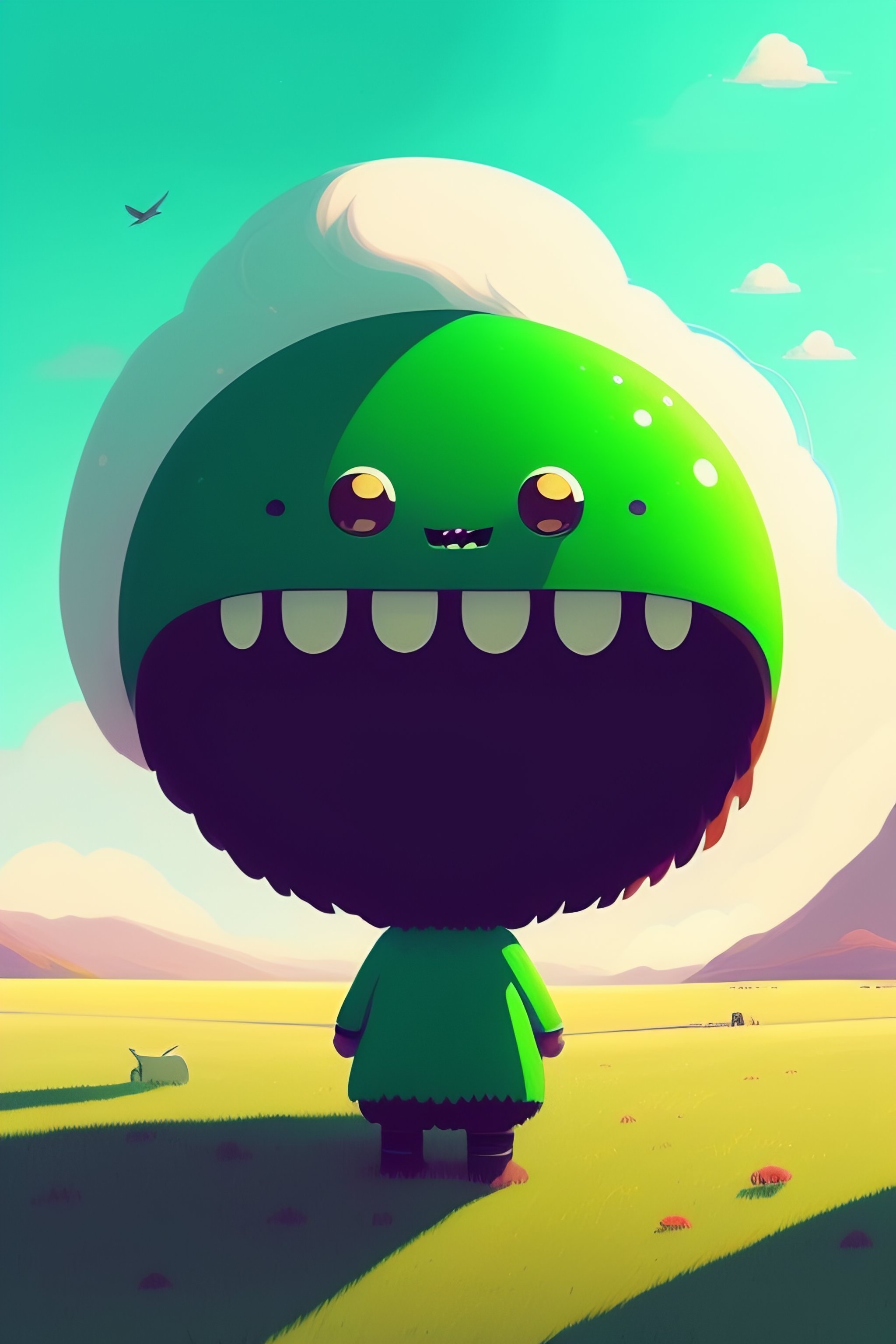 Flat design of a cute green blob-like monster with a pair of googly eyes and a big smile. the monster is standing in a grassy field, with a bright blue sky and fluffy white clouds in the background. the monster has its arms stretched out to either side, as if it is welcoming someone or something. its eyes are closed, as if it is in a state of happy contentment. by atey ghailan, grunge aesthetic!!!