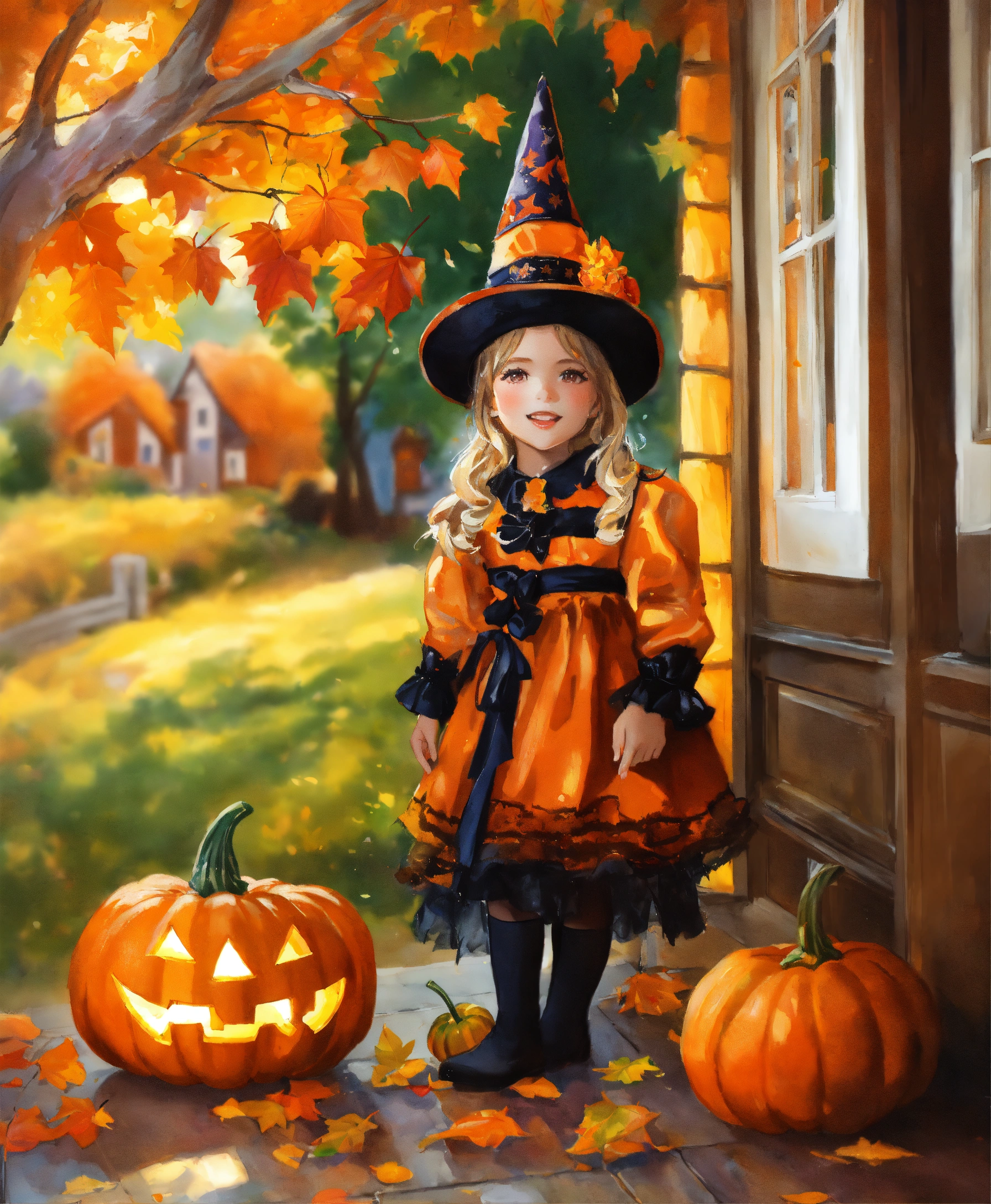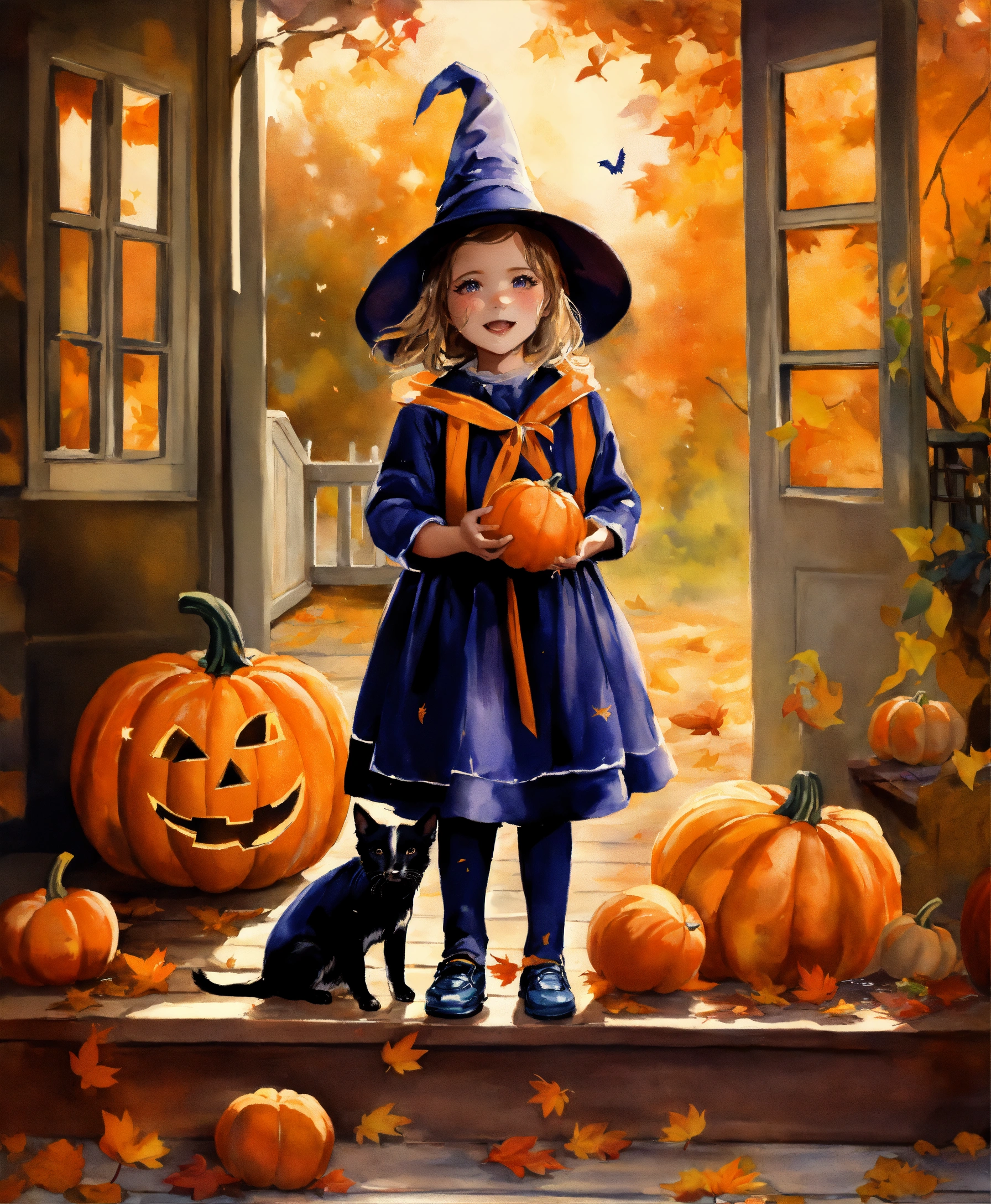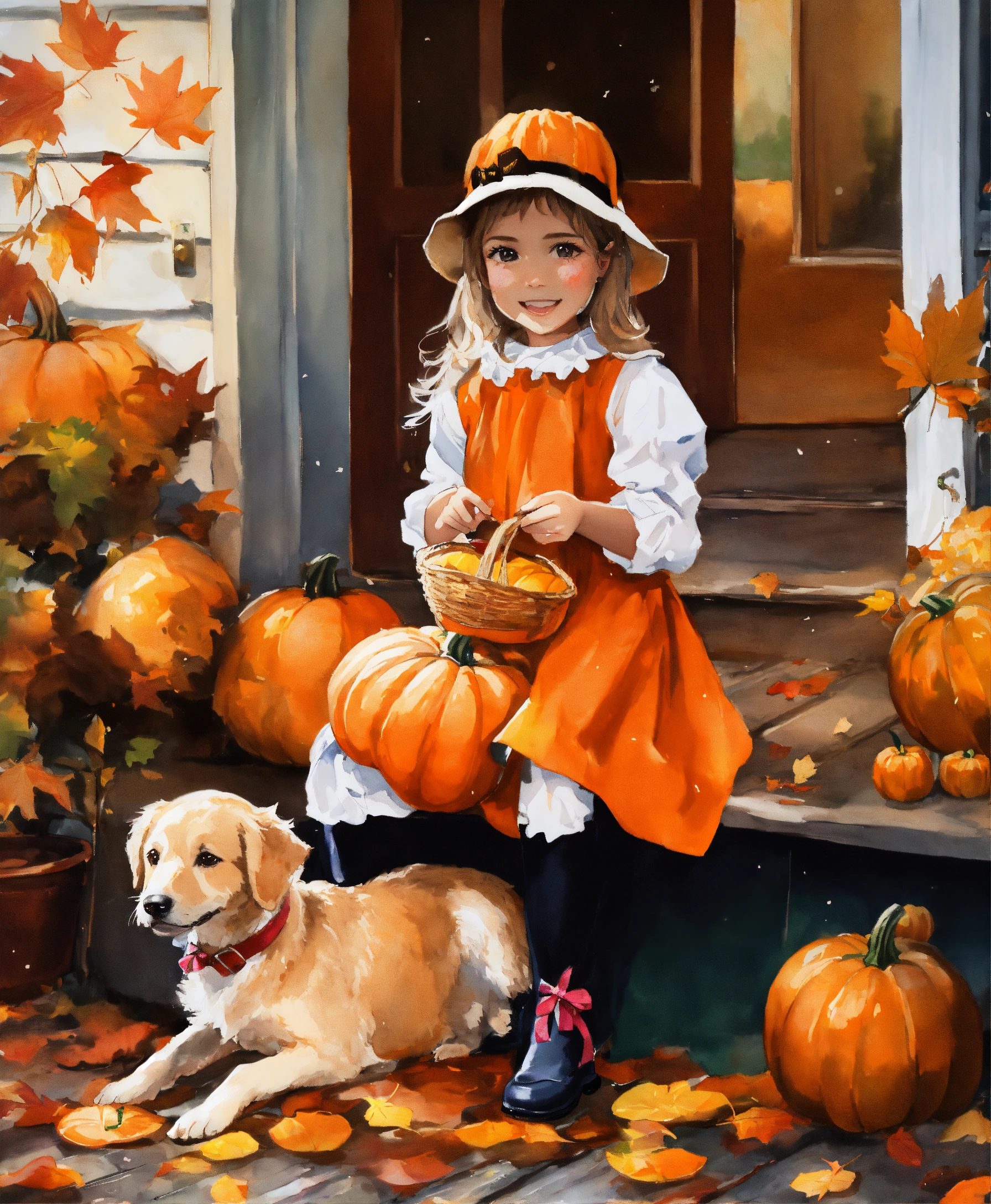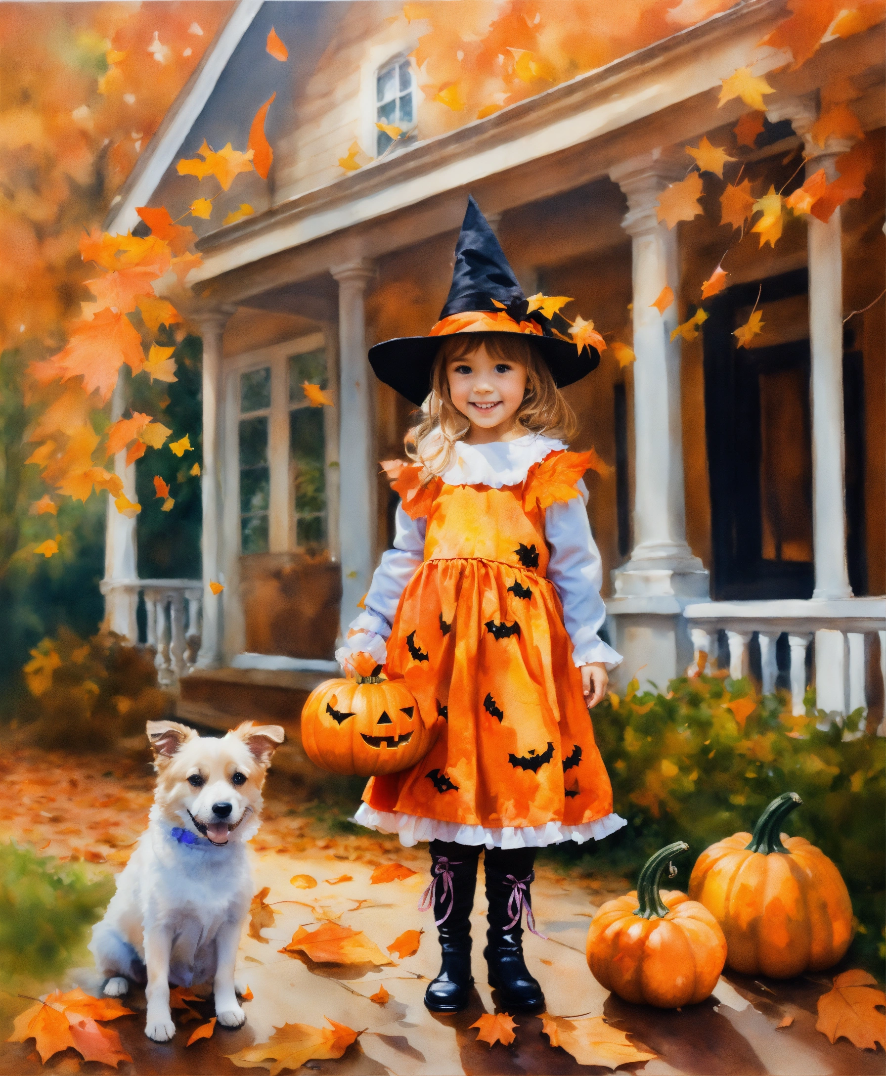 Water painting, beautiful little girl dressed in halloween costume, pumpkins on the porch, leaves falling from the trees, dog playing in the leaves