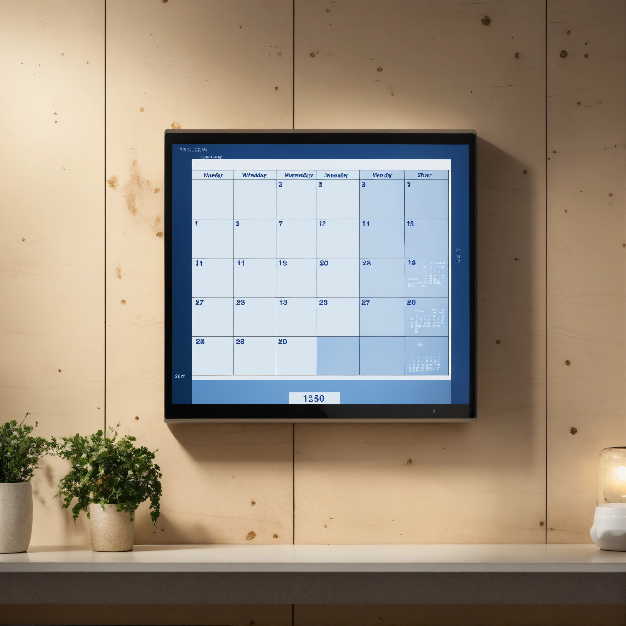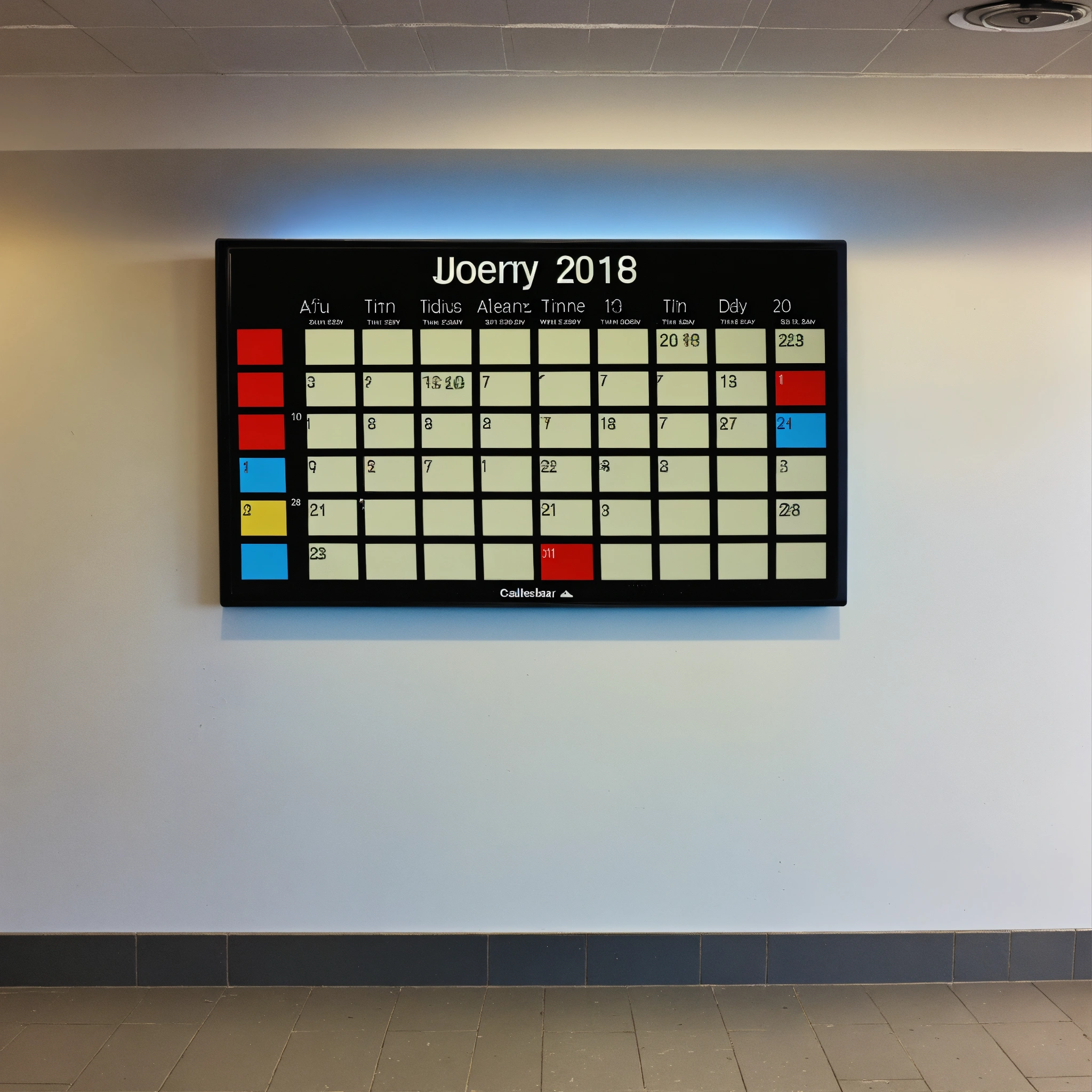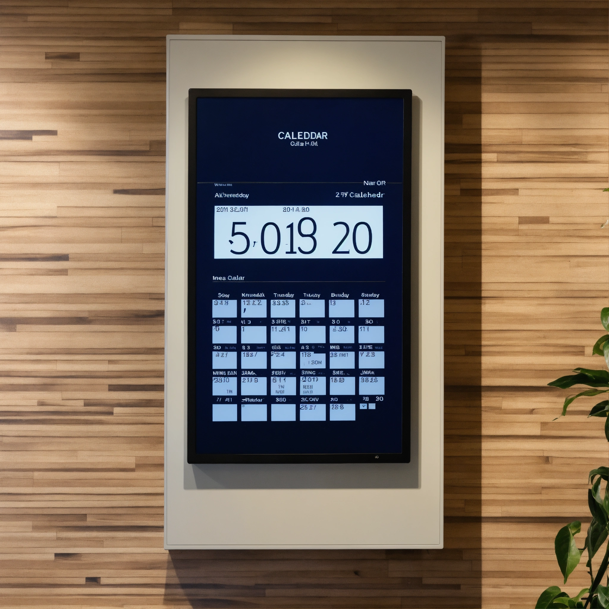 A photo of a digital calendar display, the display is showing the current date and time, the display is mounted on a wall