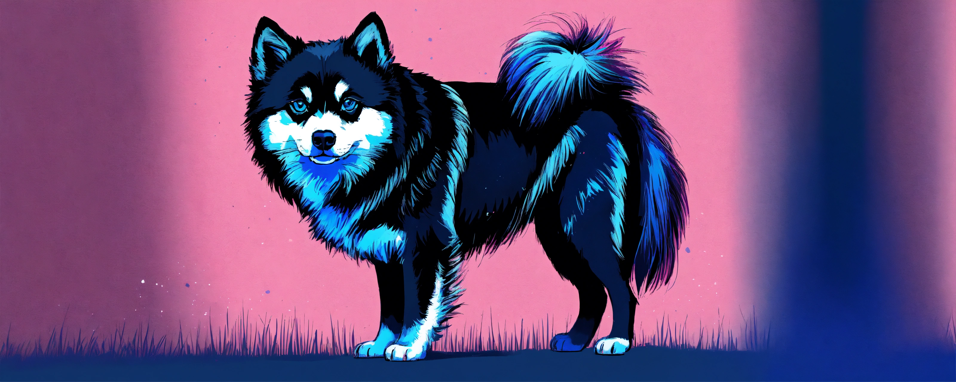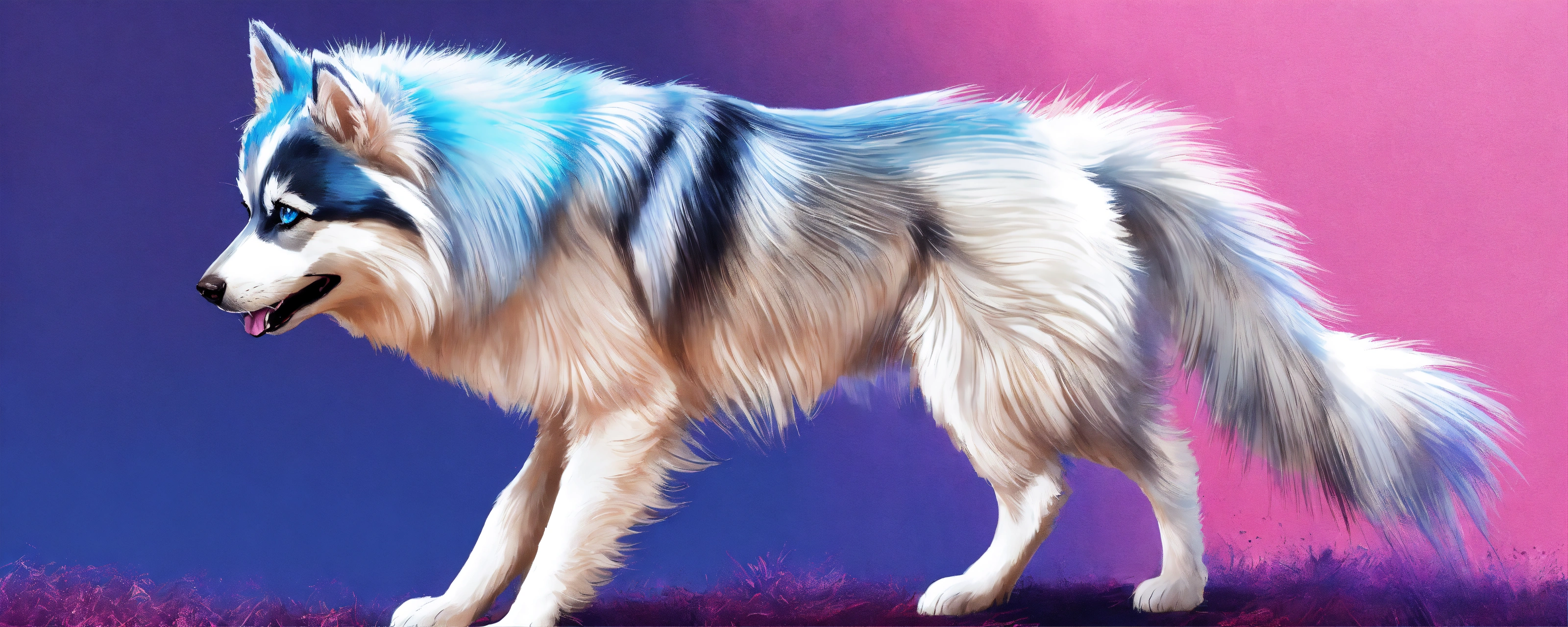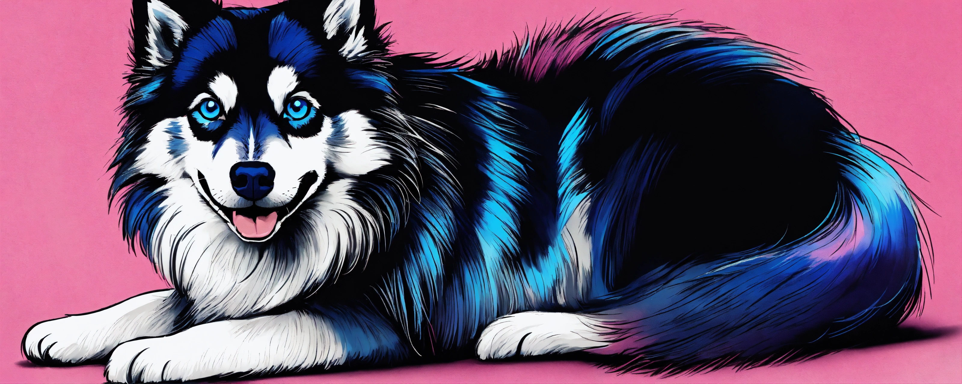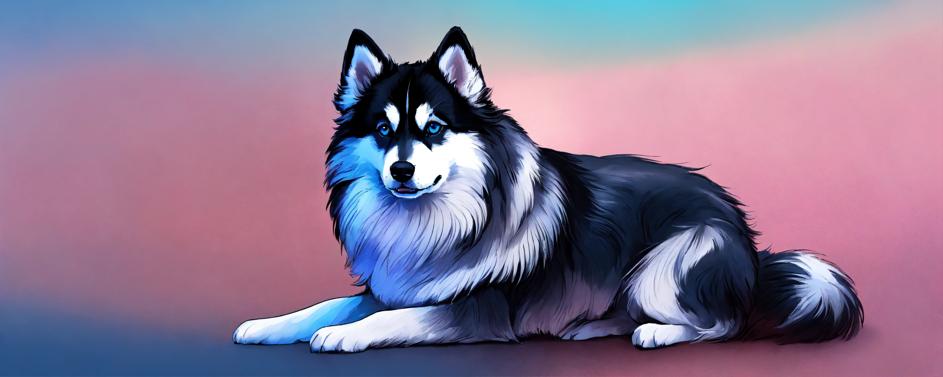A full body image of a pomsky black and white with long hair and blue eyes that digs and buries a bone, very detailed beautiful face, a freedom, soul, digital illustration, approaching perfection, vibrant, highly detailed, artstation, concept art, sharp and smooth focus, blue and pink gradient color background