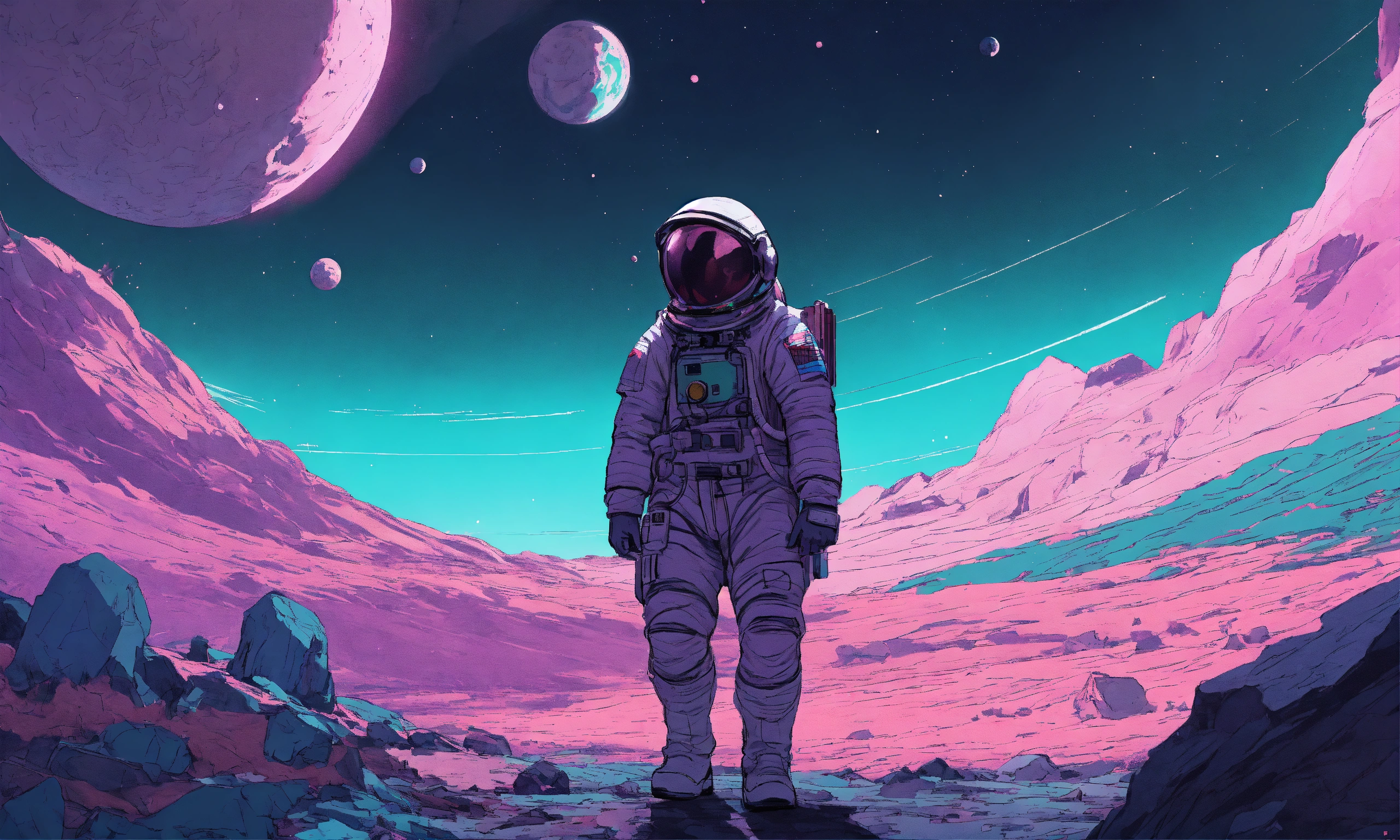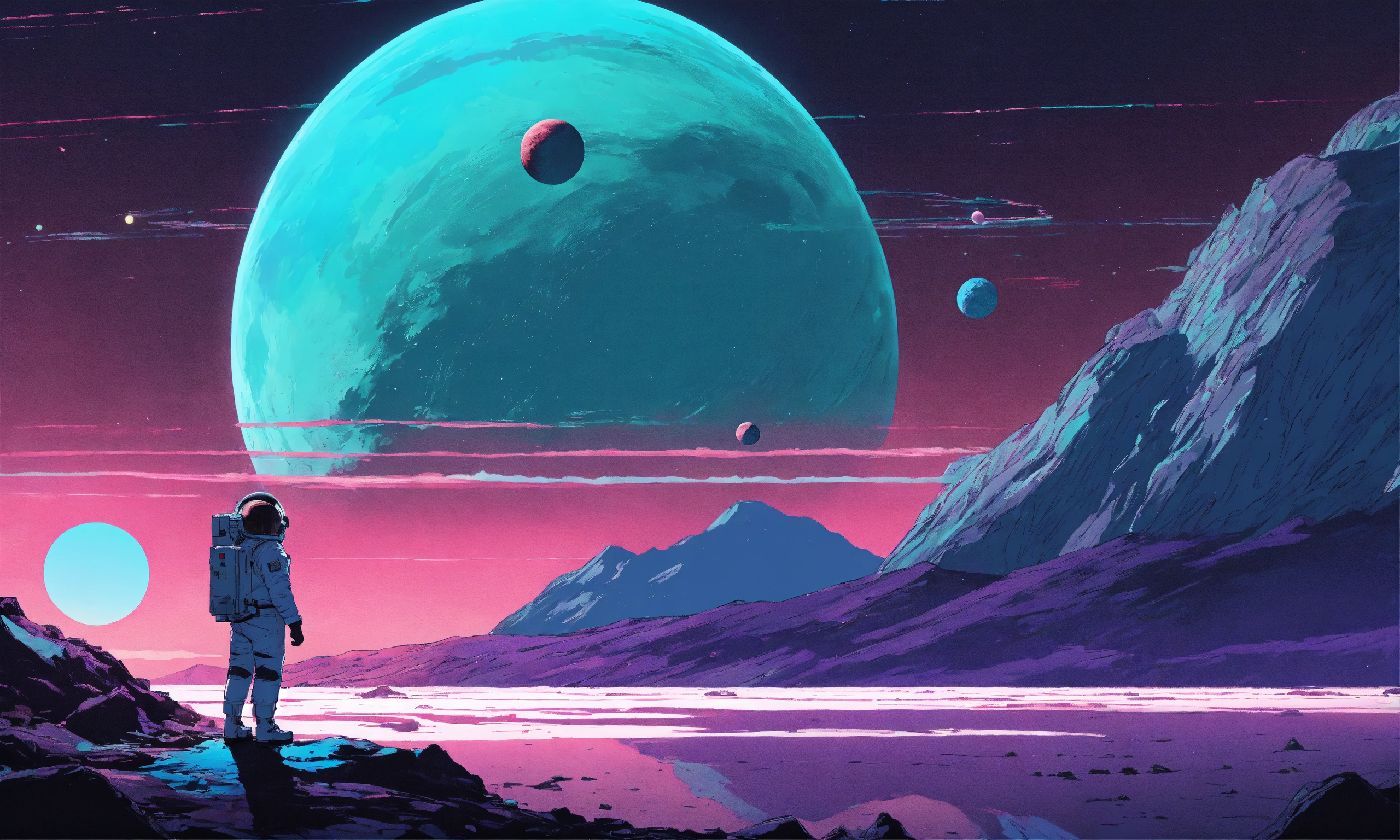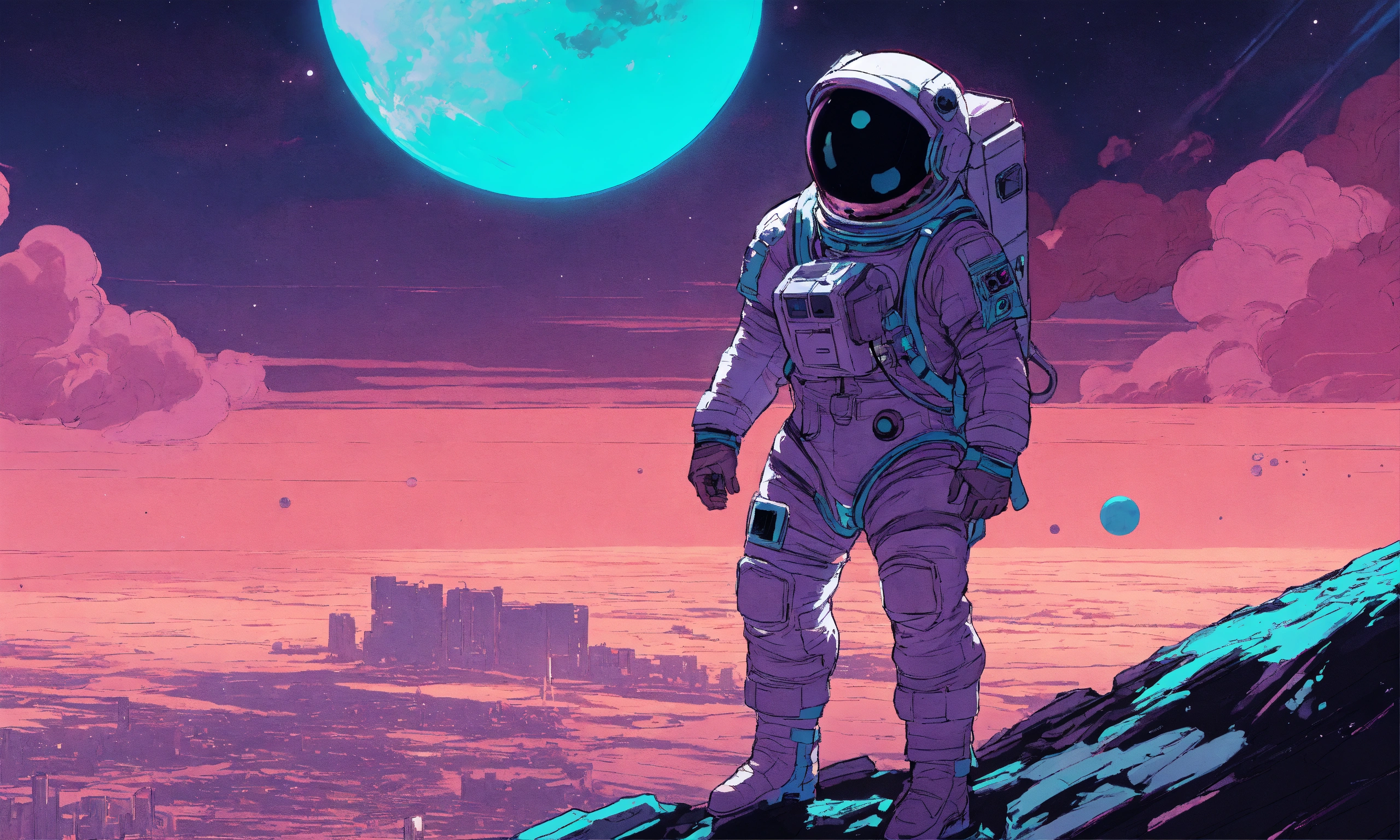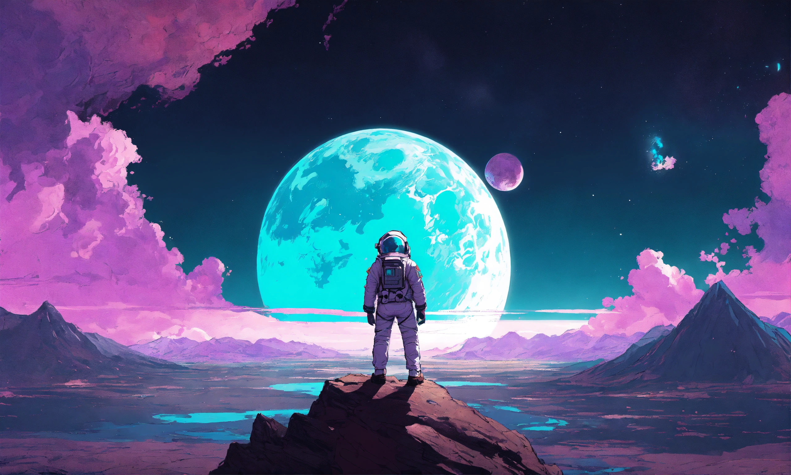 Photo of astronaut looking to the earth, standing on dark moon, black and white planet, purple and cyan colours, style of laurie greasley, studio ghibli, akira toriyama, james gilleard, genshin impact, 4k, low details