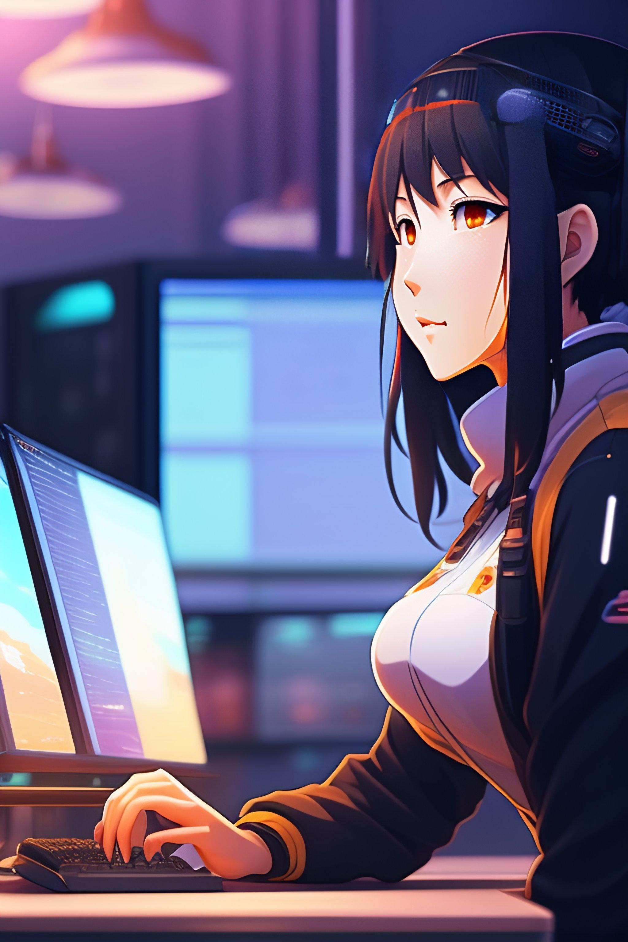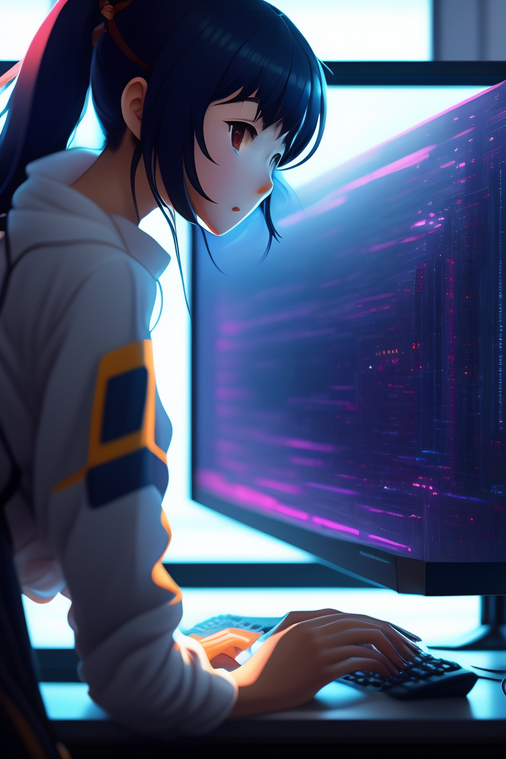 Create a high resolution artwork of anime girl is programming at a computer in a room full of gadgets, web developer, by makoto shinkai and ghibli studio, outlined silhouettes, dramatic lighting, highly detailed, incredible quality, trending on artstation, masterpiece, 8k