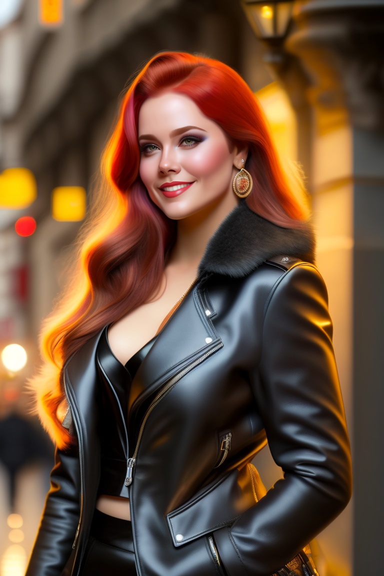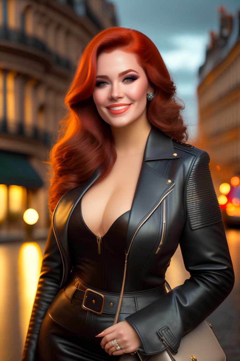 Beautiful redhead woman, long straight hair, smiling, curvy, fullbody, mini skirt, stockings, waders, leather jacket, low-cut, in the street of paris, paved street with street lamps, winter's night, handbag, around 45, juste a little chubby, listens to heavy metal