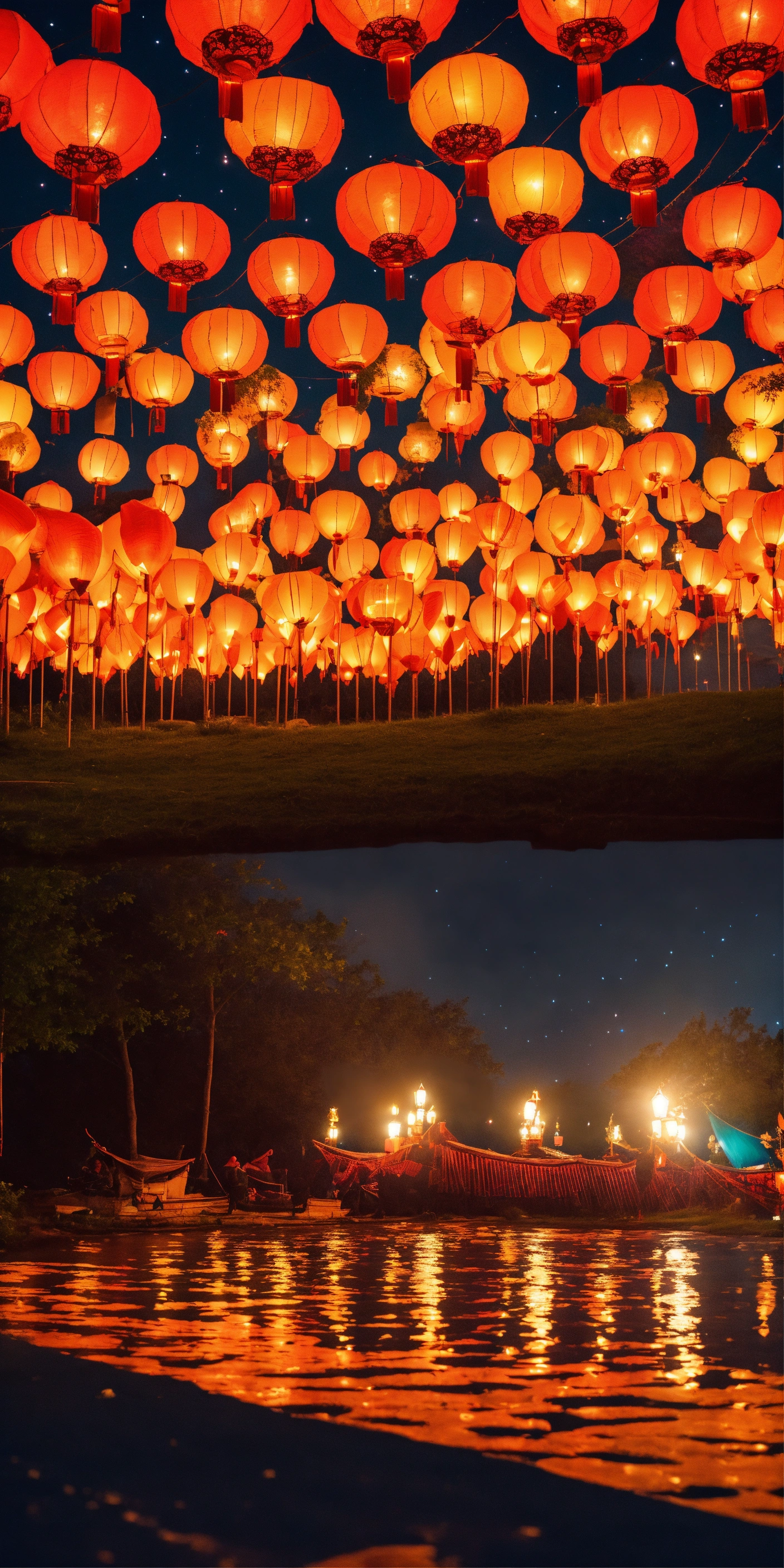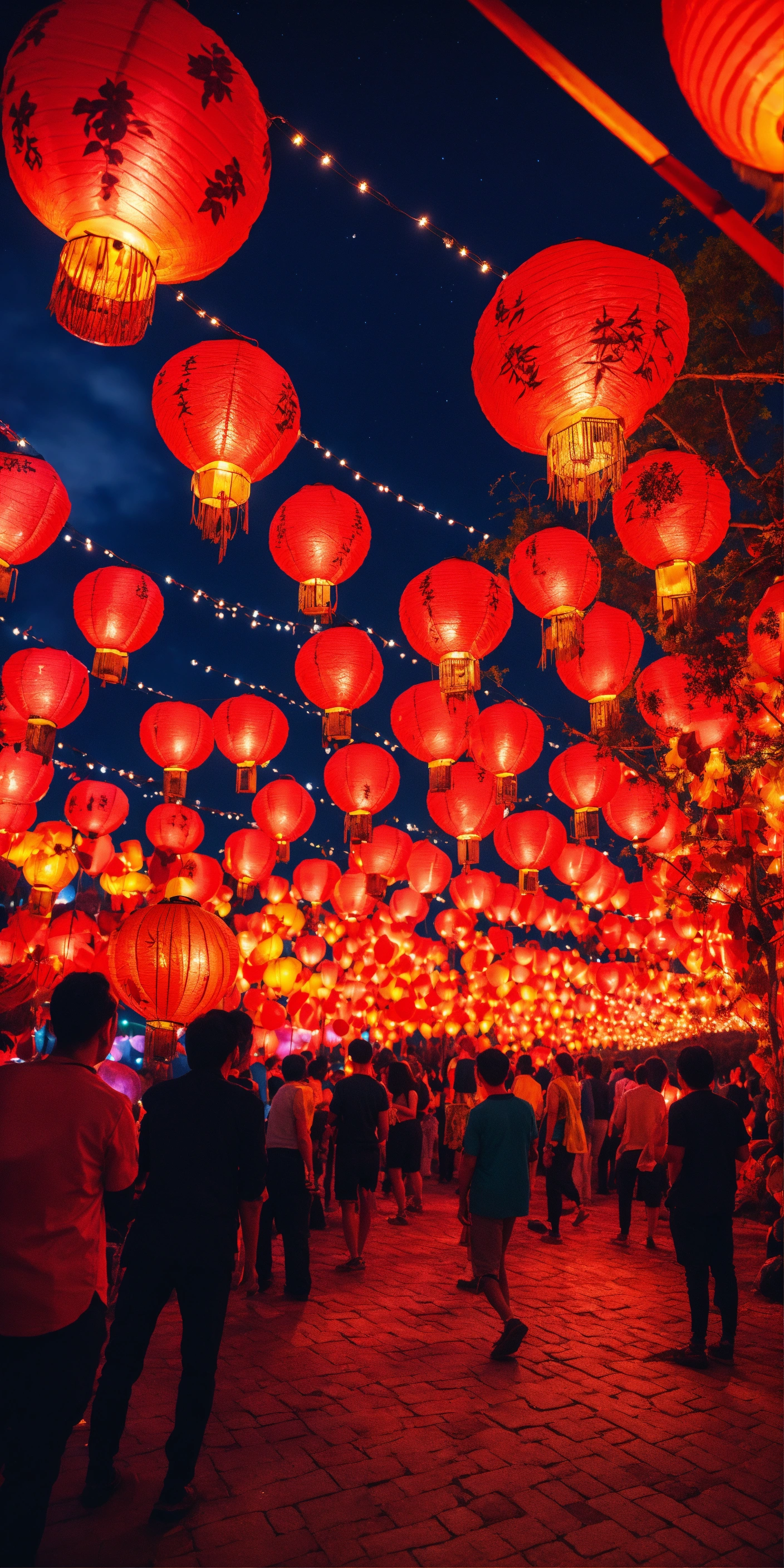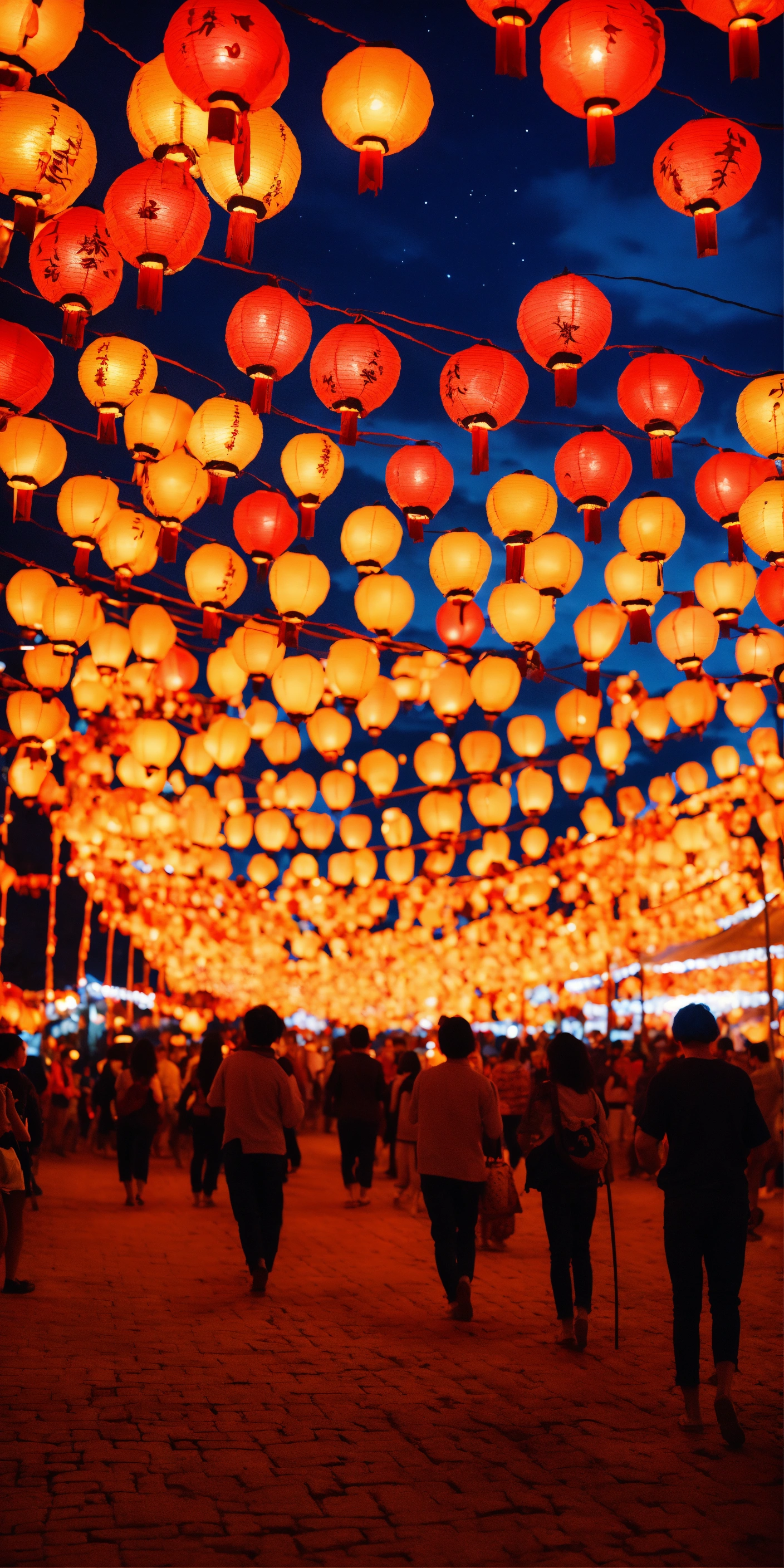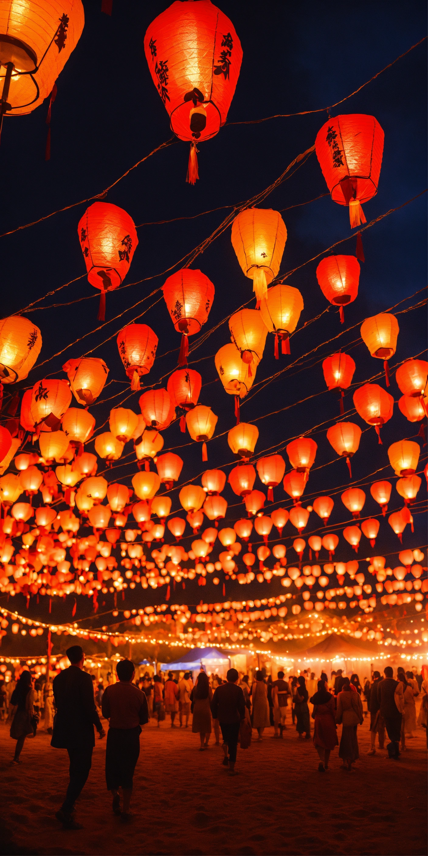 A festival with brightly lit lanterns under the night sky. a vast space, authentic and sharp imagery, in 4k quality