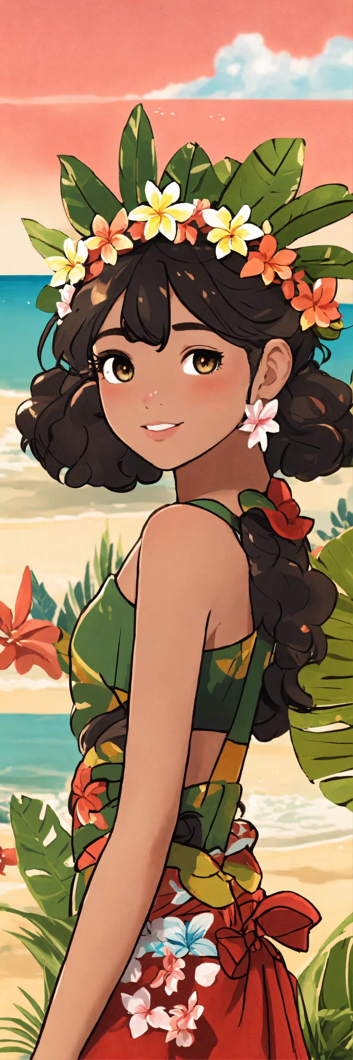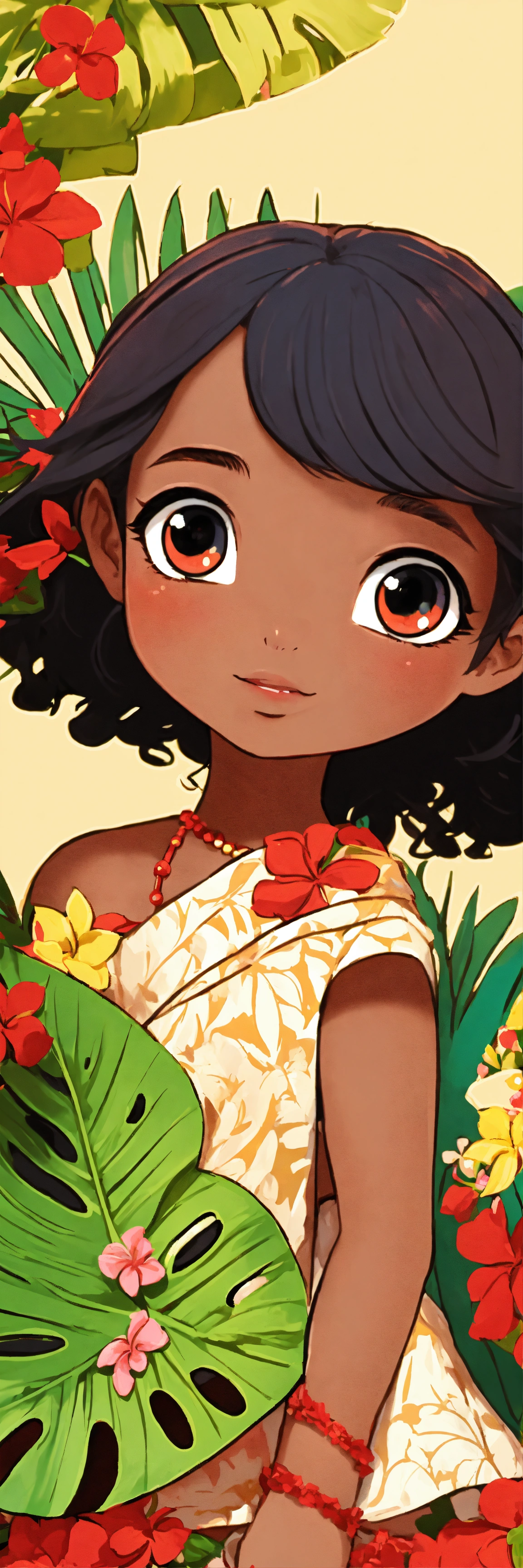 Illustration of three girls, little girls wearing a plumeria headdress on their head, red tube tops and leaf skirts, they are wearing a skirt made of leaves, a mischievous look, the background is hawaii sea, black hair, 4k, 8k, asian beauty, moani, die-cut sticker