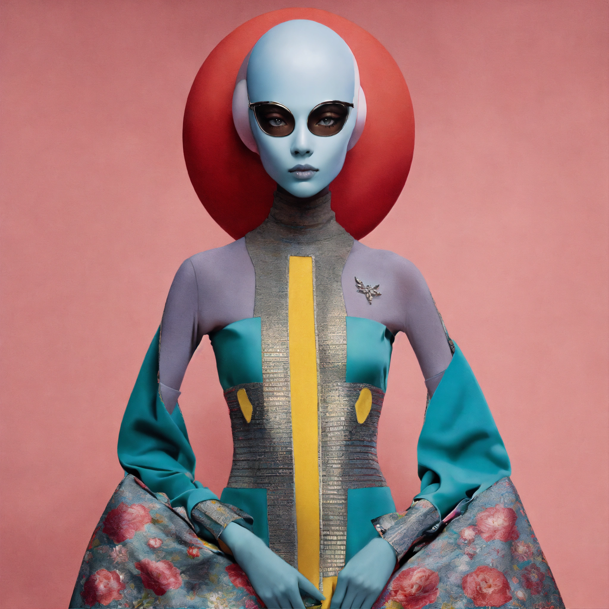 A photograph of a grey alien supermodel on the cover of vogue