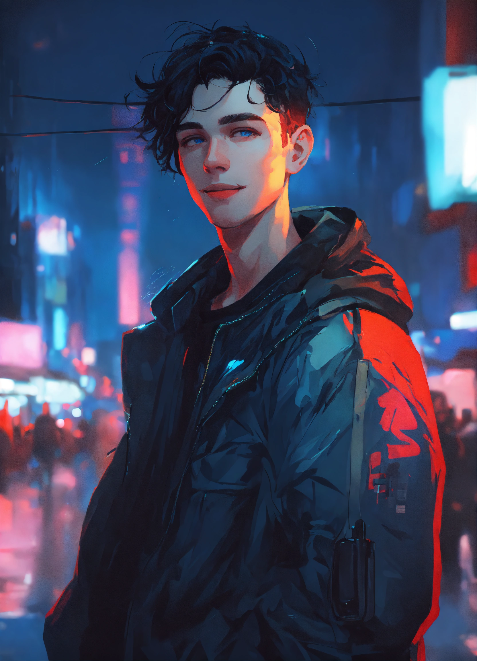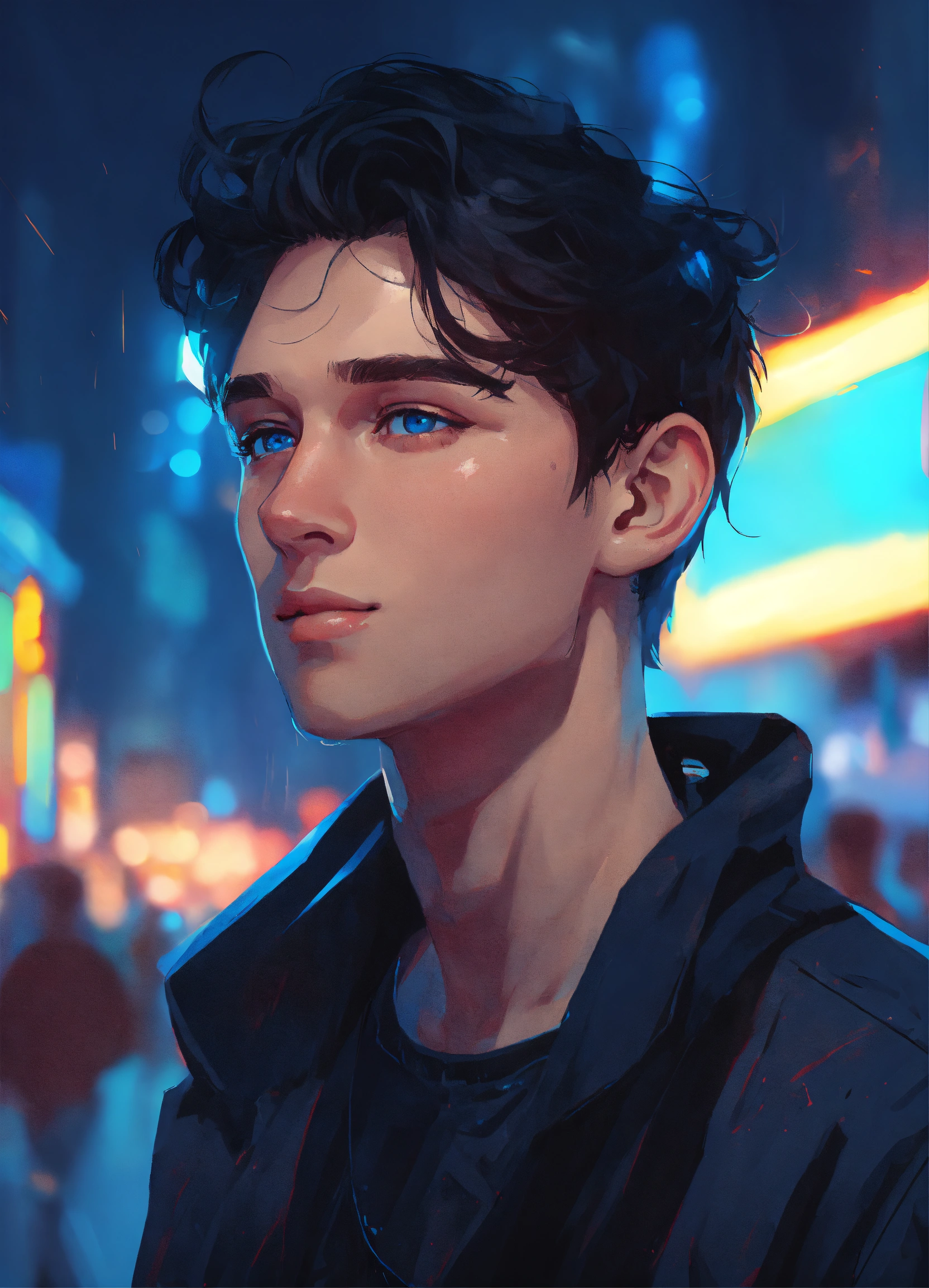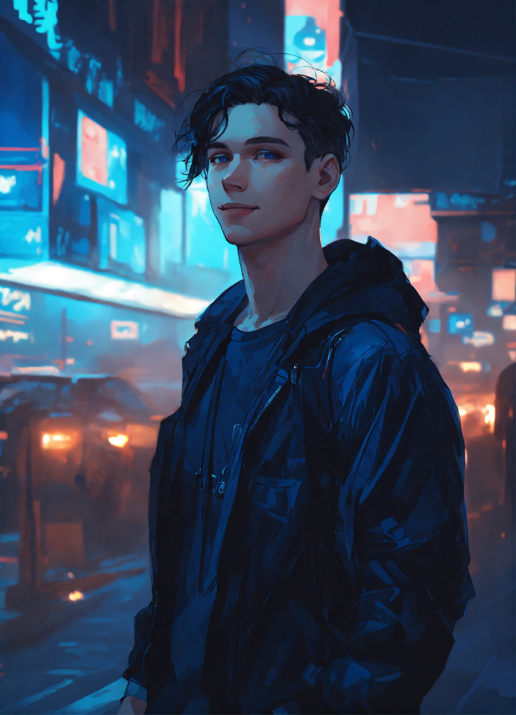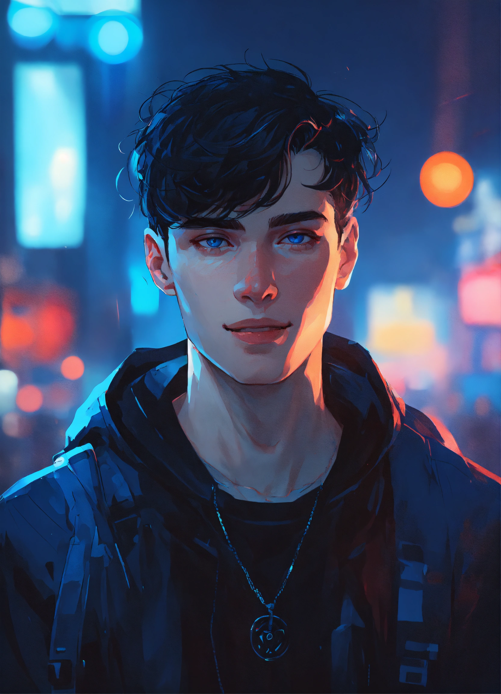 Highly detailed night time portrait of pale skin russian young man 27 years old, smile, blue eyes, dimples, black hair, in black and blue streetstyle, by atey ghailan, by james gilleard, black, grunge aesthetic!!! cyberpunk background