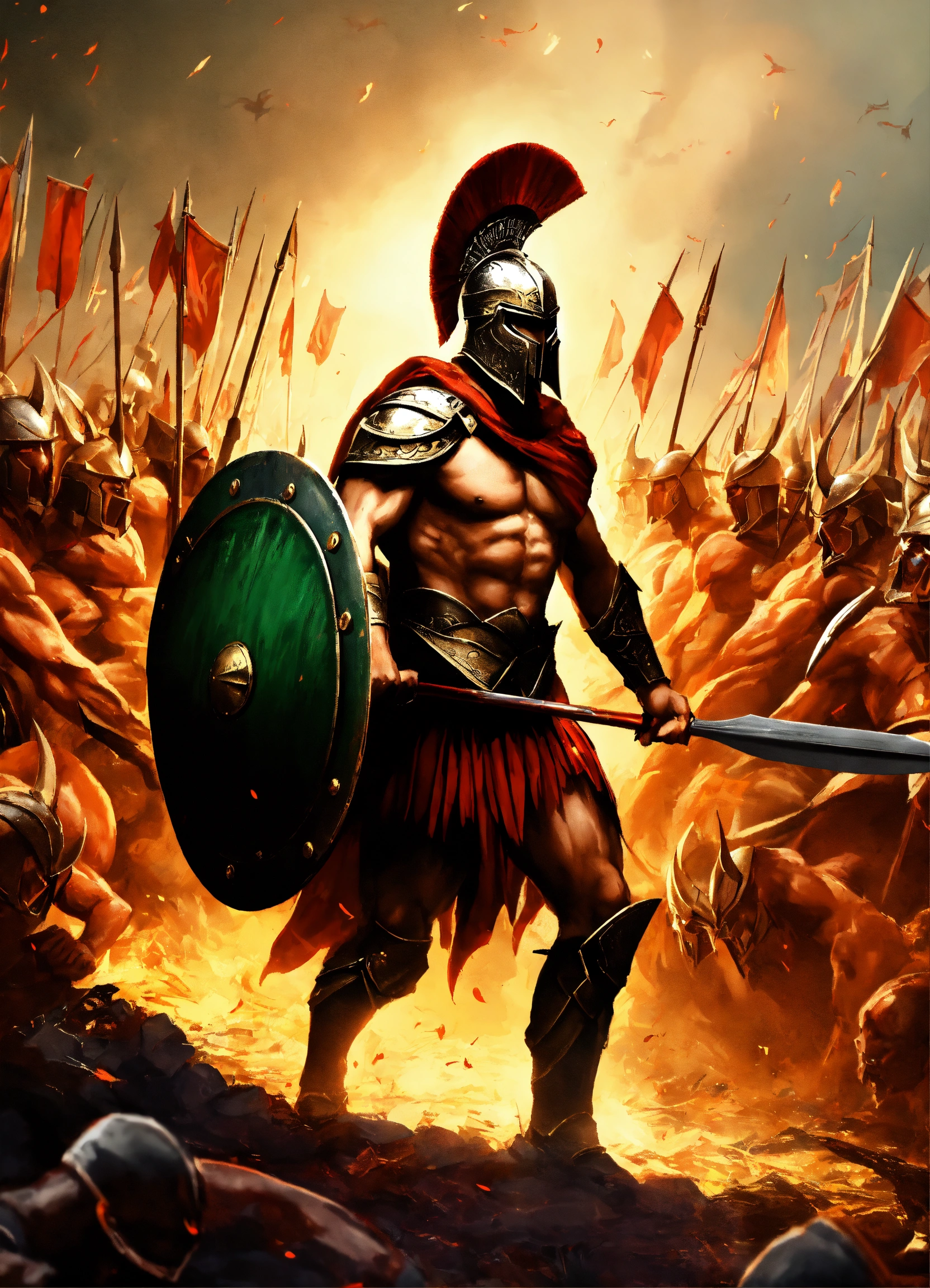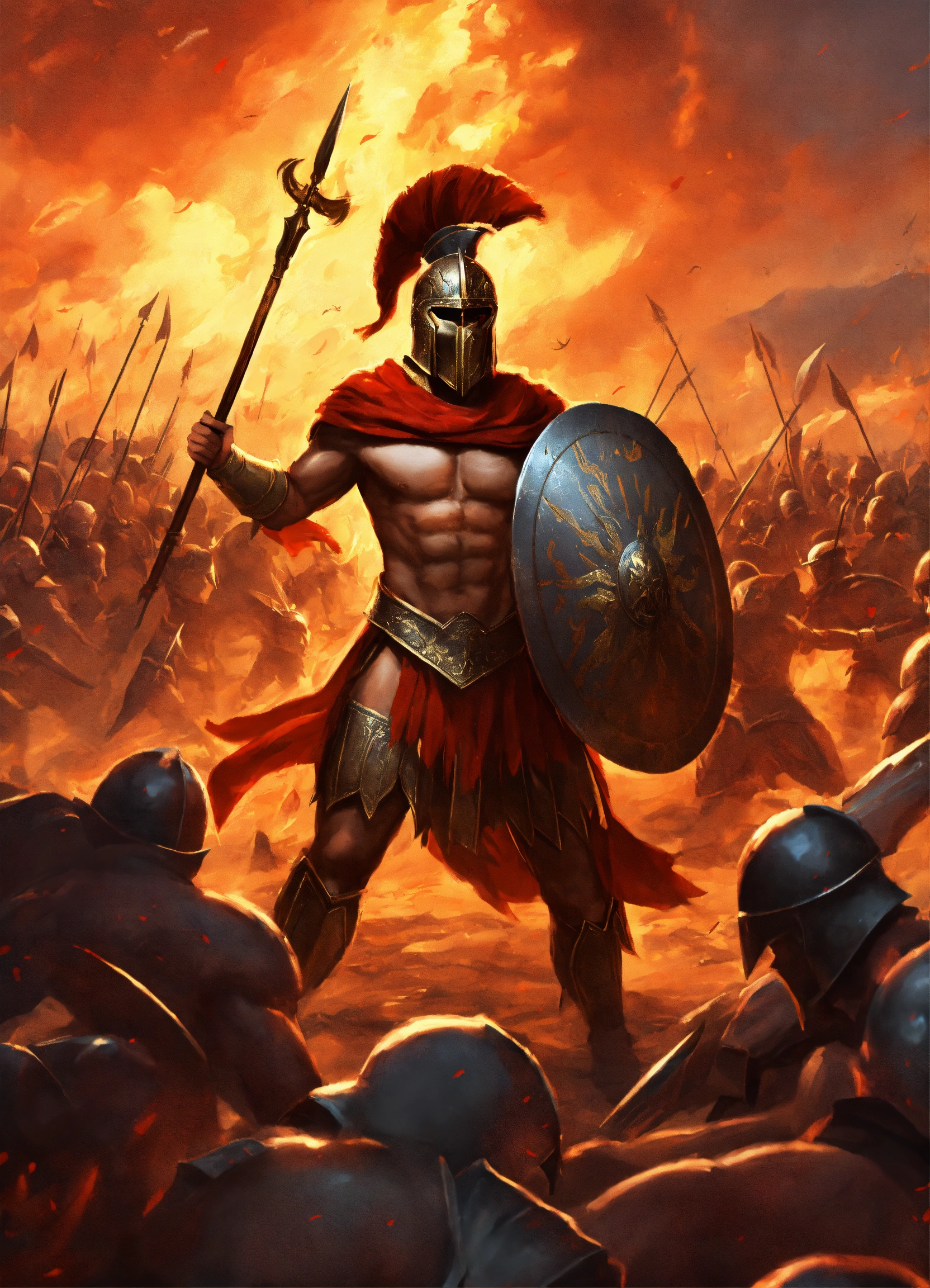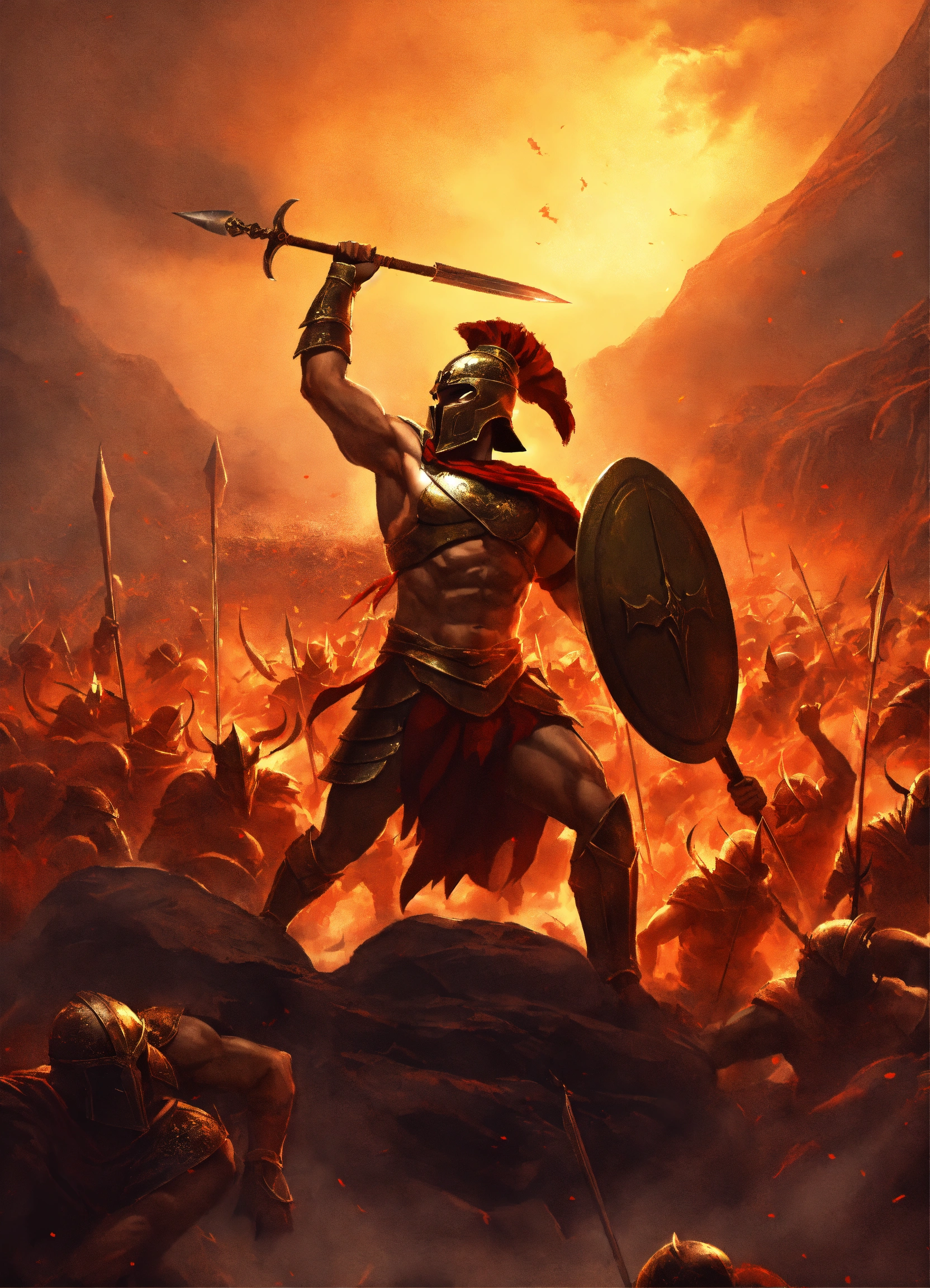 A single spartan warrior with a spear and shield fighting against an army of demons