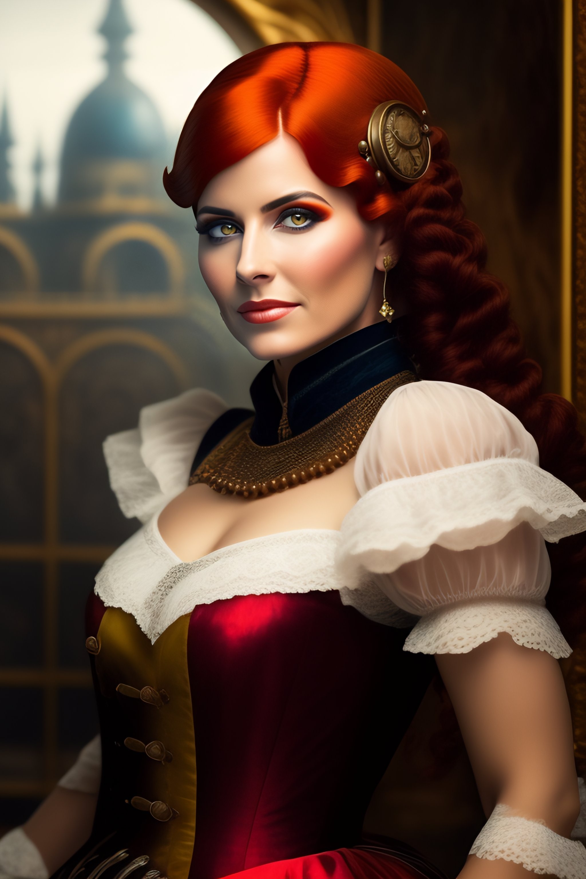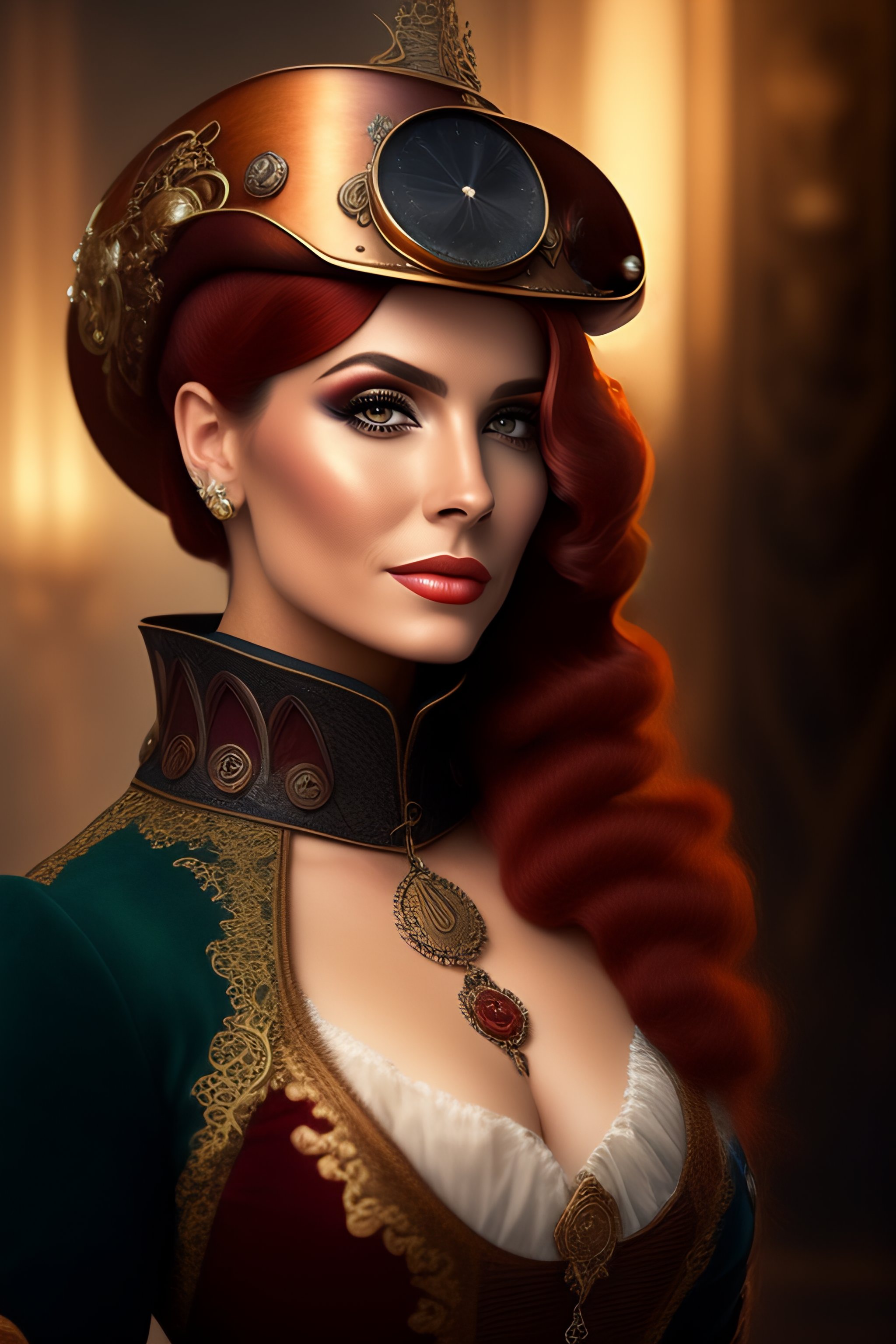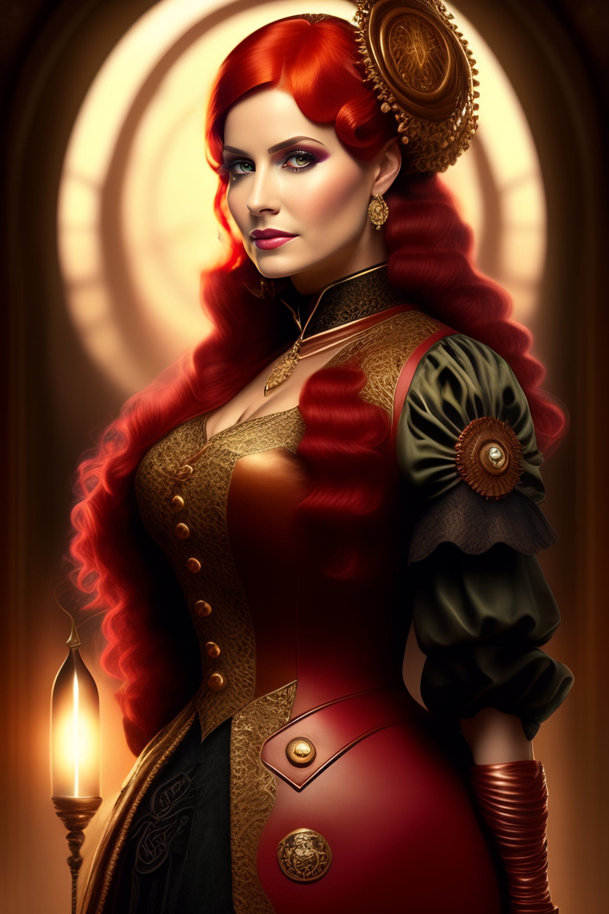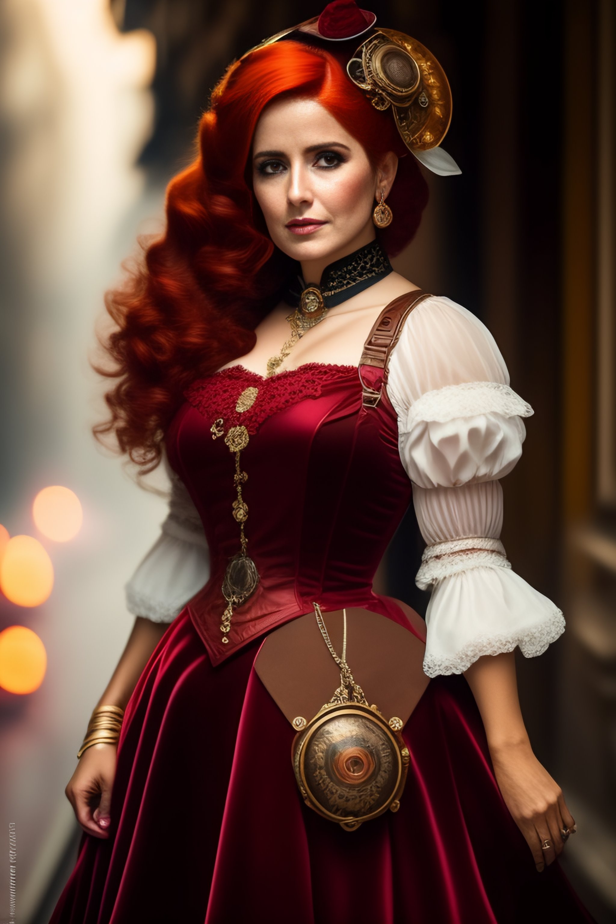 Mujer pelirroja misteriosa con vestido steampunk sosteniendo un teléfono antiguo en su mano, detrás hay una máquina voladora como las de las novelas de julio verne