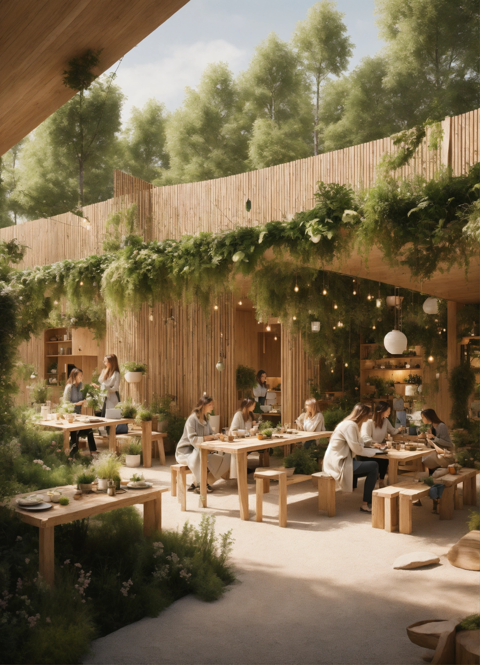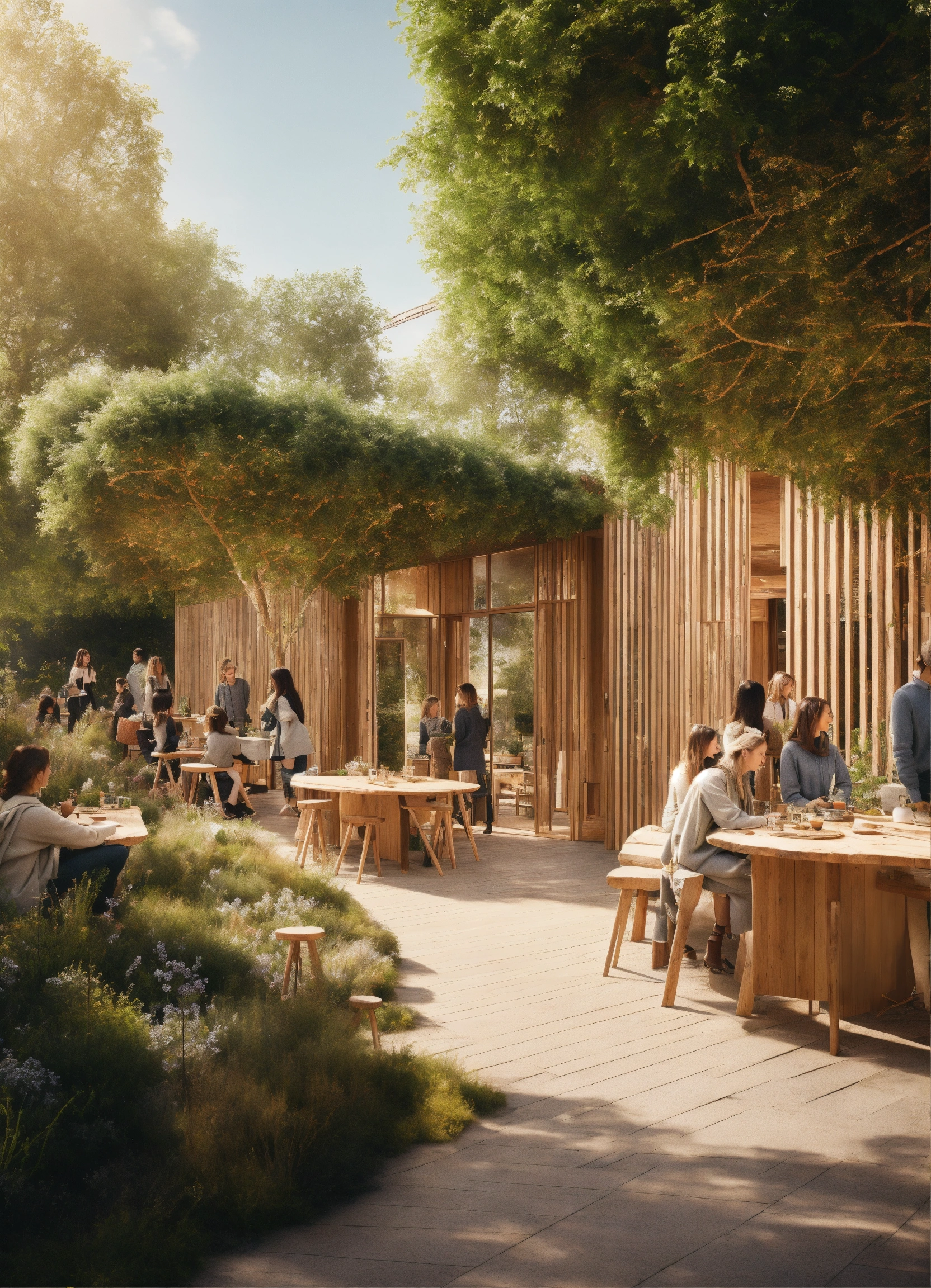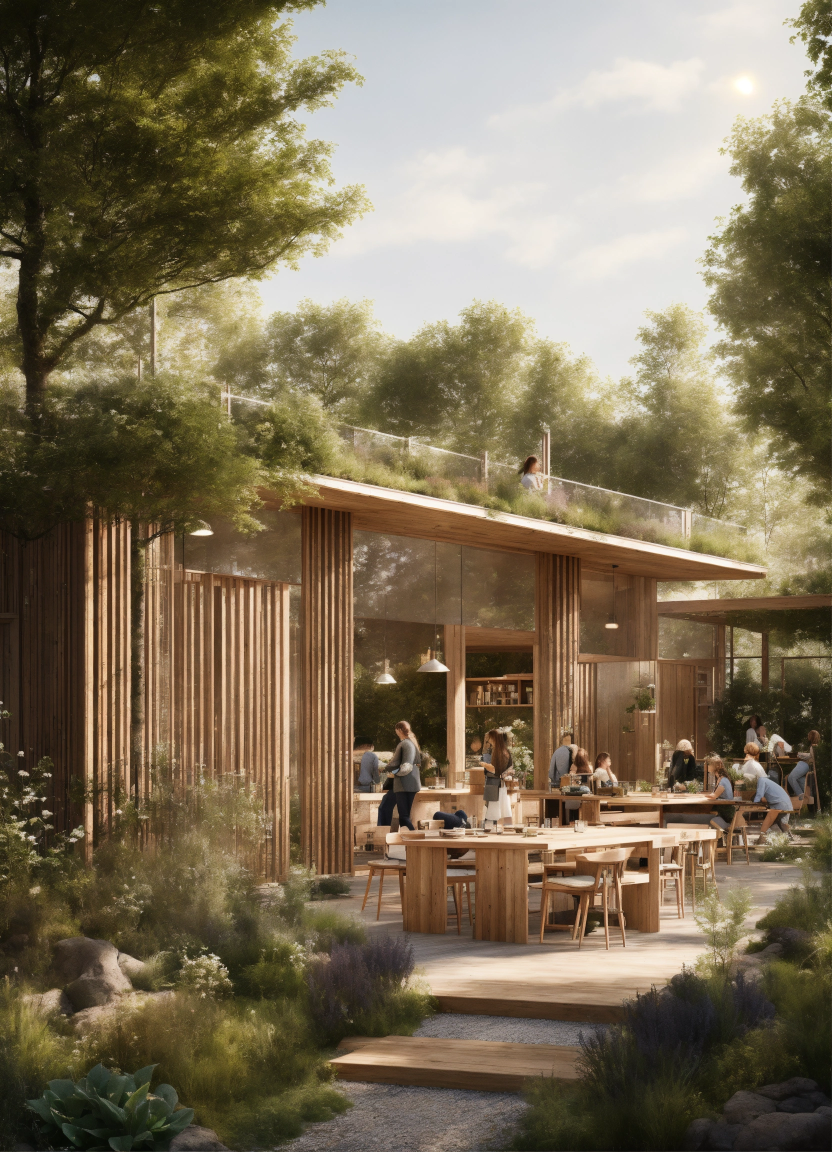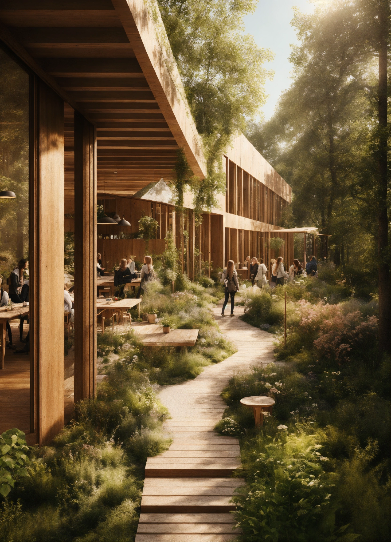 An image that shows a united community, representation of people connecting amidst nature, sense of community. biophilic design, natural materials, light colours scandinavian style lots of vegetation