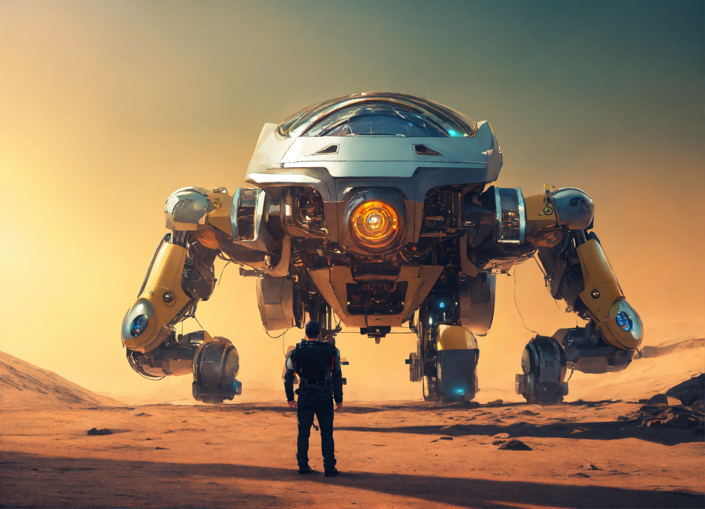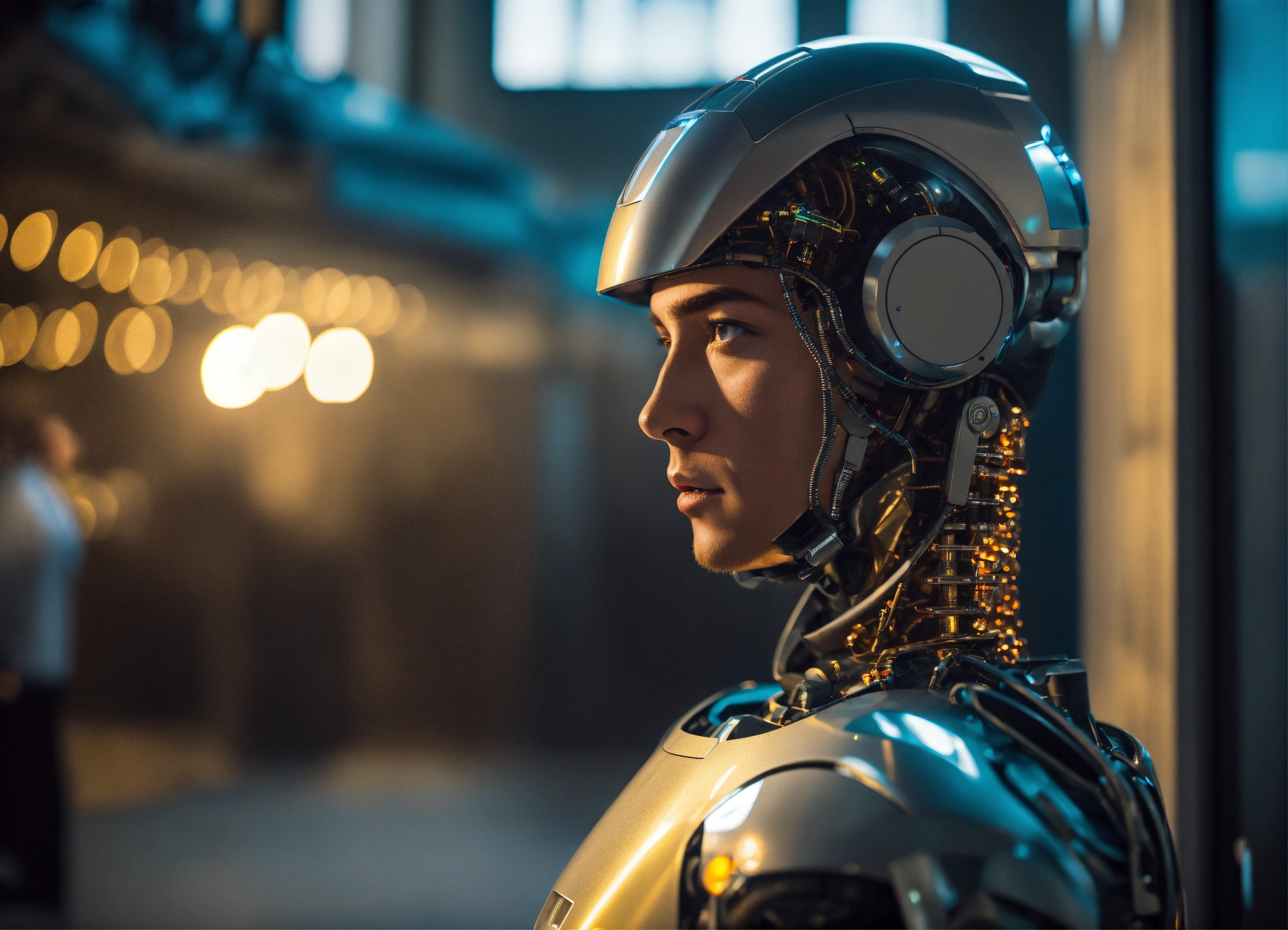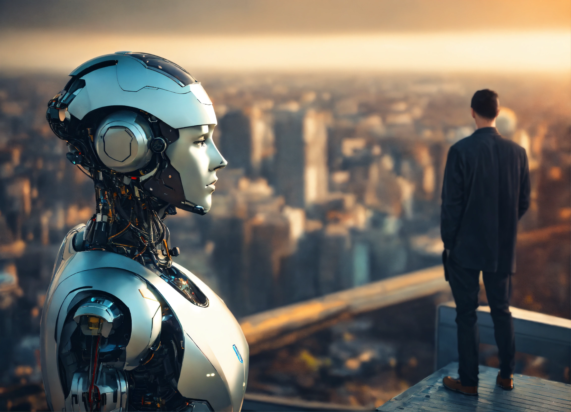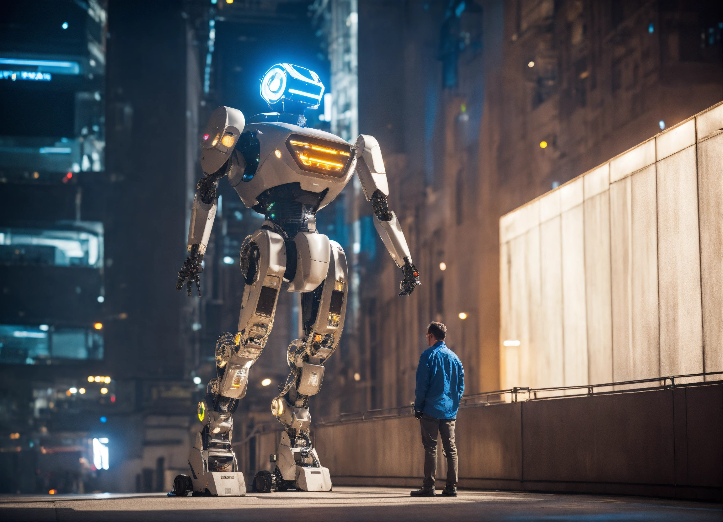 Futuristic robot looking down on man