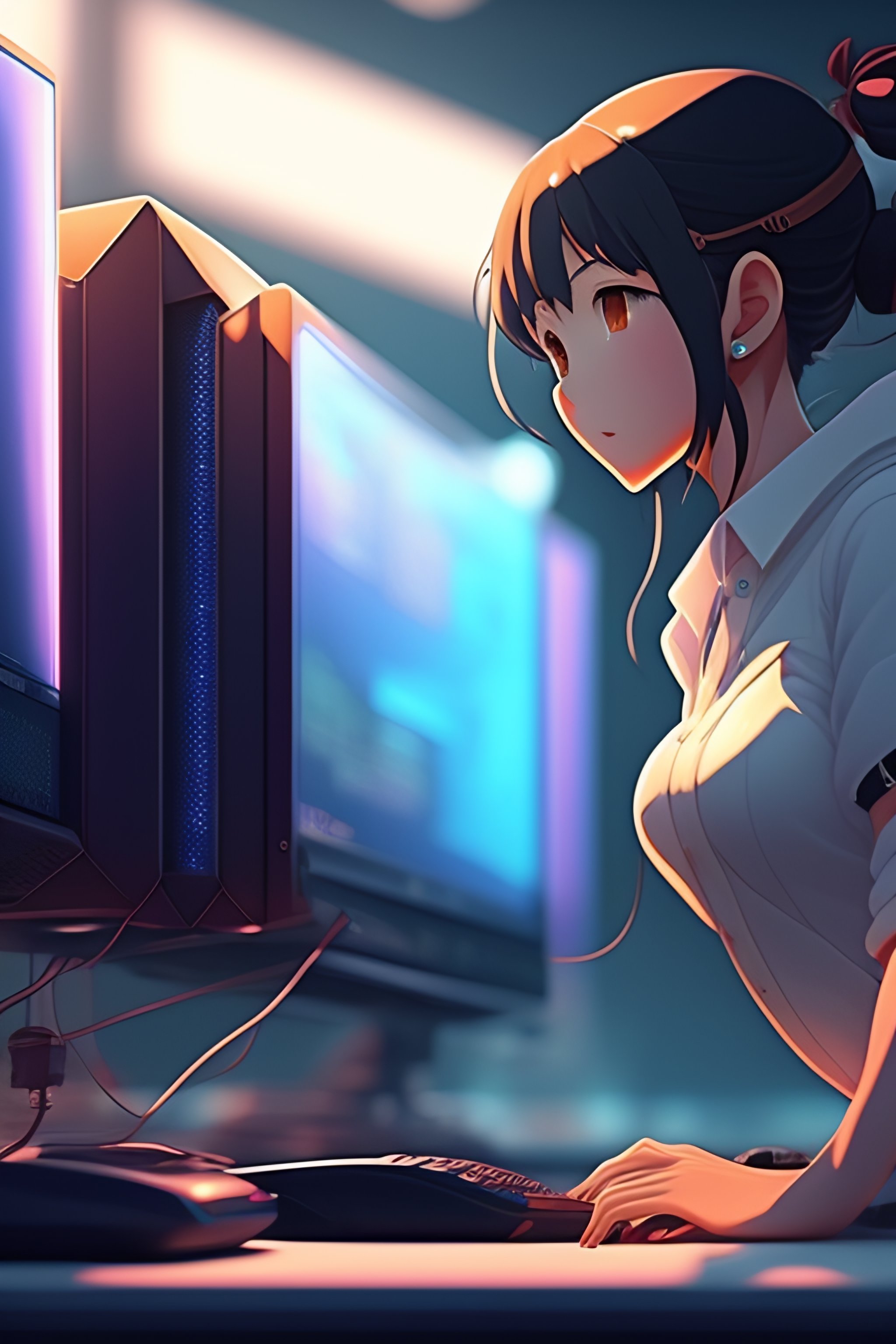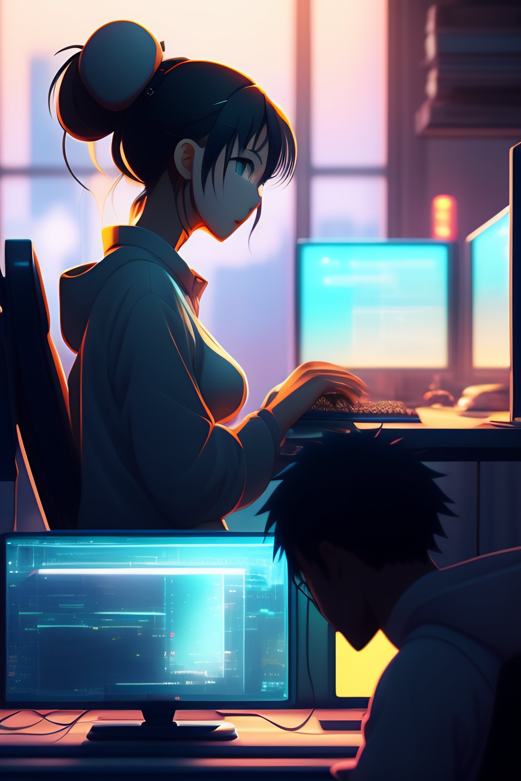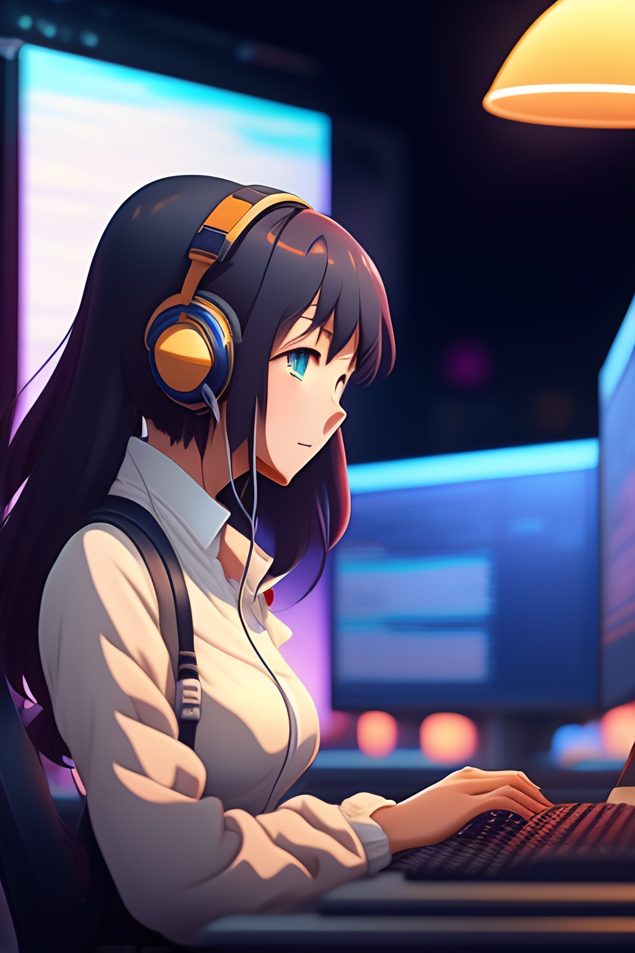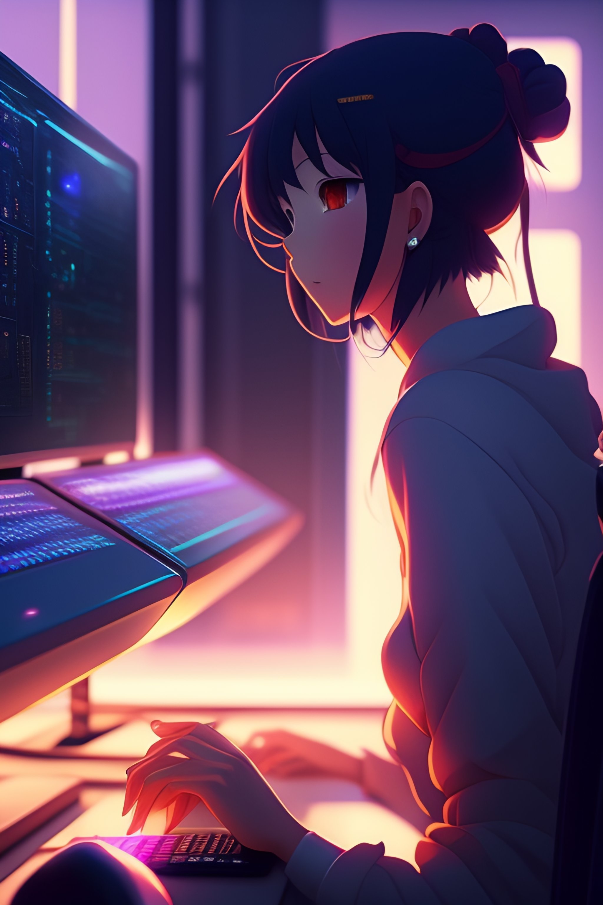 Create a high resolution artwork of anime girl is programming at a computer in a room full of gadgets, web developer, by makoto shinkai and ghibli studio, outlined silhouettes, dramatic lighting, highly detailed, incredible quality, trending on artstation, masterpiece, 8k