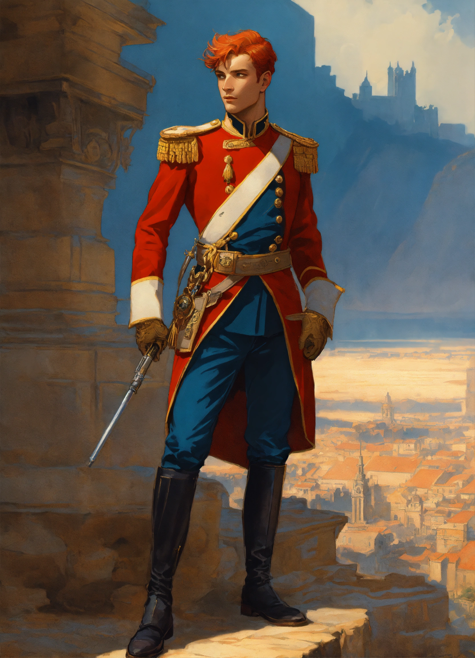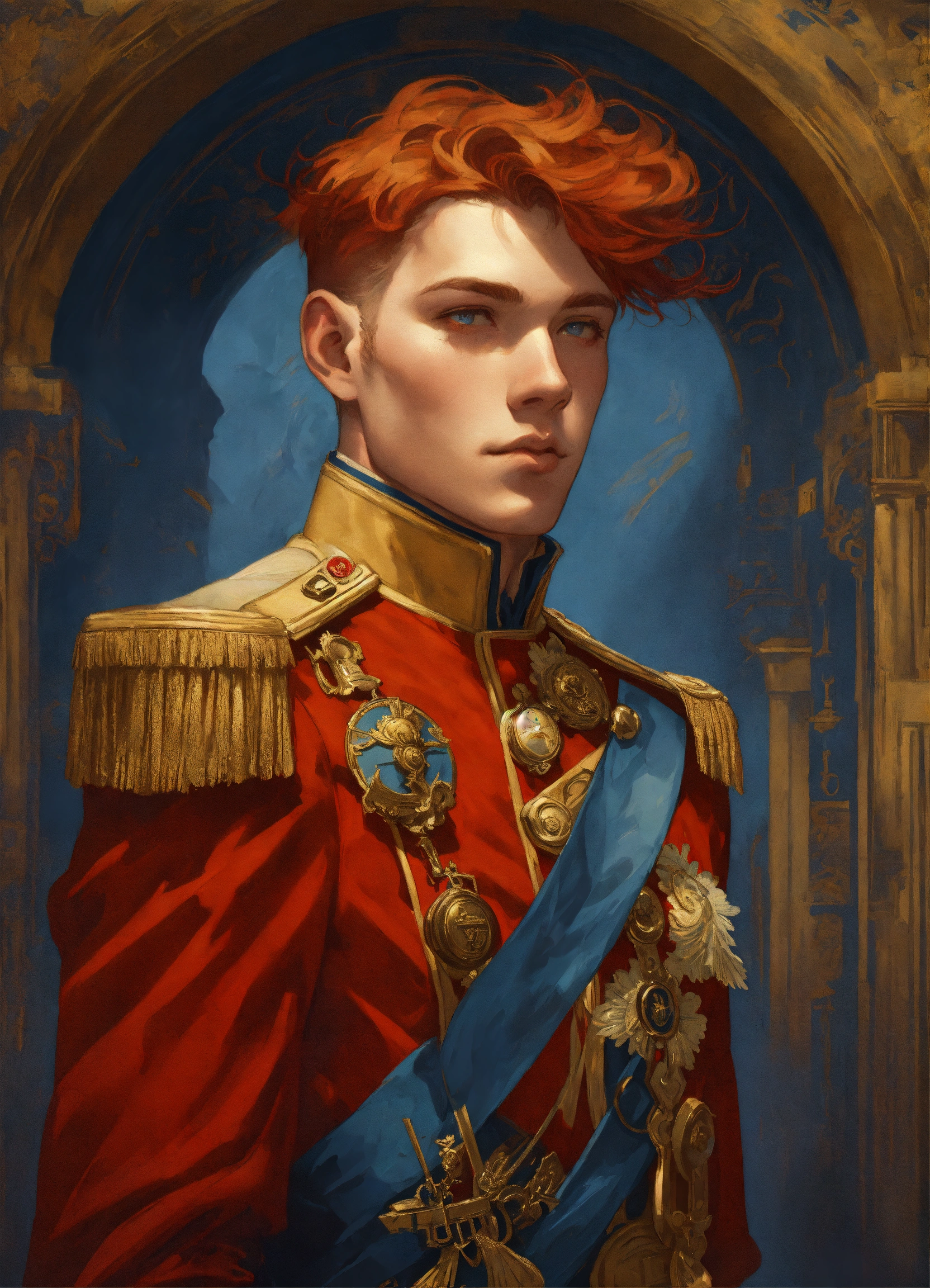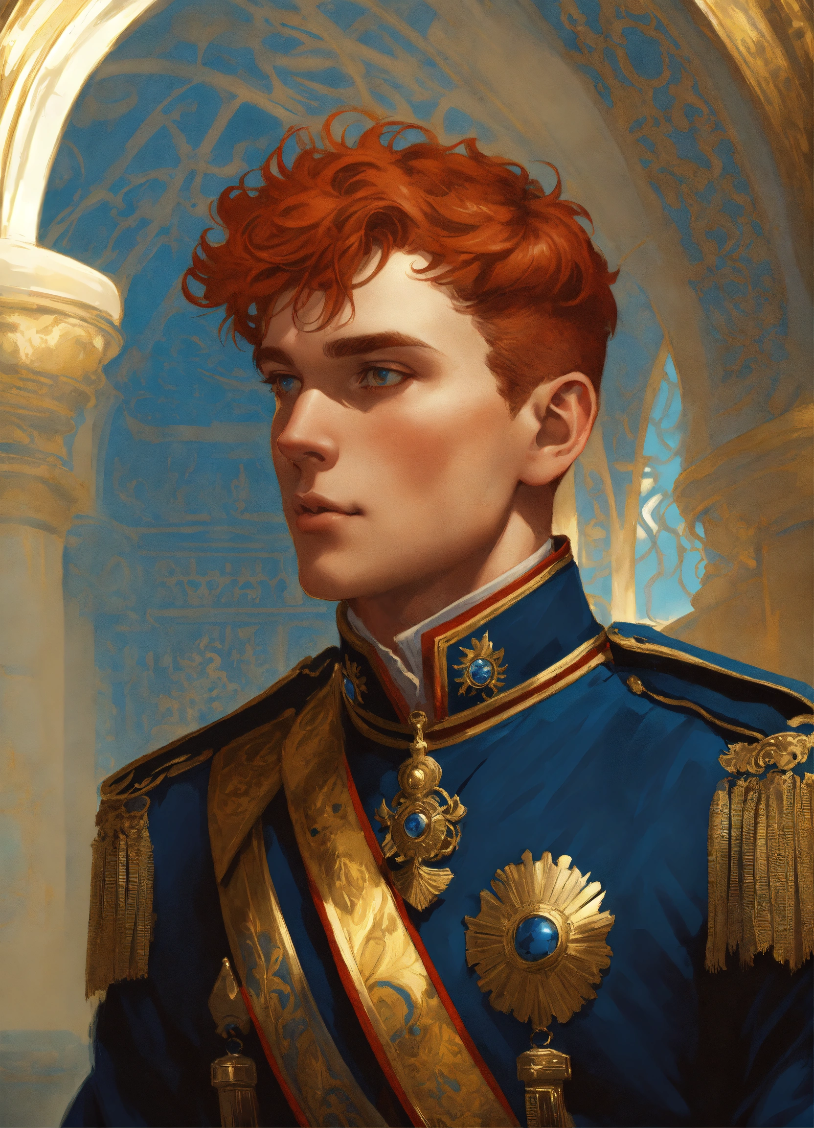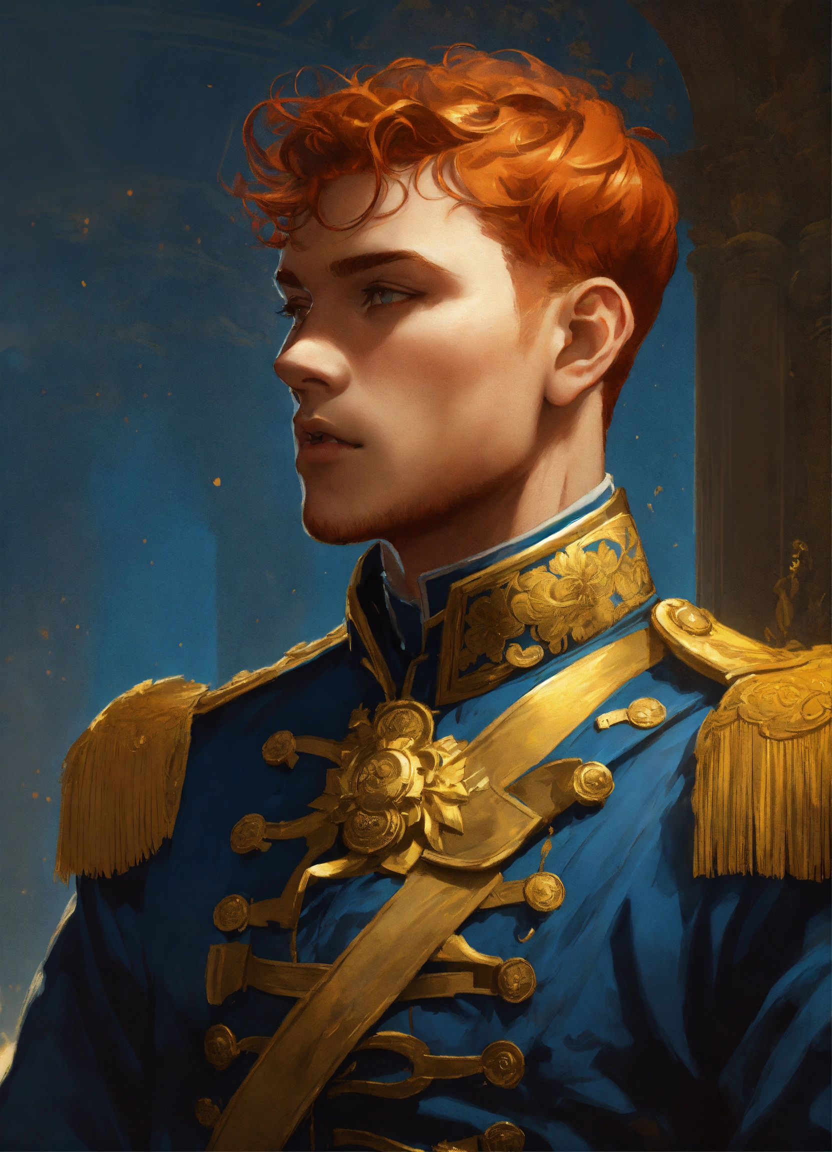 Male human early 20s, short red hair to one side, 19th century military blue and gold uniform . concept art, intricate details, highly detailed by greg rutkowski, michael whelan, and gustave dore, alphonso mucha, mystra