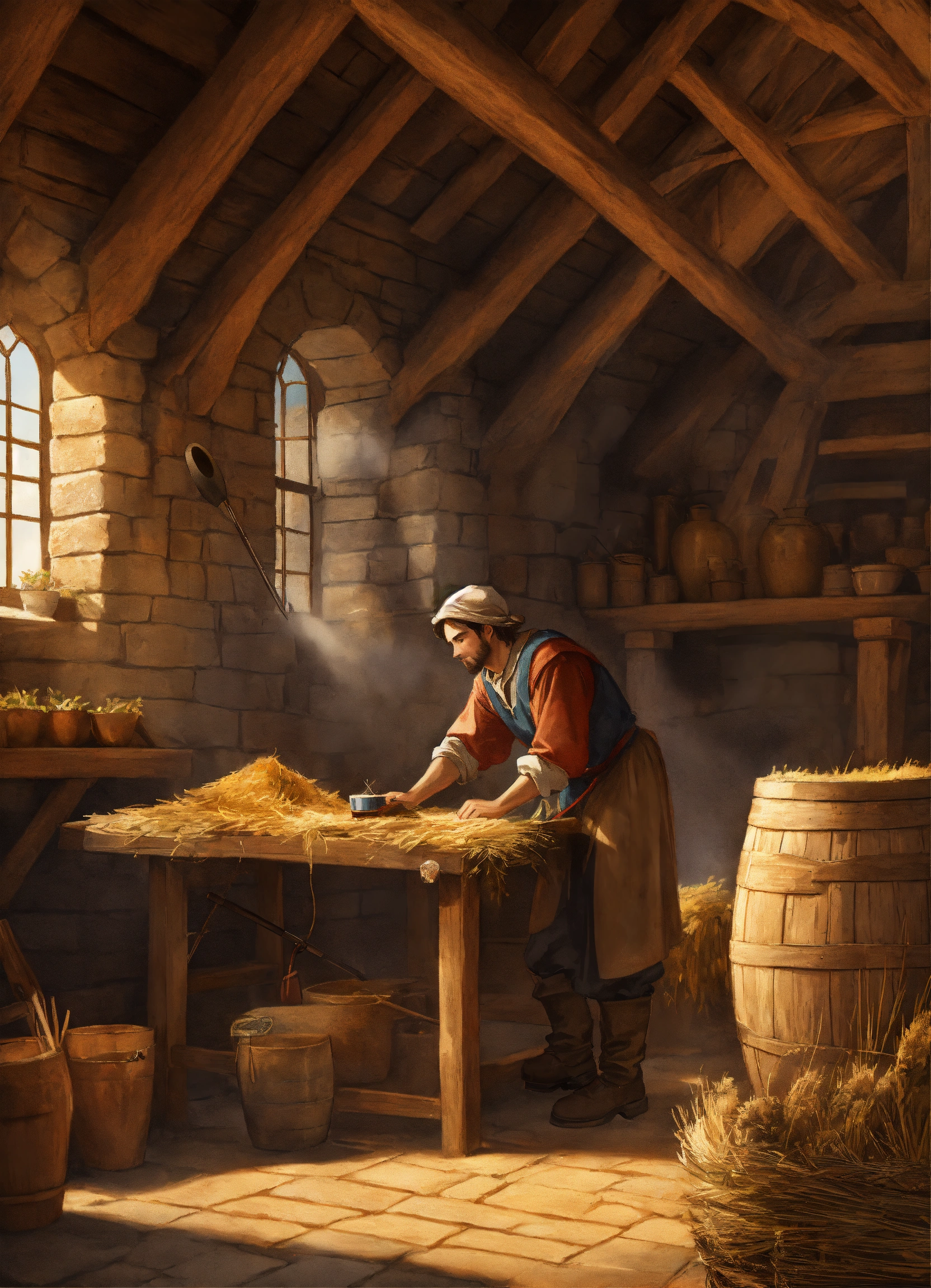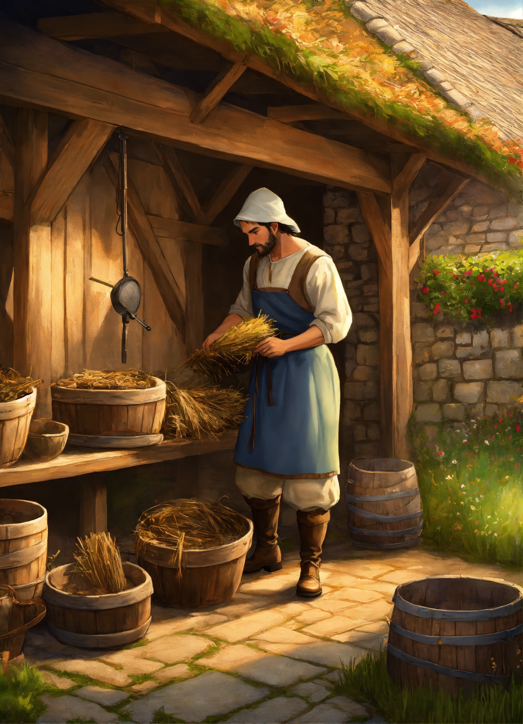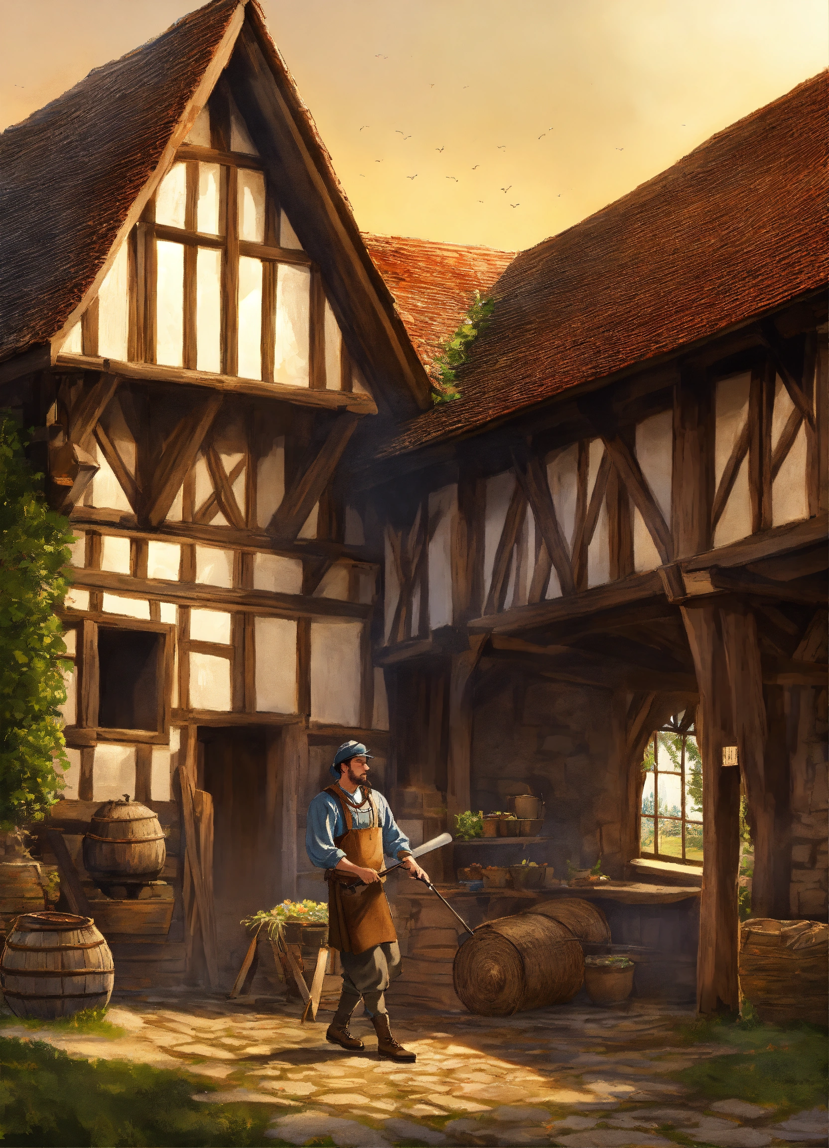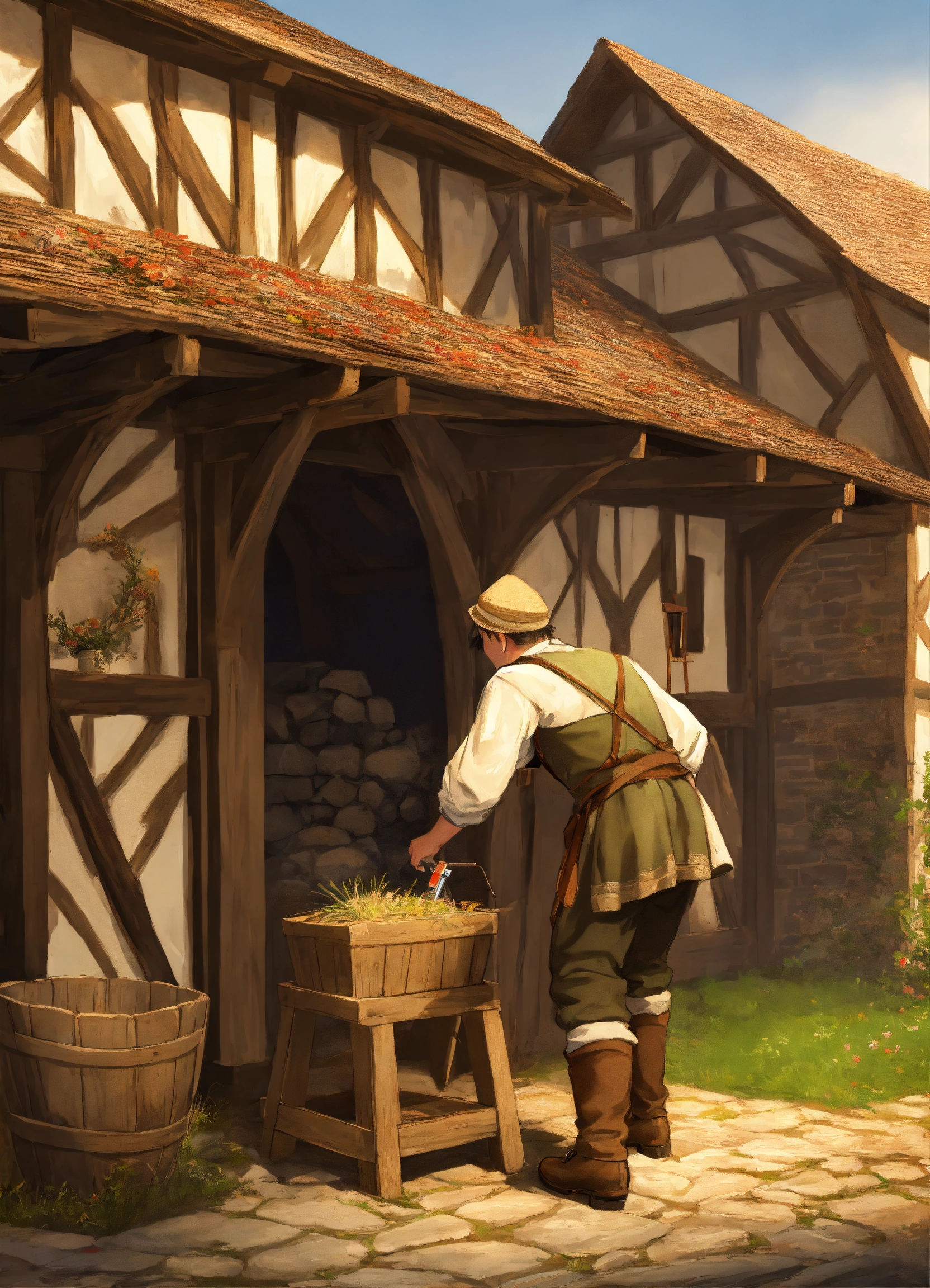 A digital art of a medieval peasant working on a barn in a castle courtyard
