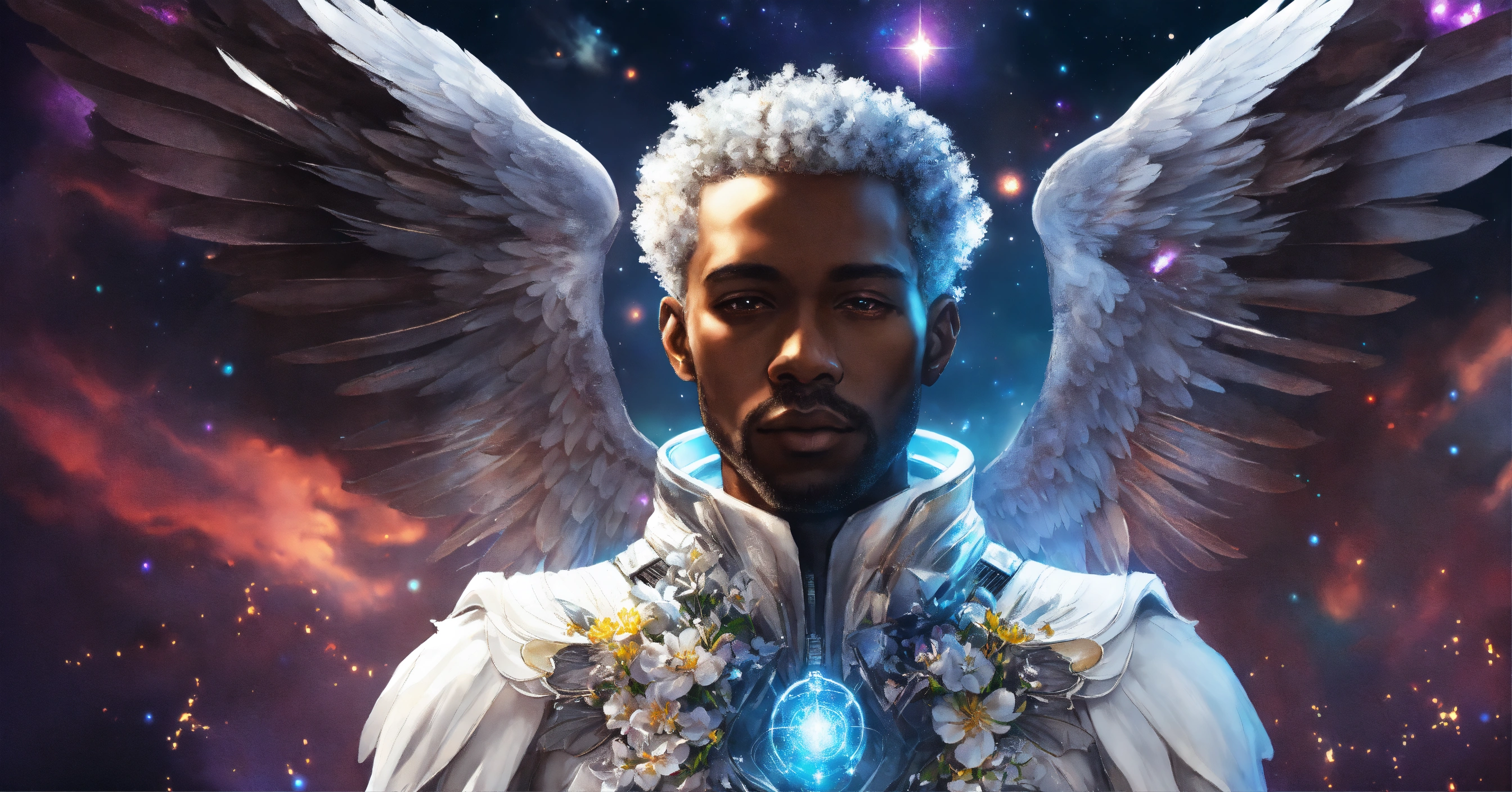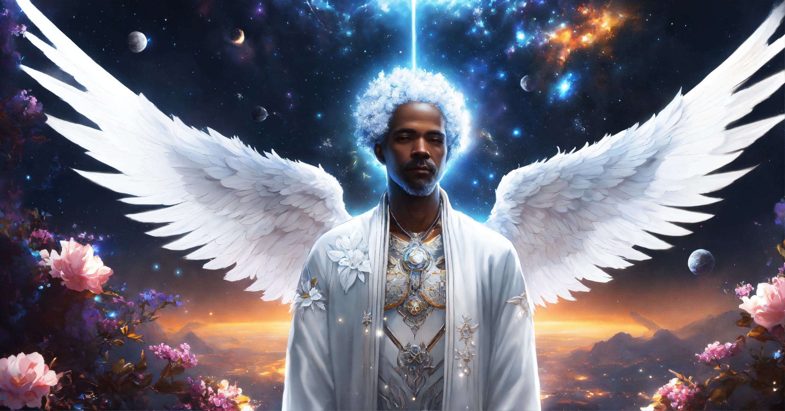 Cyberpunk digital painting of a old black male angel with beautiful white wings in space, meditation, cosmic space, exuding enlightenment, deep white and silver colors, flowers everywhere, stars and space, vulmetric lighting, 8k resolution, highly detailed