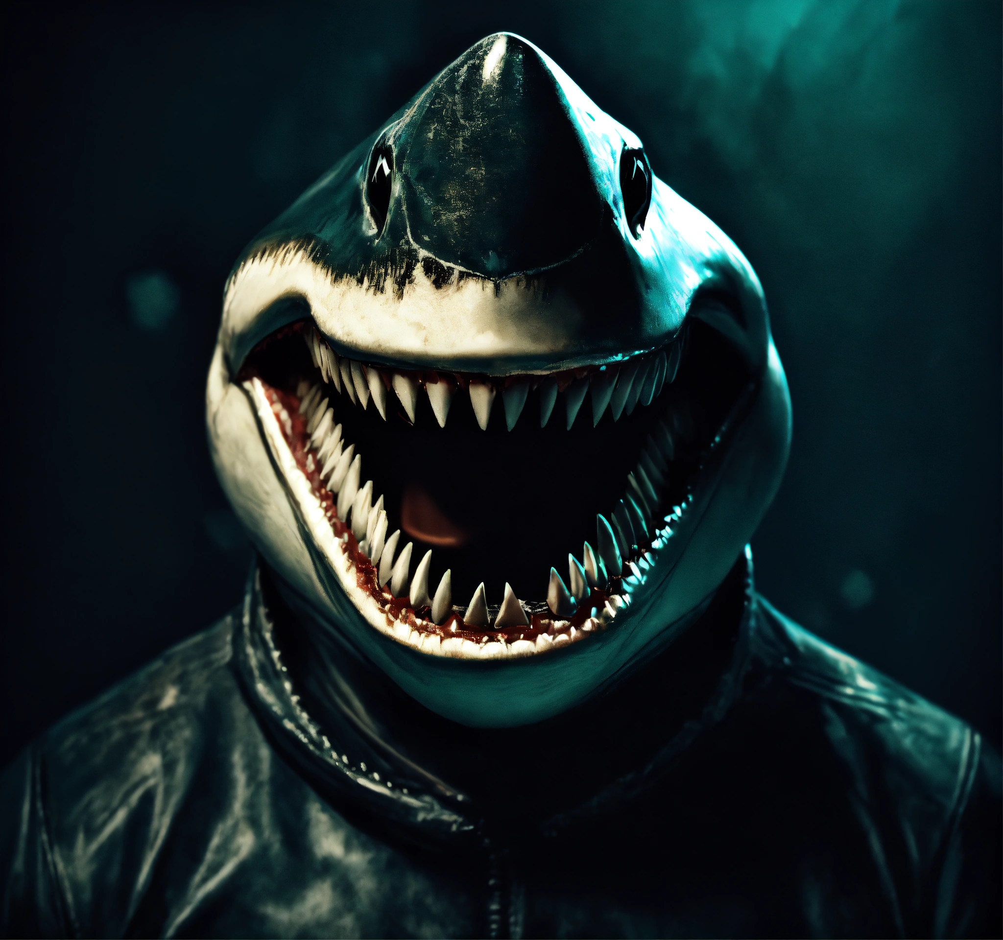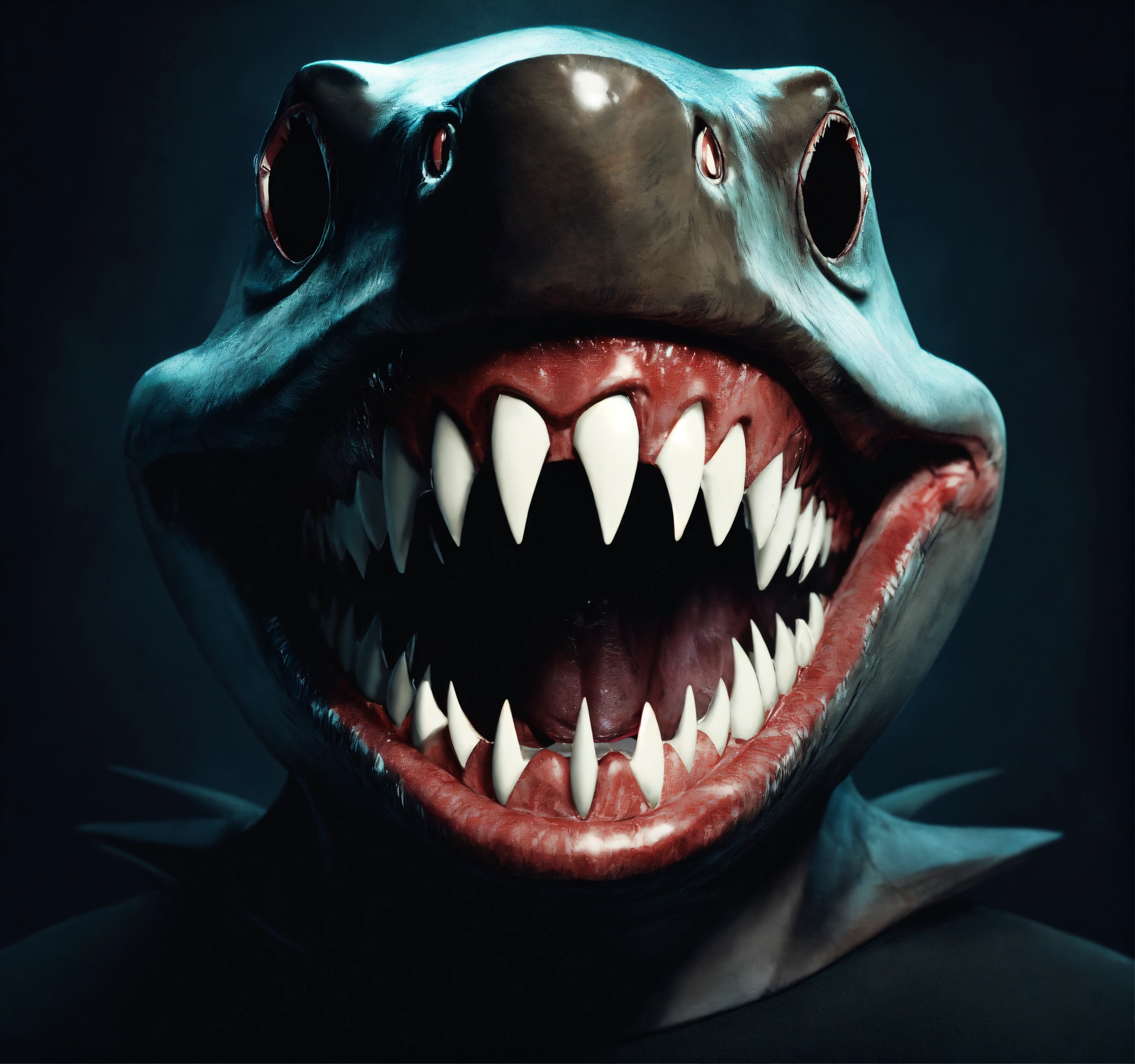 Evil shark like man standing in a dark room, laughing sadistically, showing shark-like teeth, cataracts eyes, a close-up image, 4k render, grunge, solid black background, surreal