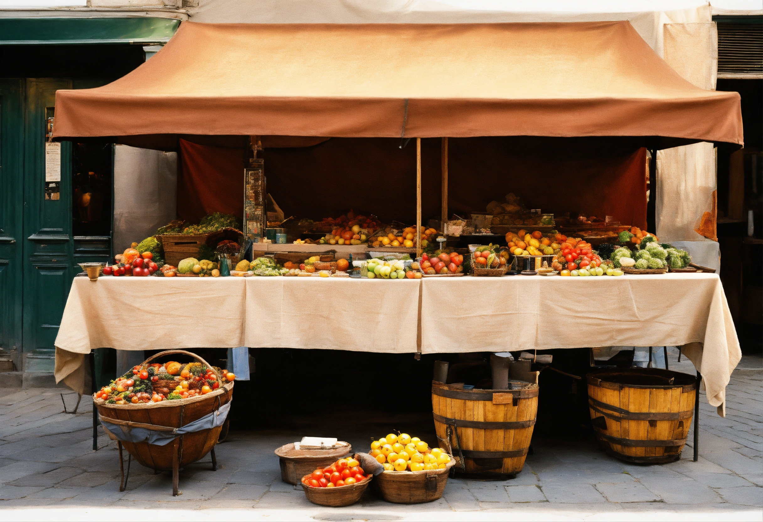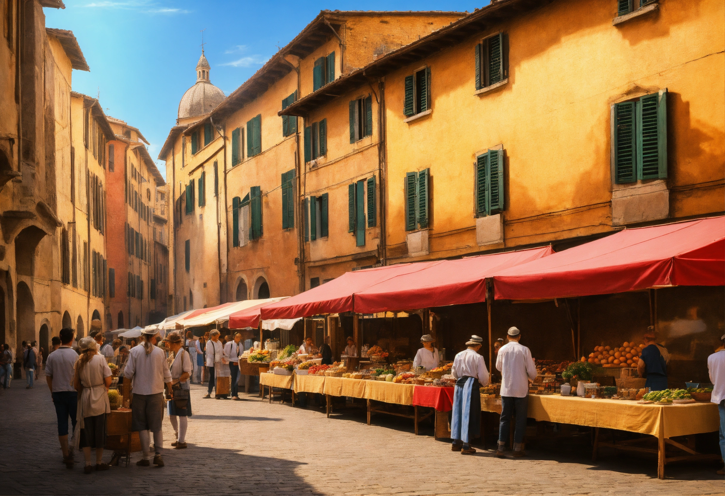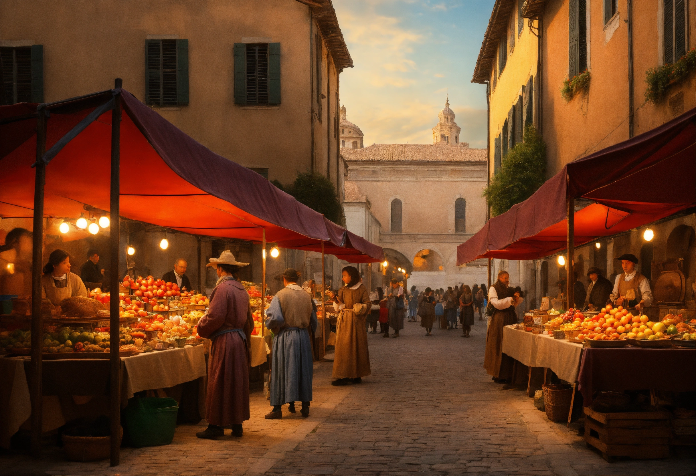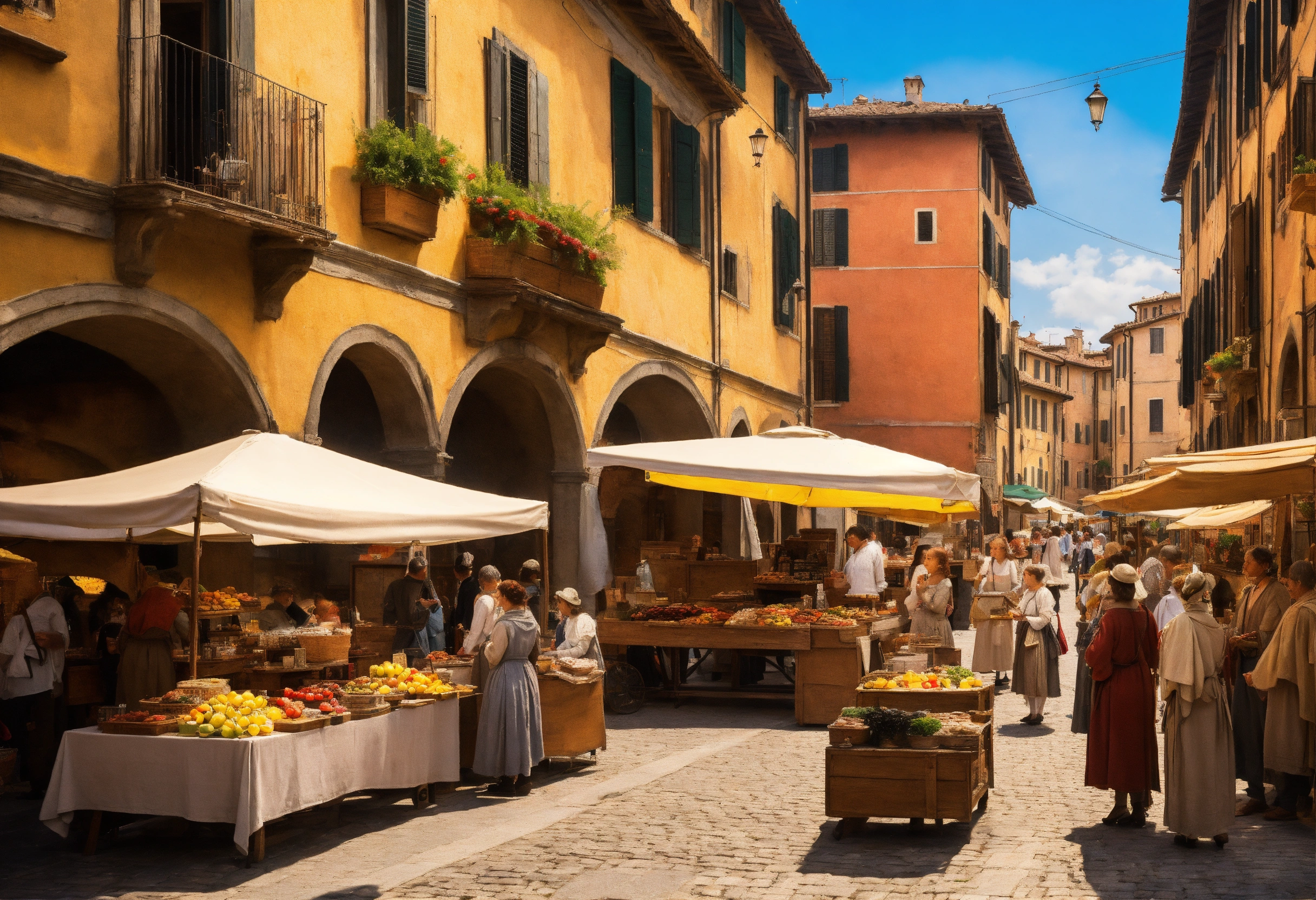 Italian renaissance street market, in the style of leonardo da vinci, visible brushstrokes and varnish --ar 32