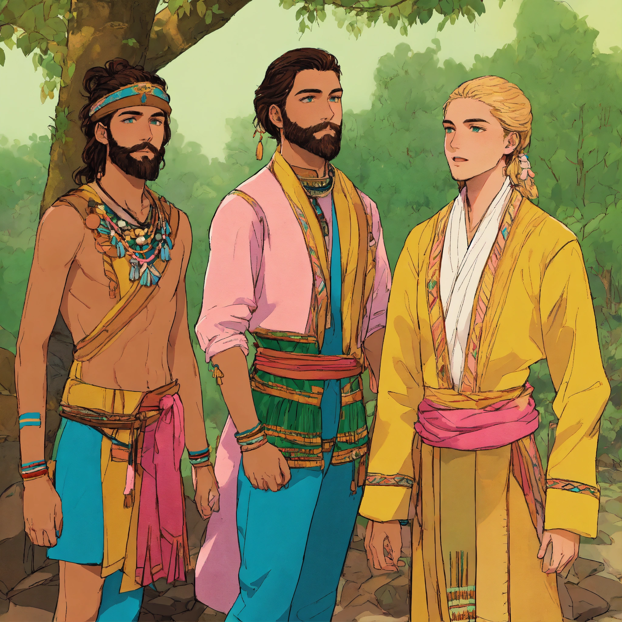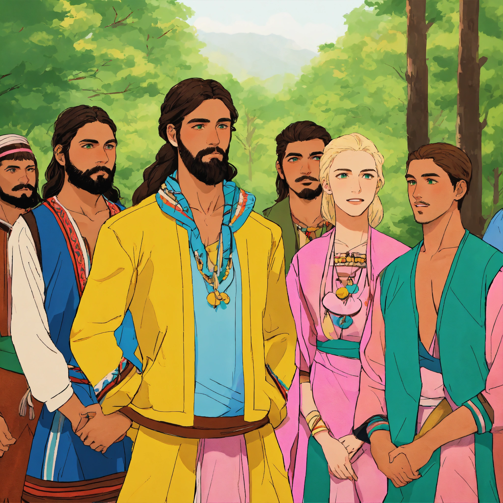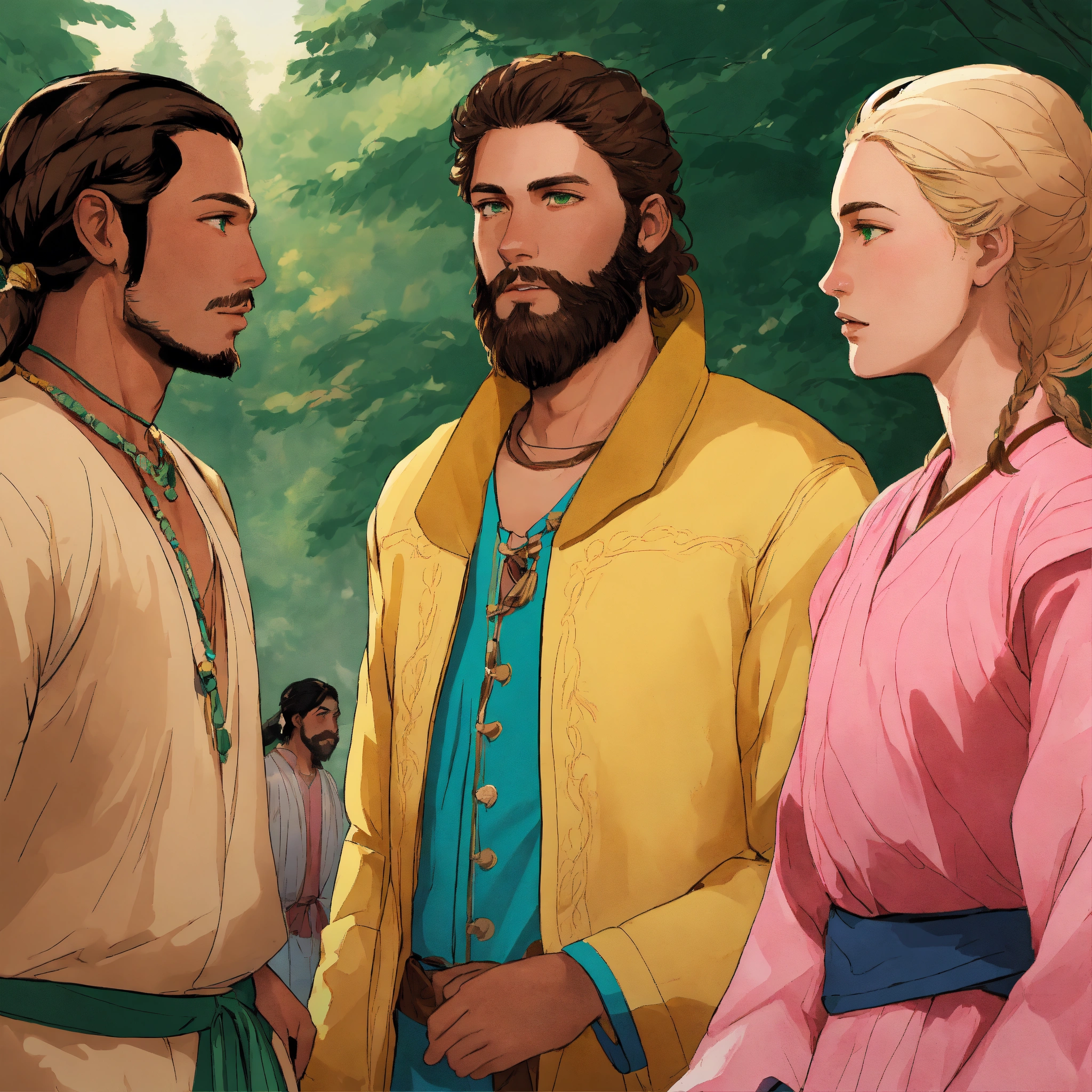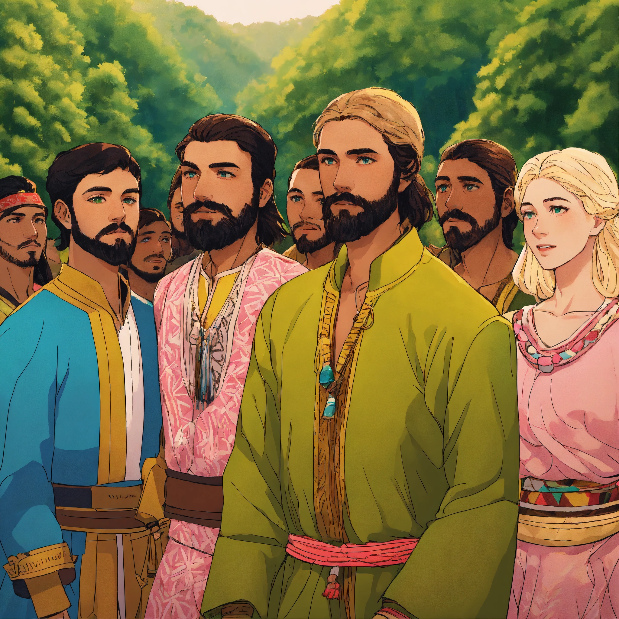 In this particular illustration style, a young man with brown hair, a light thin brown beard, and green eyes can be seen wearing a yellow jacket and a white woman with blonde hair, blue eyes, and a v-shaped face wearing pink jacket. show group of tribal people meeting young man and woman. show wide view of forest and tribal people dressed in their historic dresses