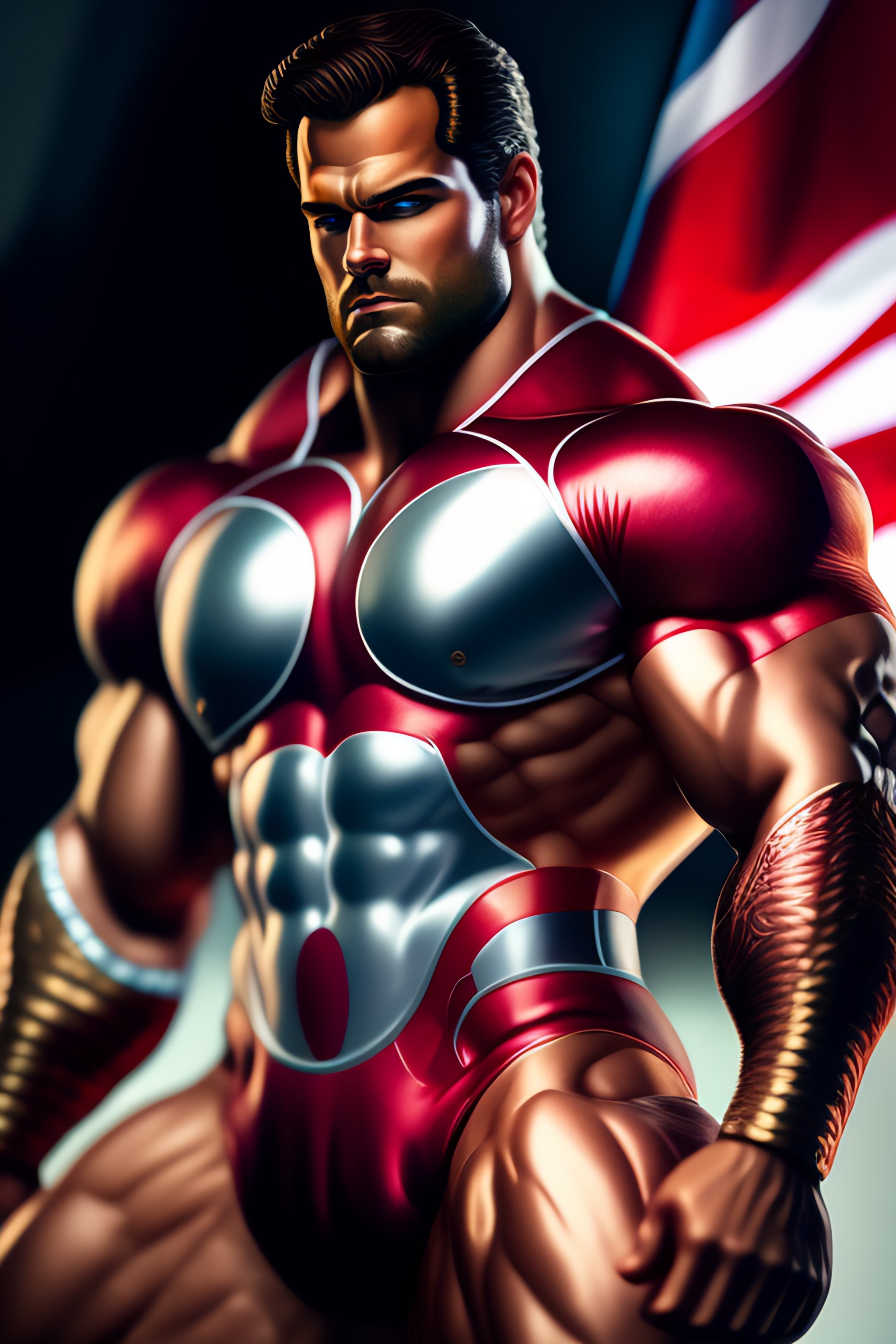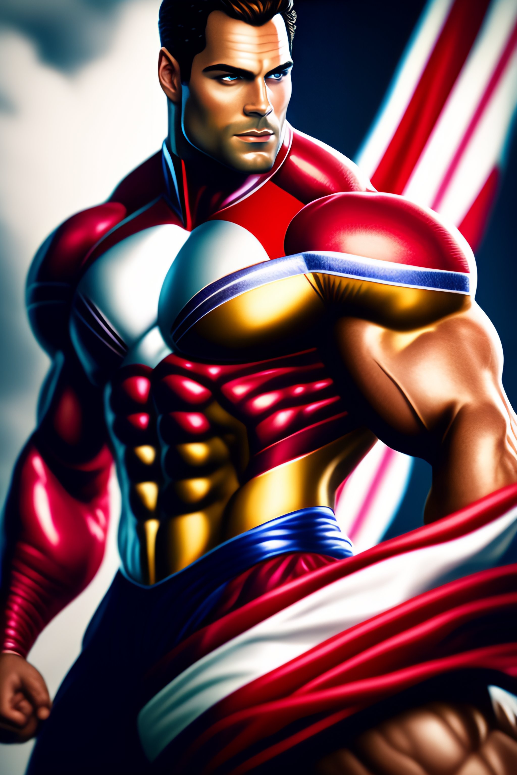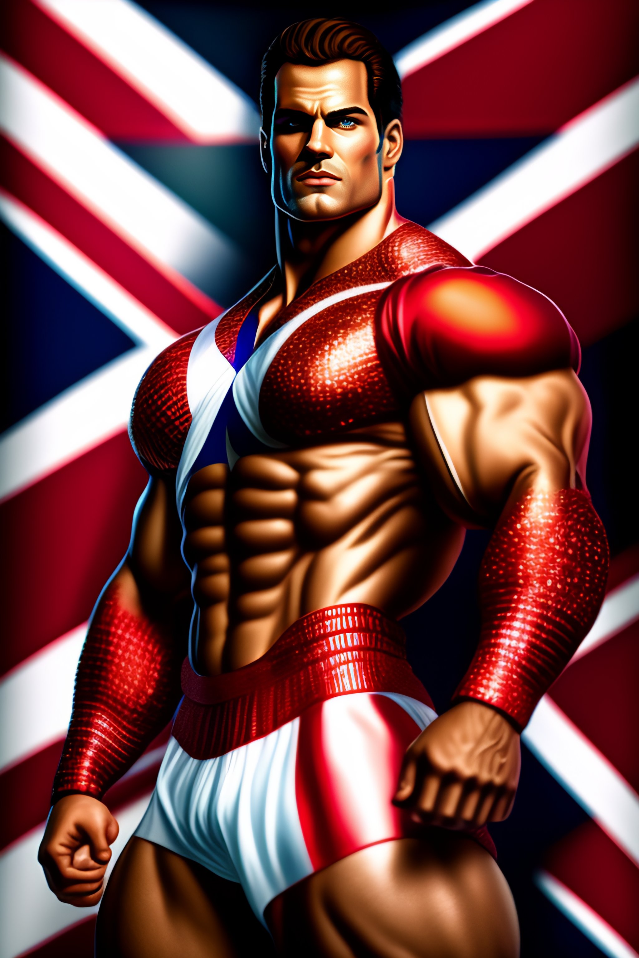 Epic comic book cover, accurate hyper realistic henry cavill as muscular bodybuilder superhero captain britain posing in a dramatic fighting stance, wearing a glossy metallic intricate patriotic british superhero costume with short sleeves a codpiece and union jack chest logo, slight smile, cleft chin, dark hair, british iconography and heraldry, london city in the background, insane detail, intricate, 8k, sharp focus, cinematic, artstation, dlsr photography, photo by bruce weber photography