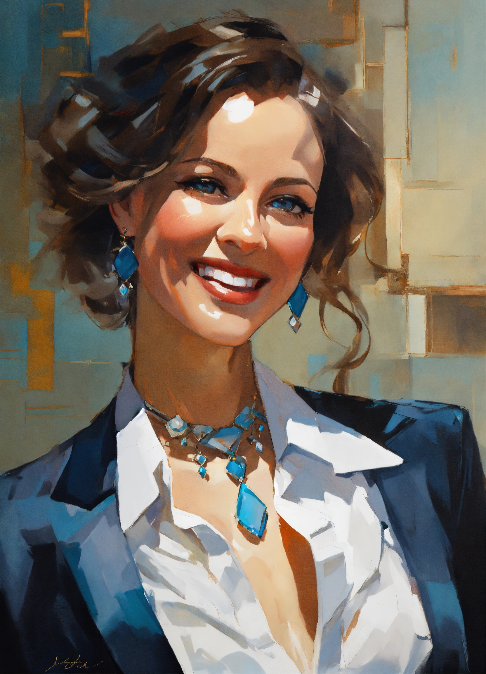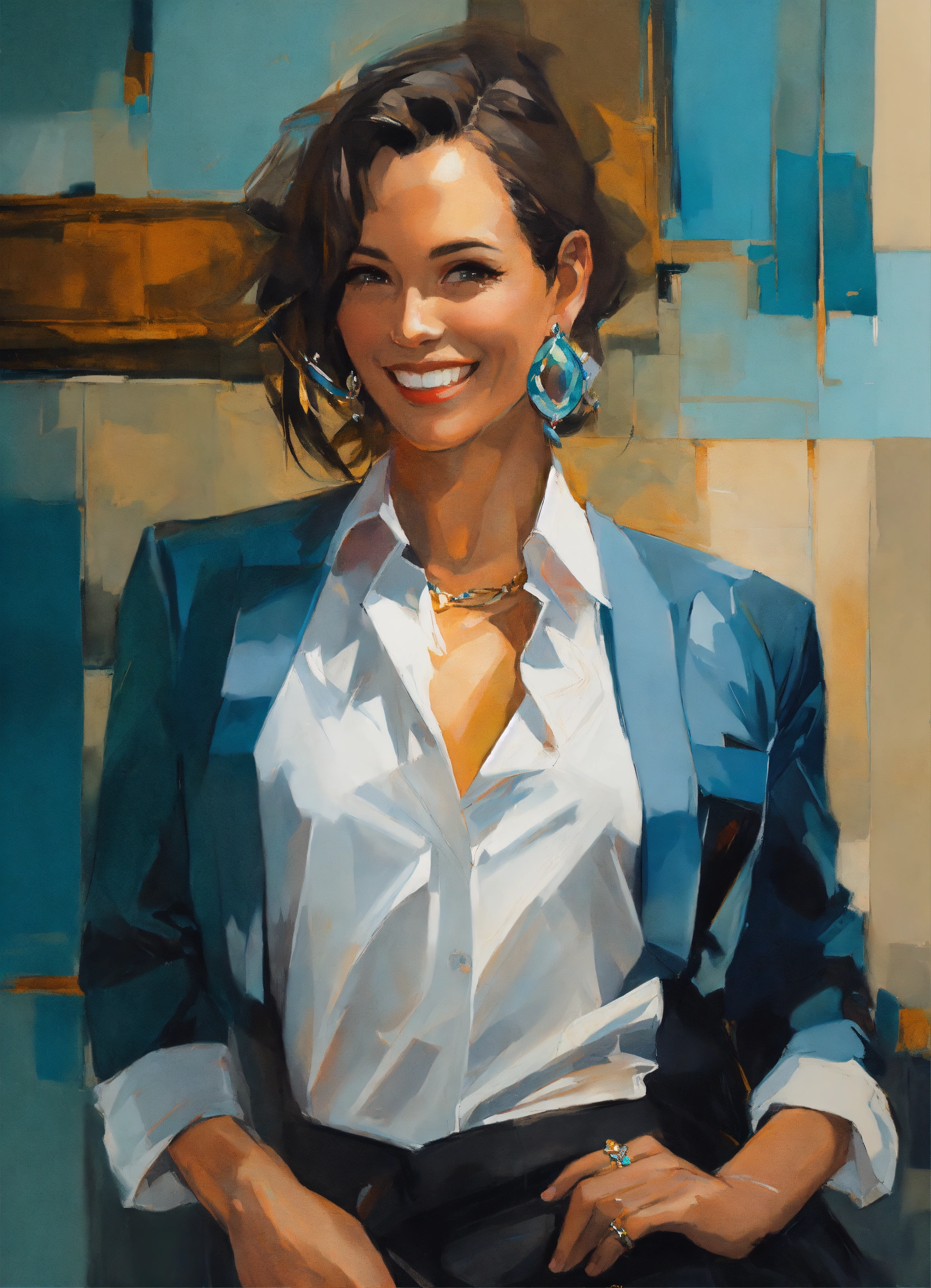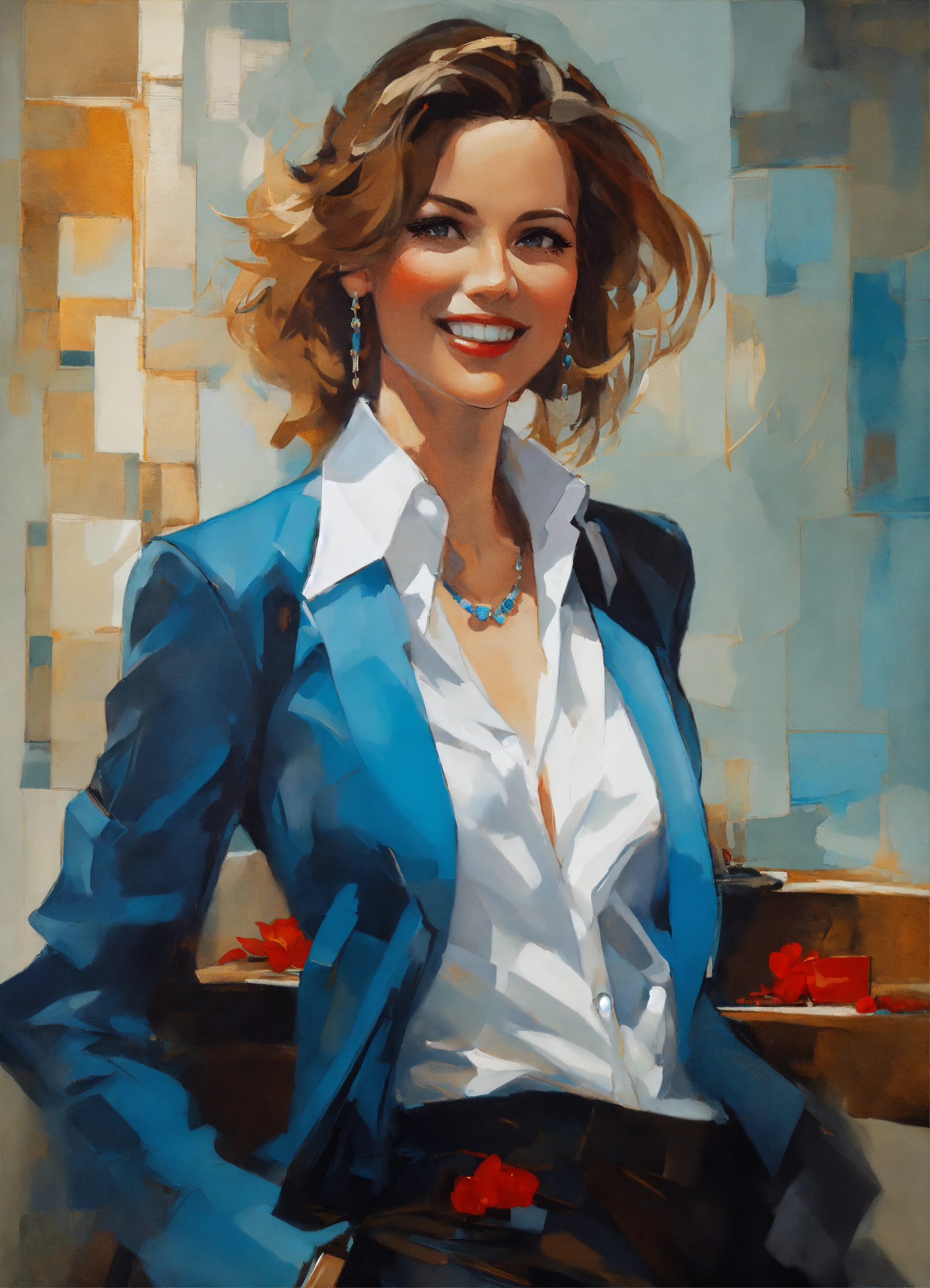 Woman in her 40s, in a tuxedo shirt, surrealism, entire physique, smile, details fine jewelry. tuxedo shirt. blue vibe. art of josef kote