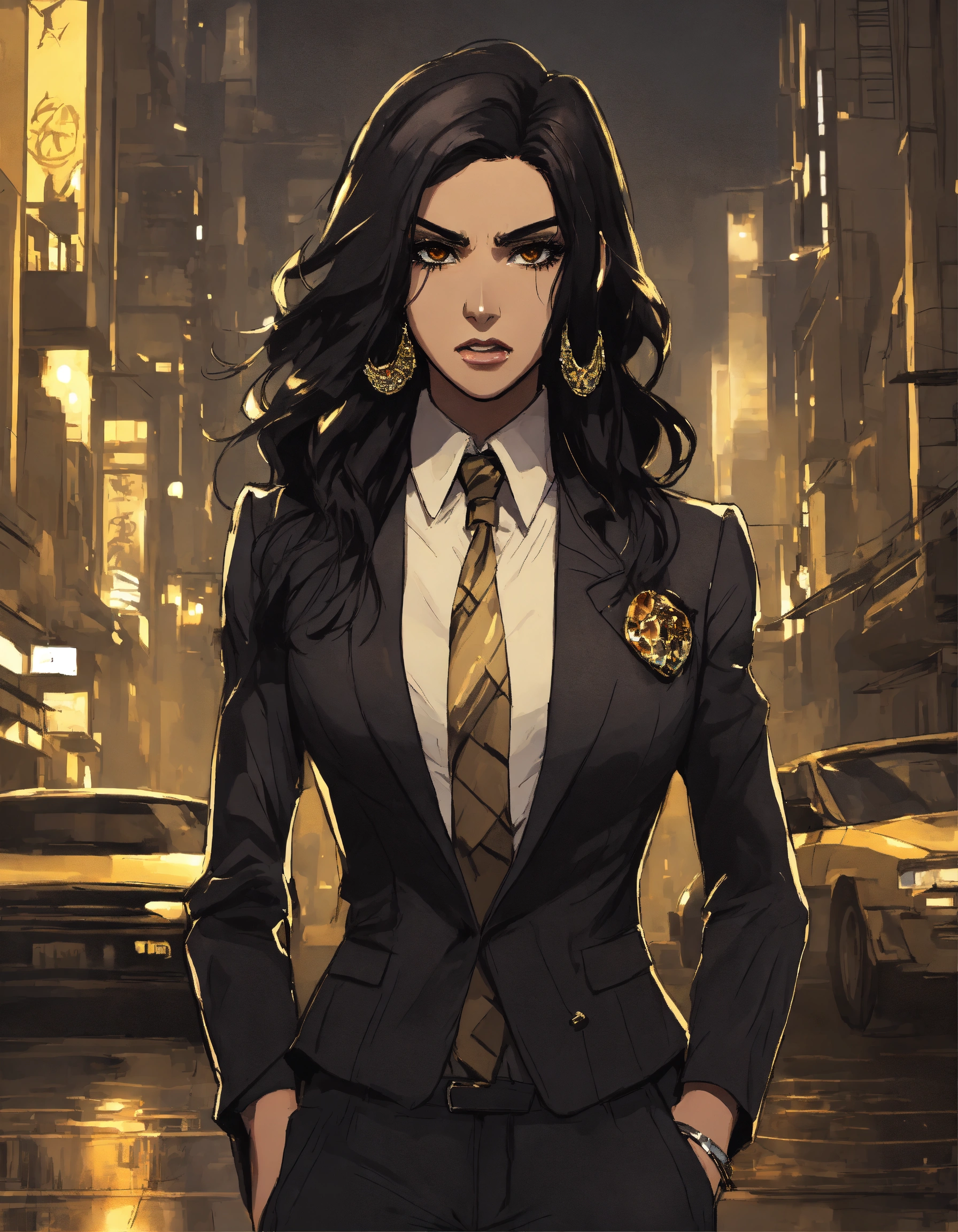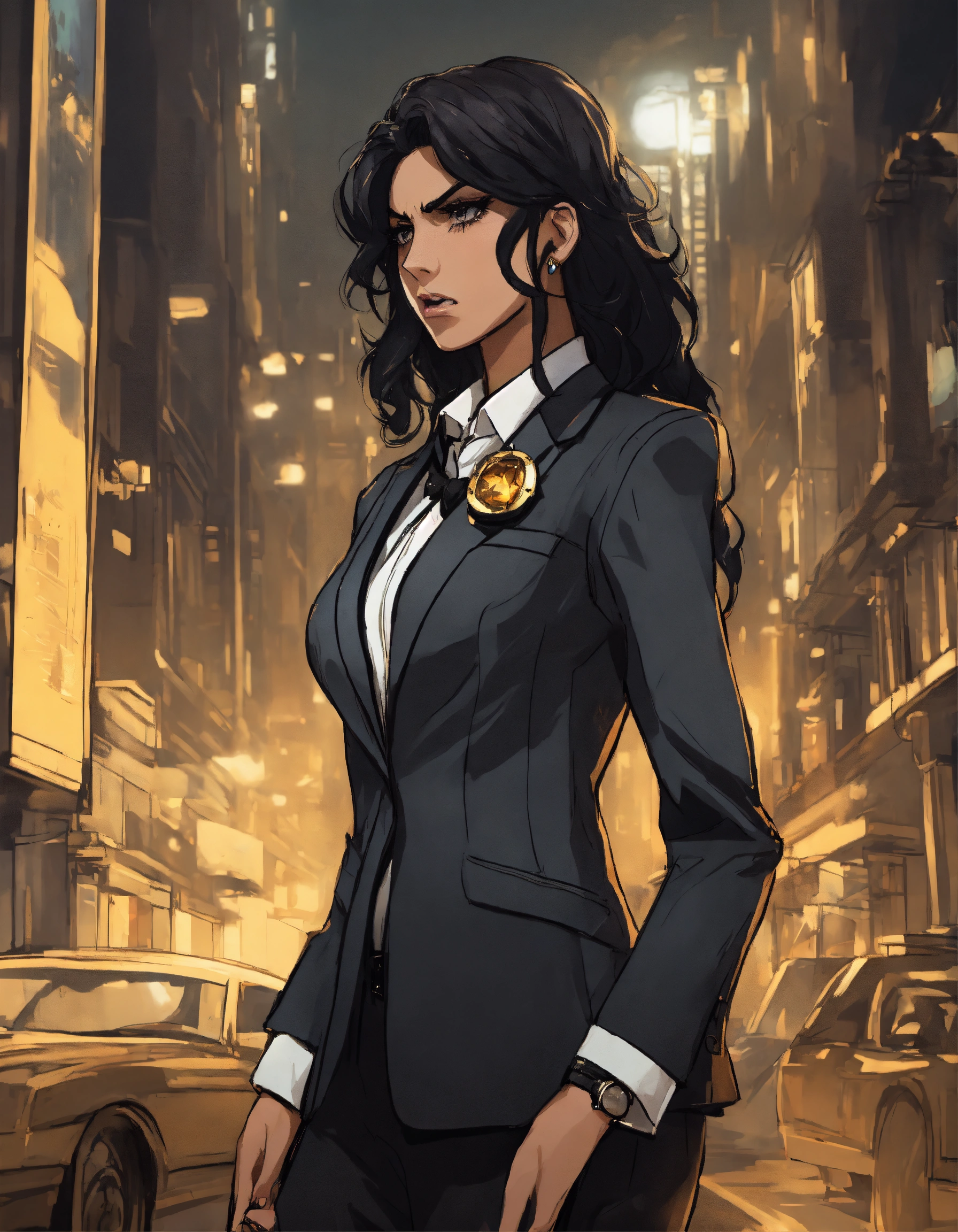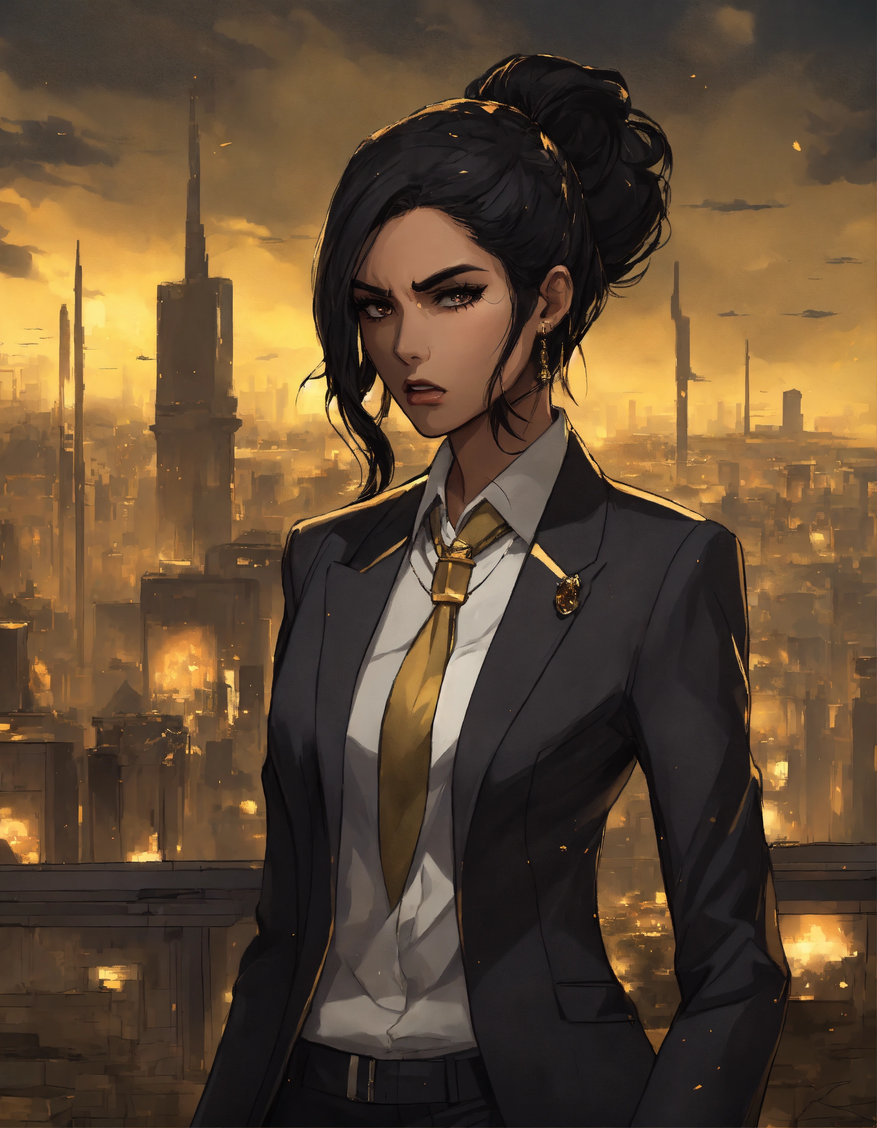 Angry beautiful middle eastern businesswoman wearing a black and pale citrine business suit and broach and dark hair, in a dark dystopian city, anime art style, very detailed.