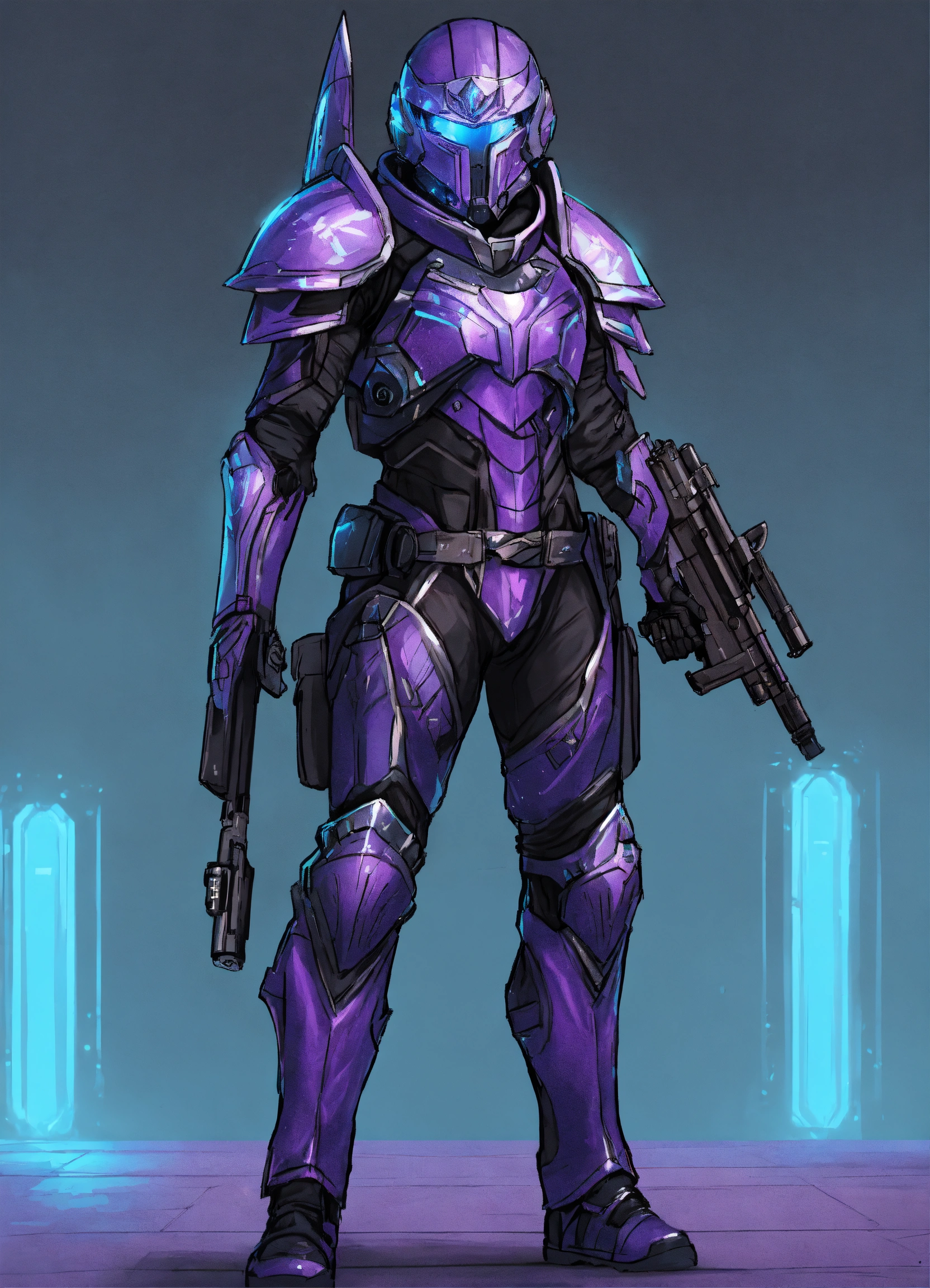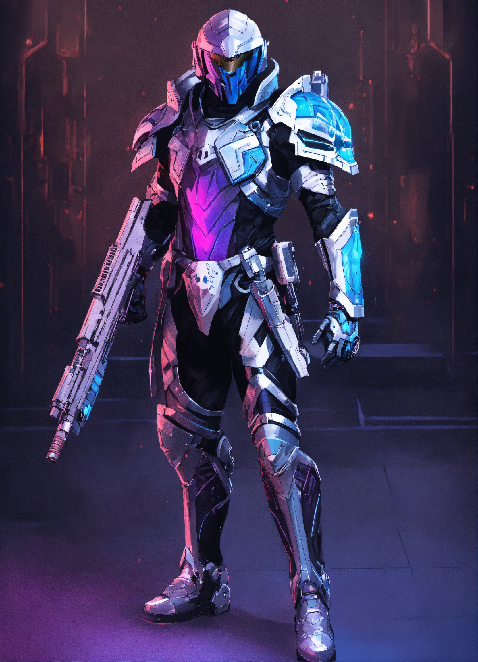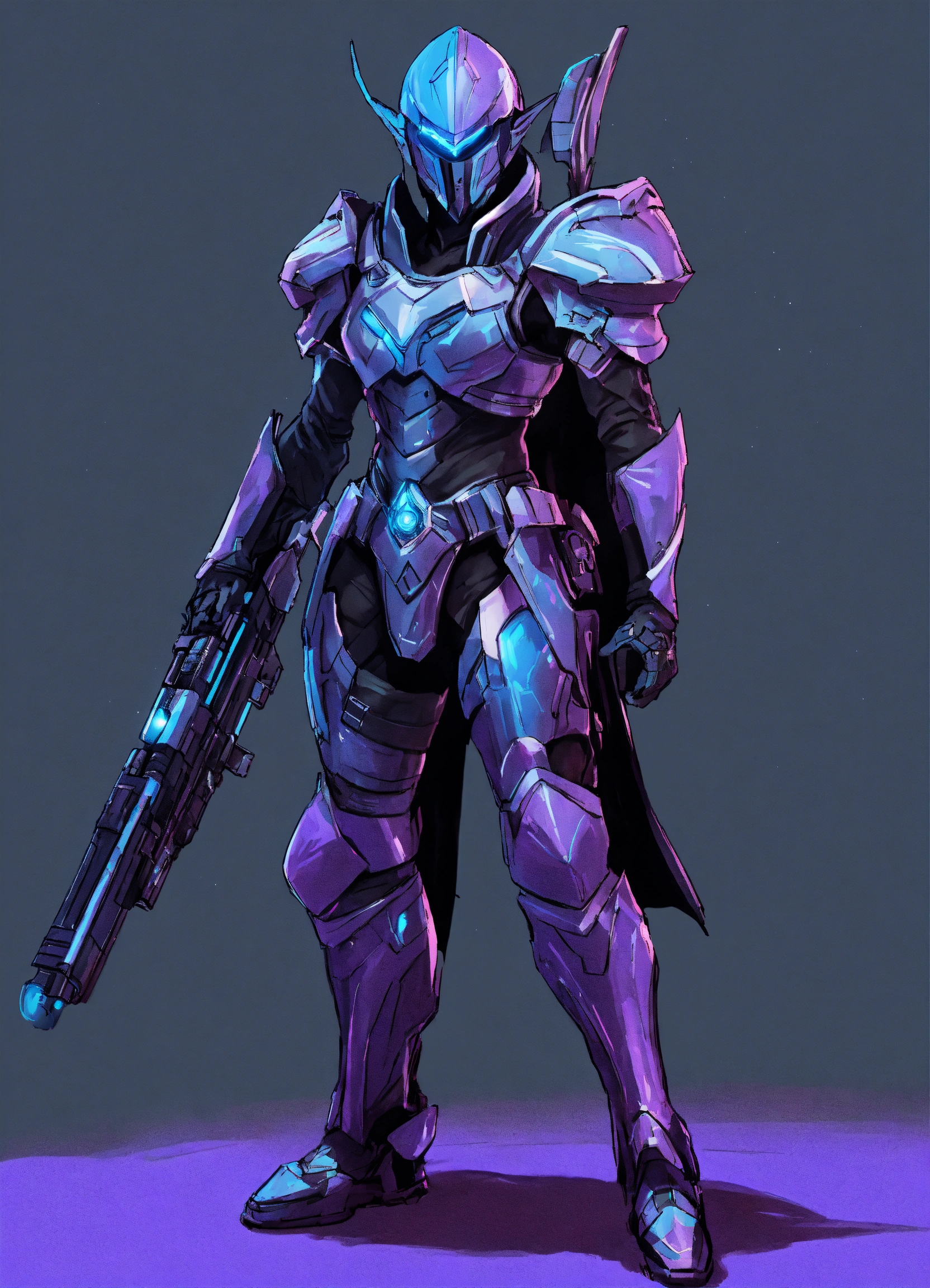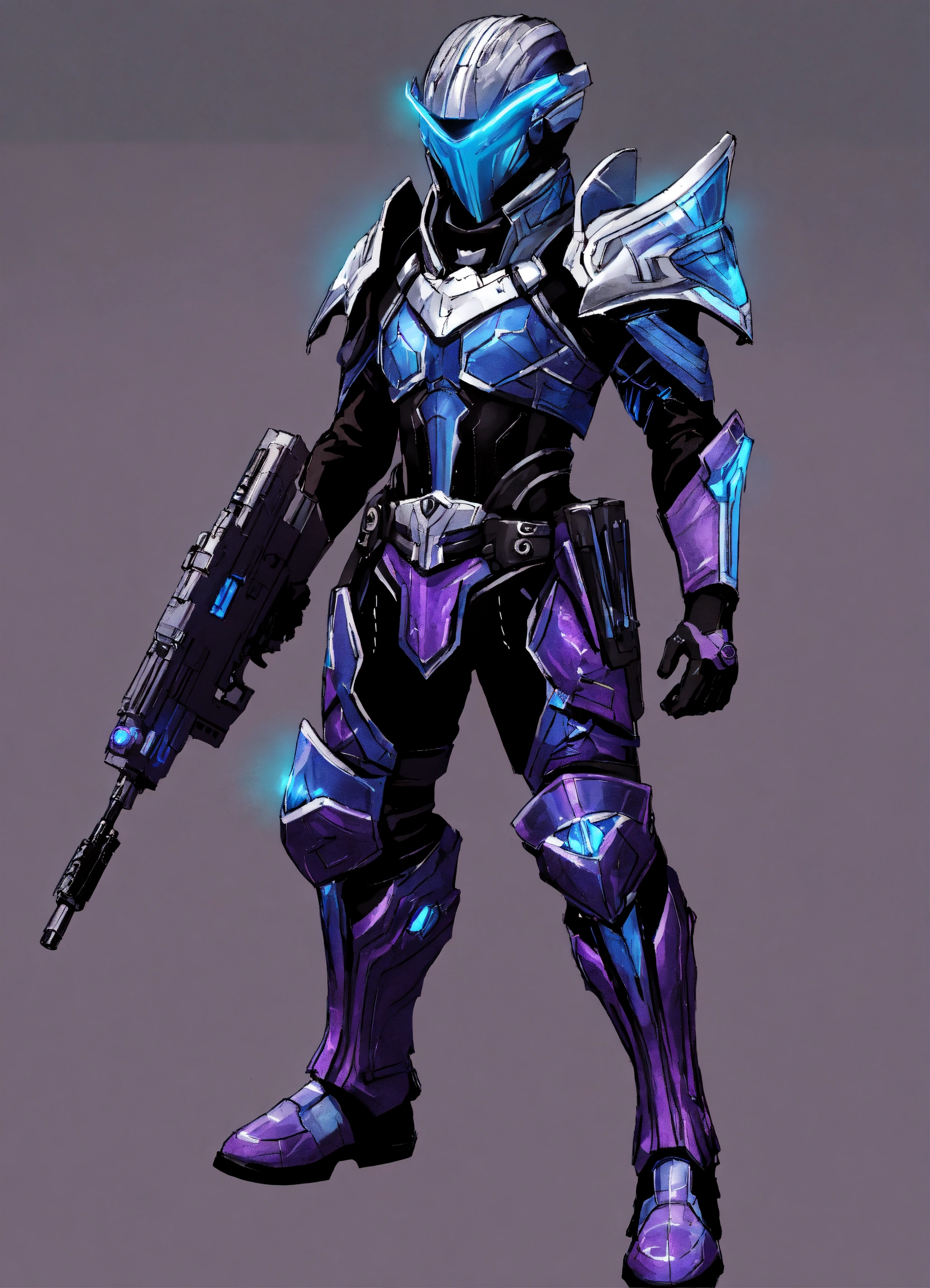 Drawing of a full body of a high elf sci fi soldier wearing heavy sci fi elven armor, cybernetic black and purple and light blue armor and helmet, boots, male, holding a light machine gun with both hands, full body, hd