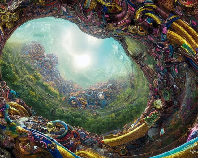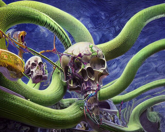 Hyperdetailed maximalist artwork by fatheat inspired by oozium, artstation, 8k 4k 64megapixels seen from below, ant's eye perspective, focus giant floating alabaster skull drapped over with 1000 twirling emerald snakes, unreal engine 5, surreal render, slightly blurry speedpainted minimal swiss landscape below in the style of loish and holosomnia, unrealistic harmonic colors, sundown