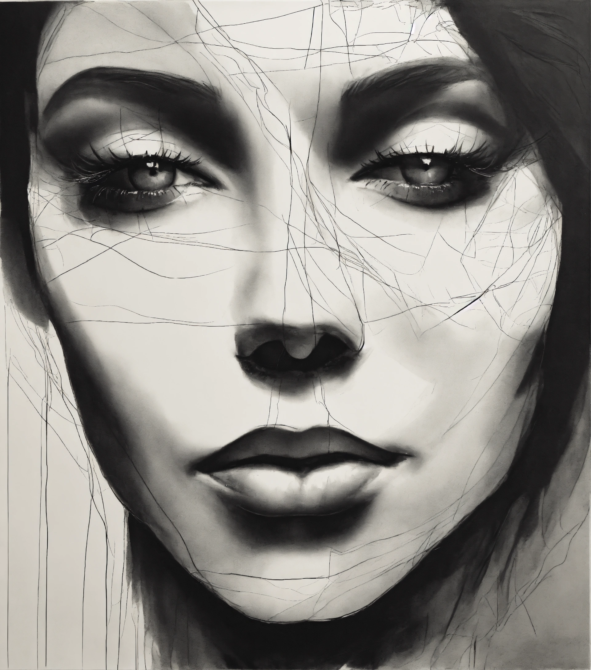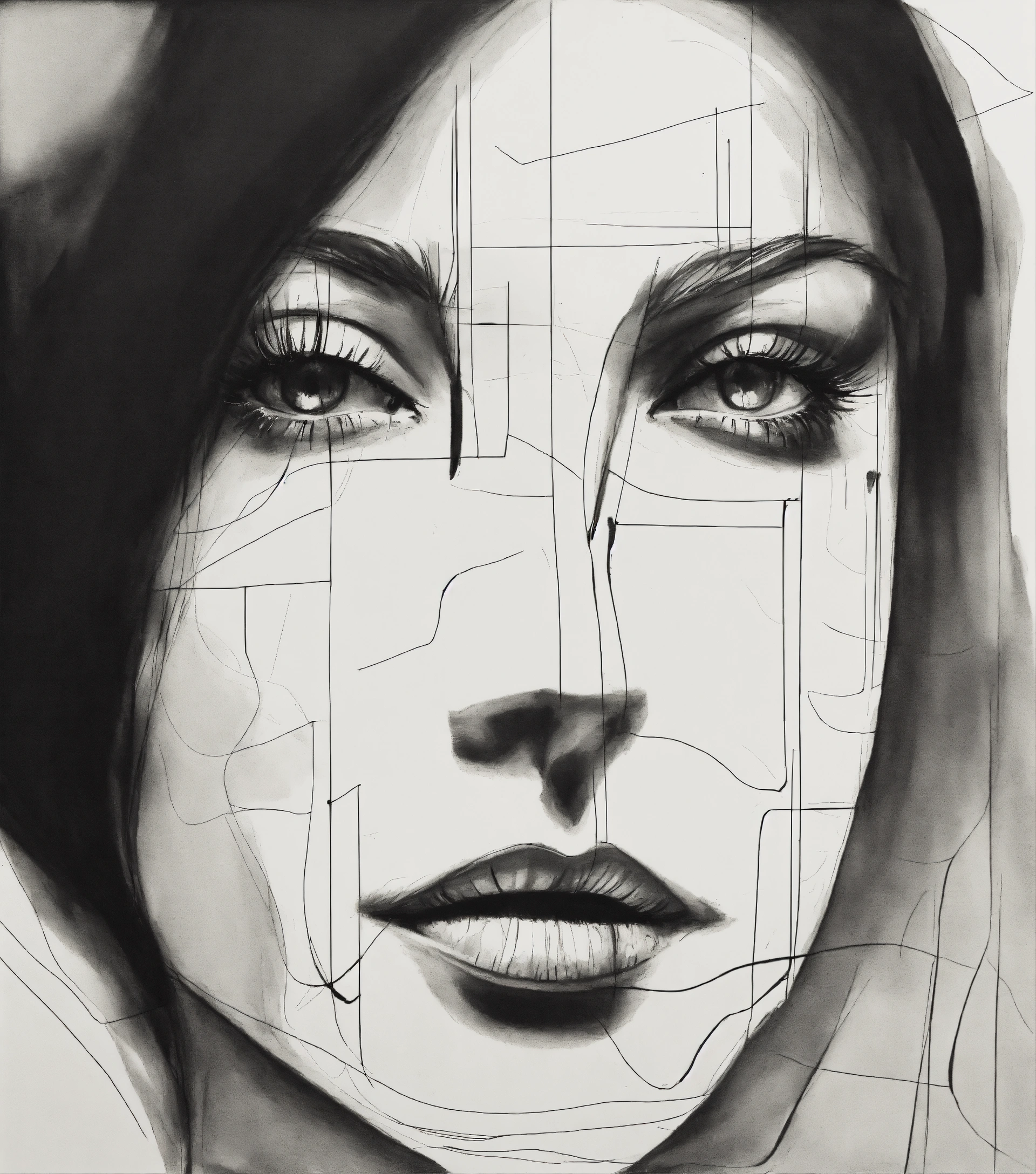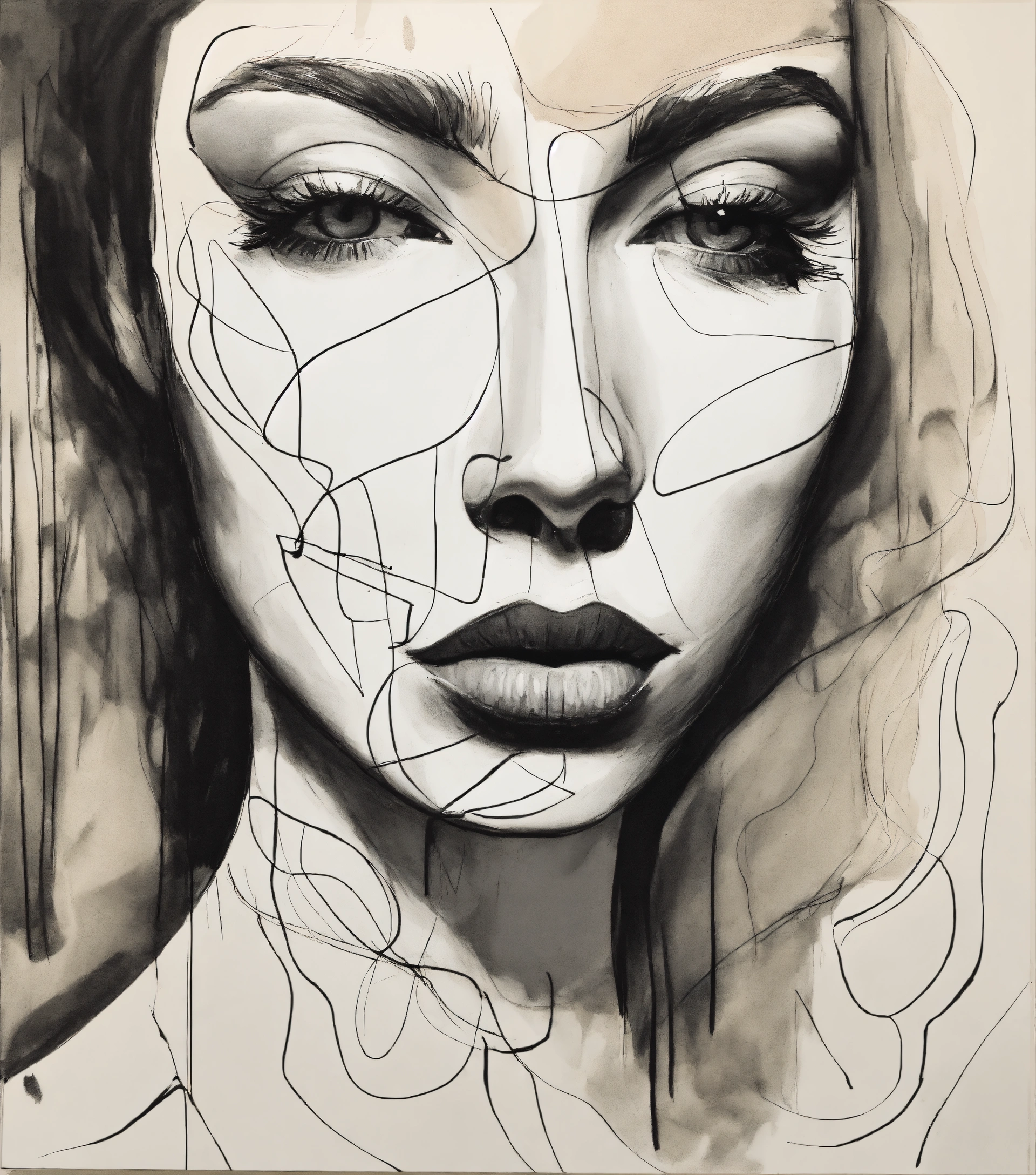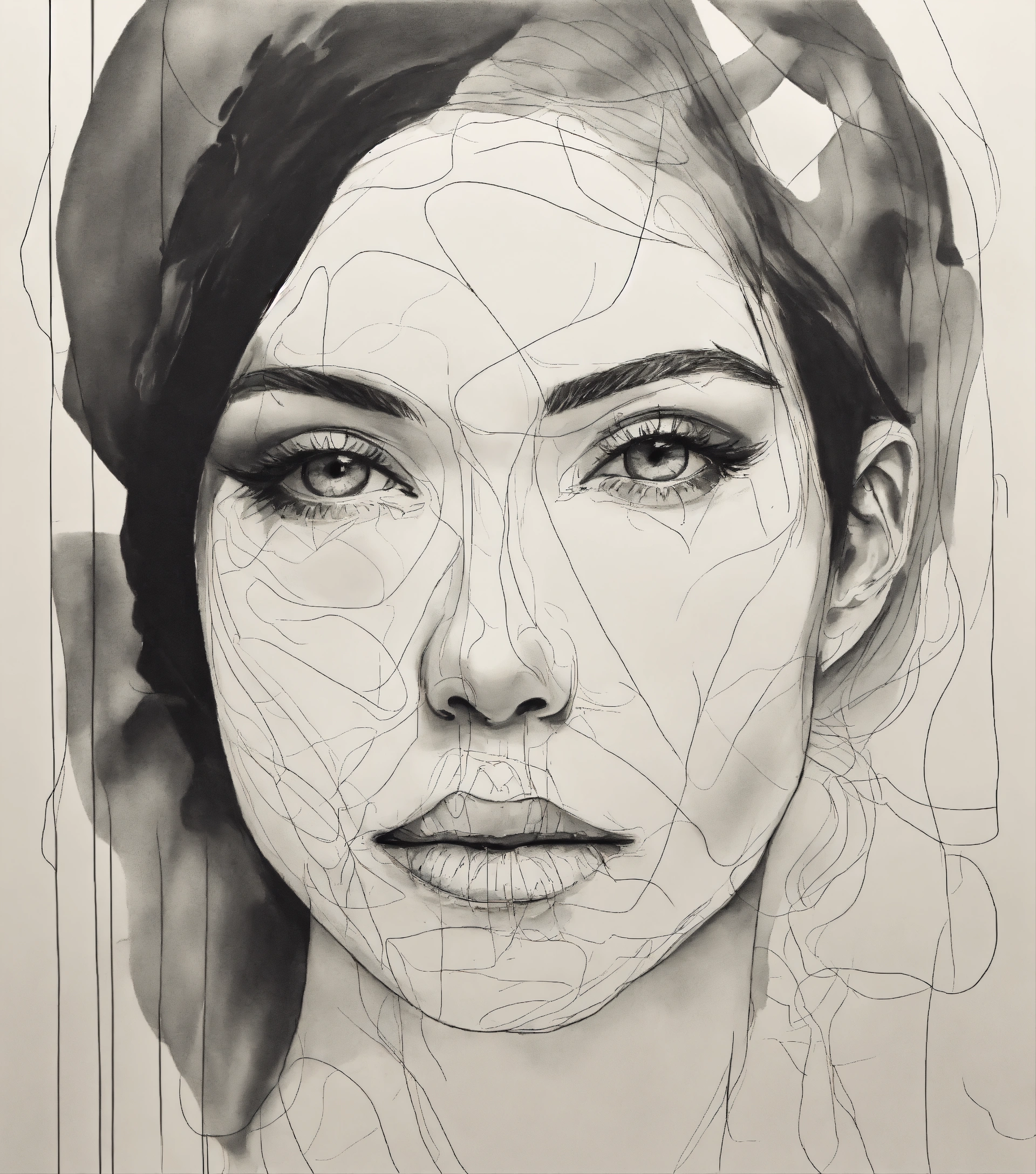 A black and white drawing of a woman's face, a minimalist painting, vorticism, minimalist, biomorphic, one line, texture stroke