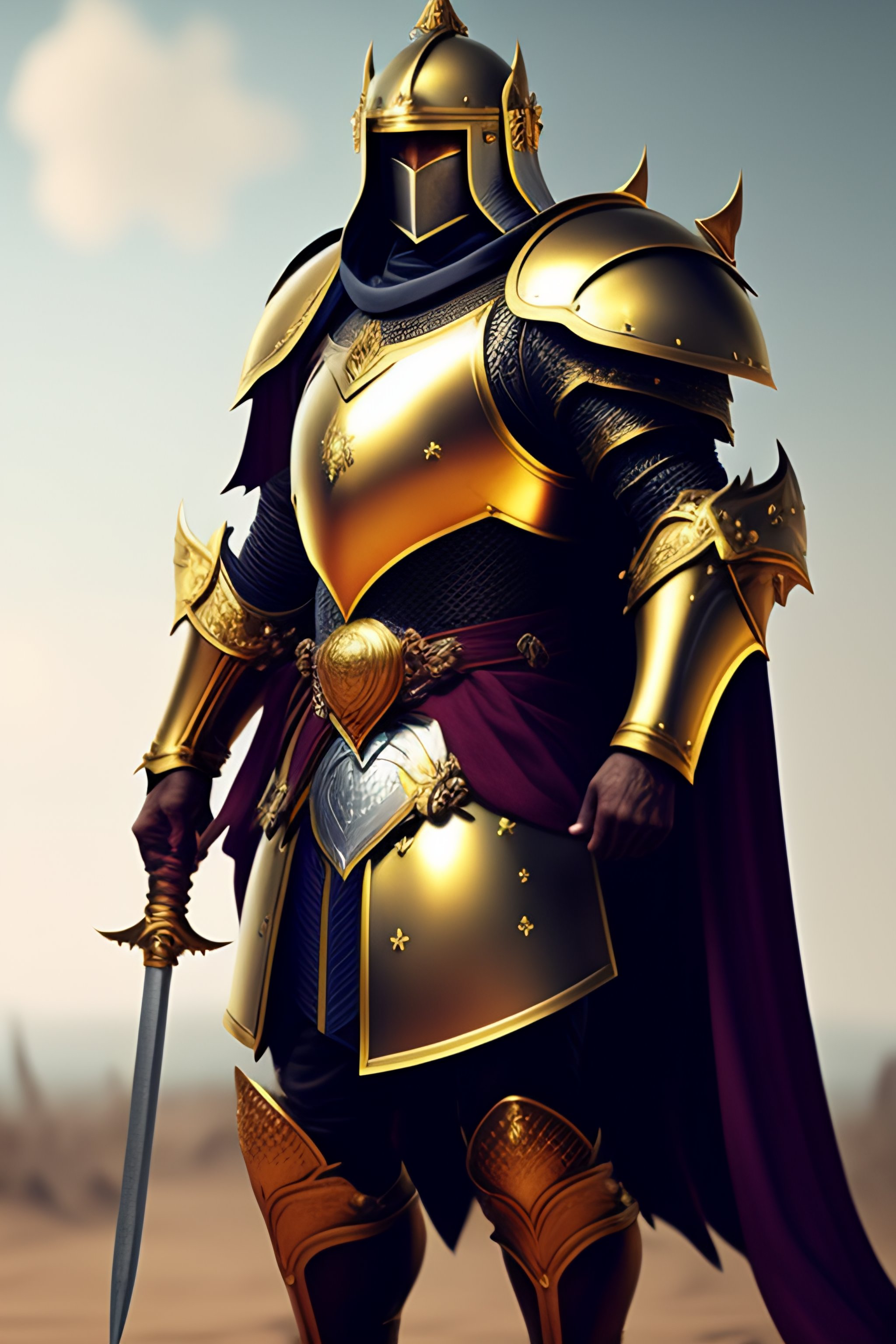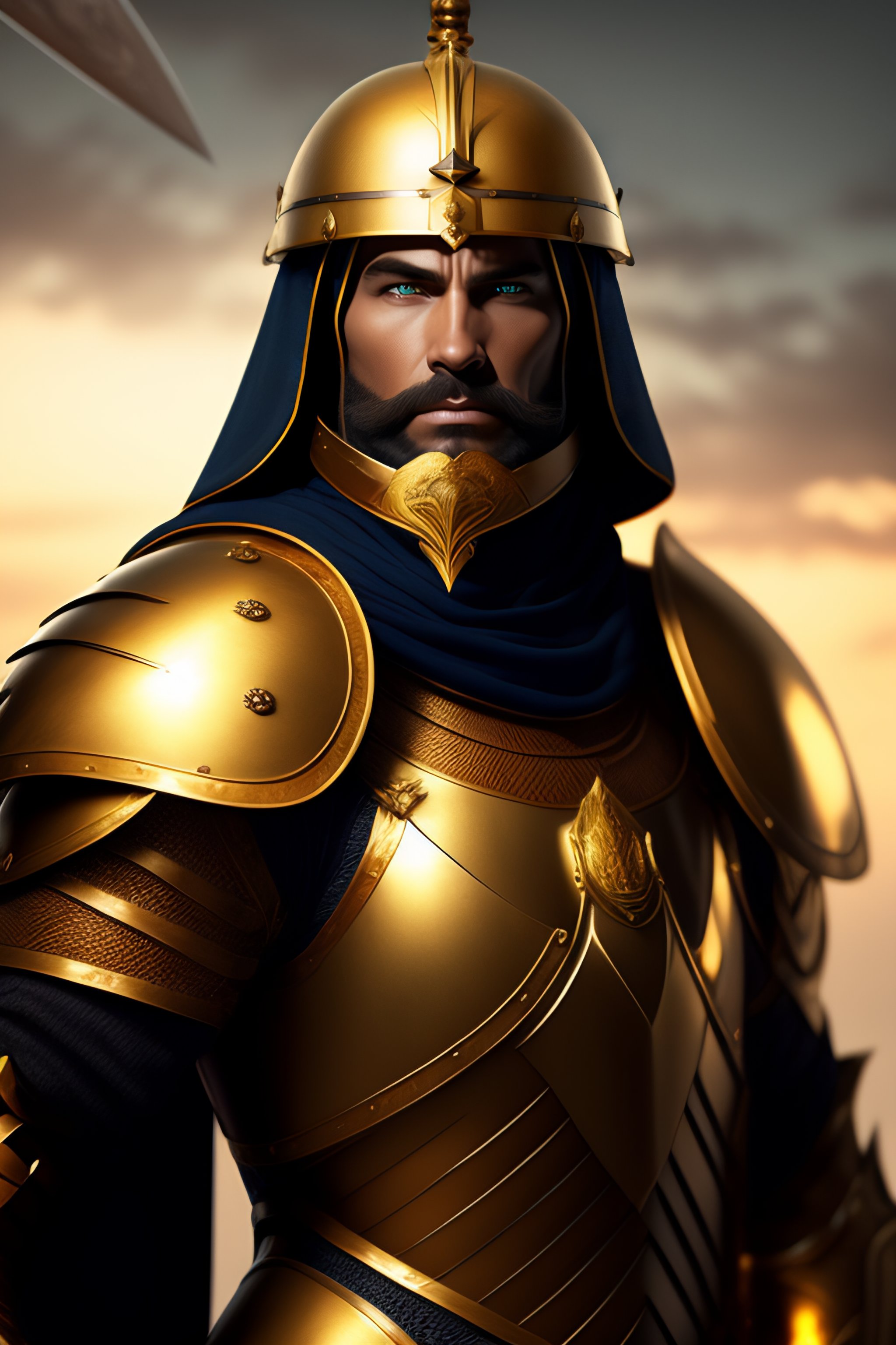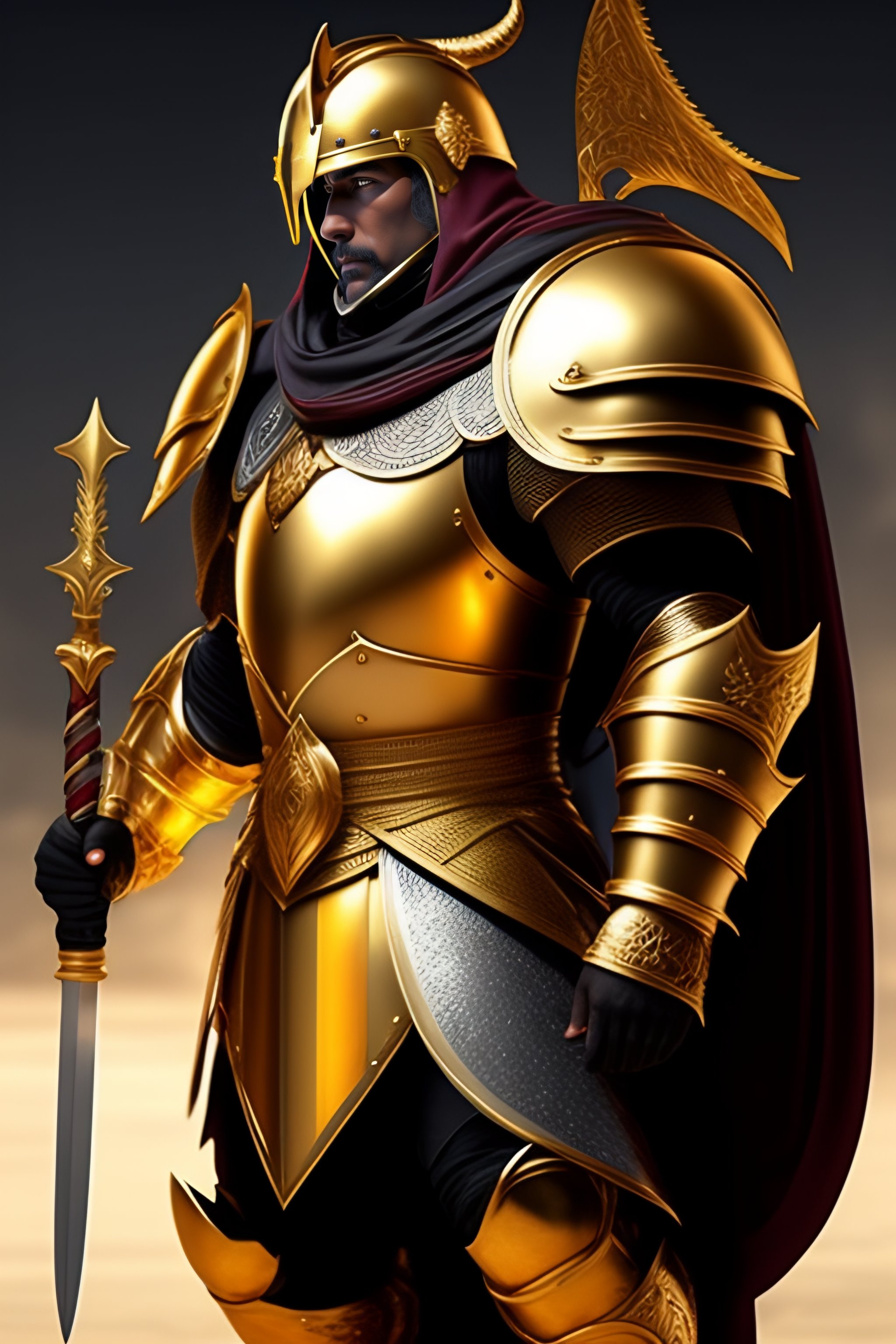 60 year old male human, using a golden full plate armor, a golden helmet, with a polearm glaive on his left hand, paladin, knight