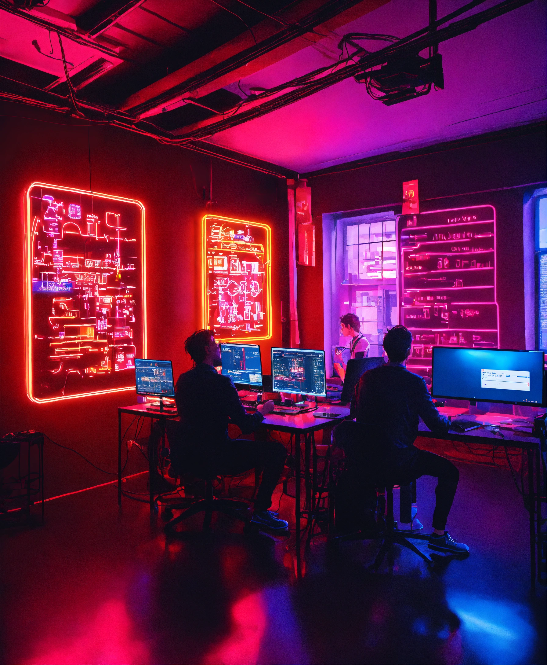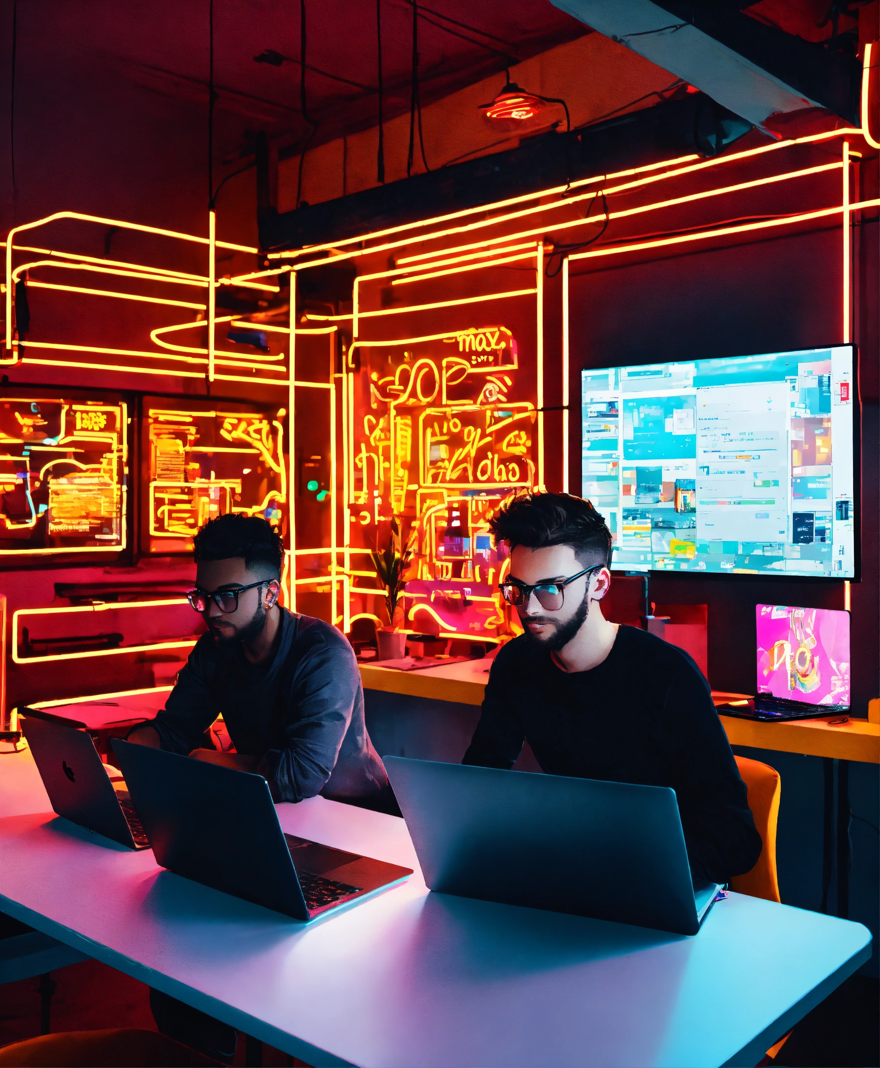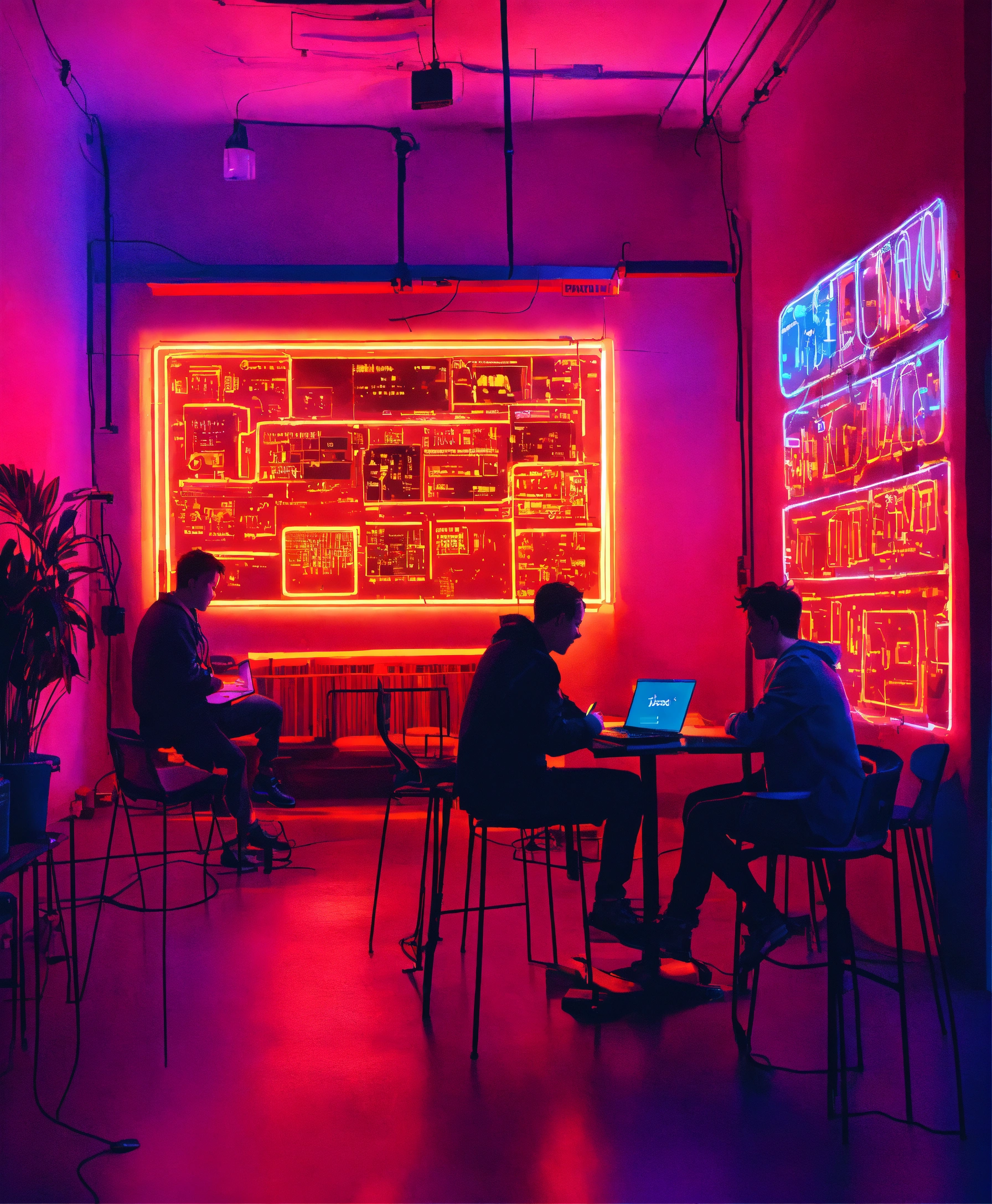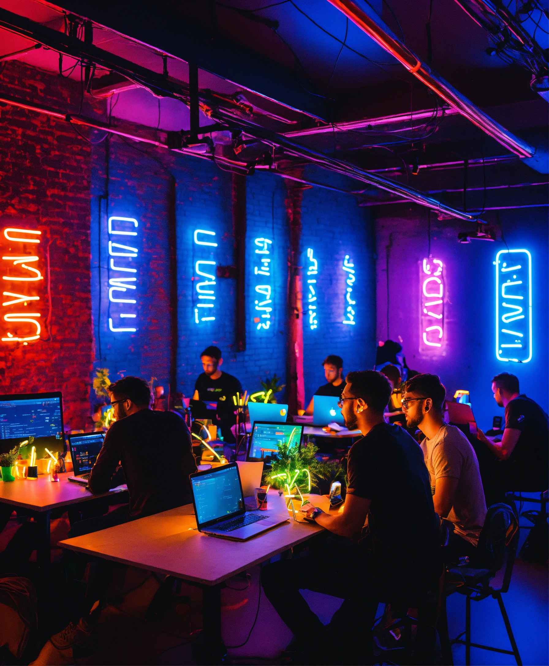 Startup developers with laptops in a light filled room with neon signs building software