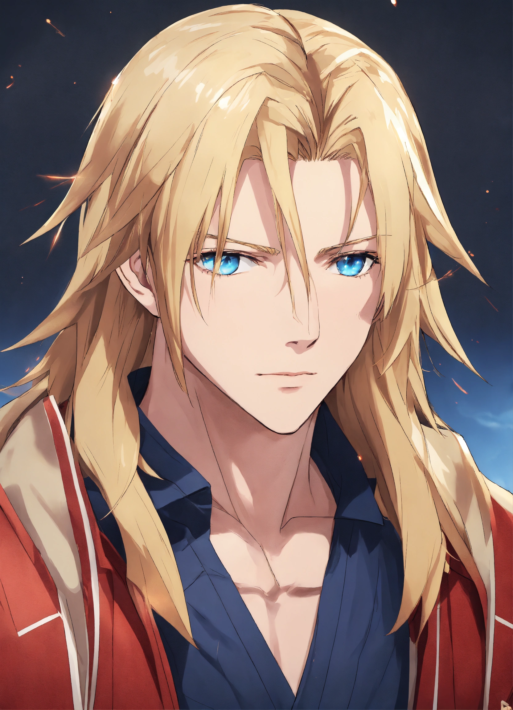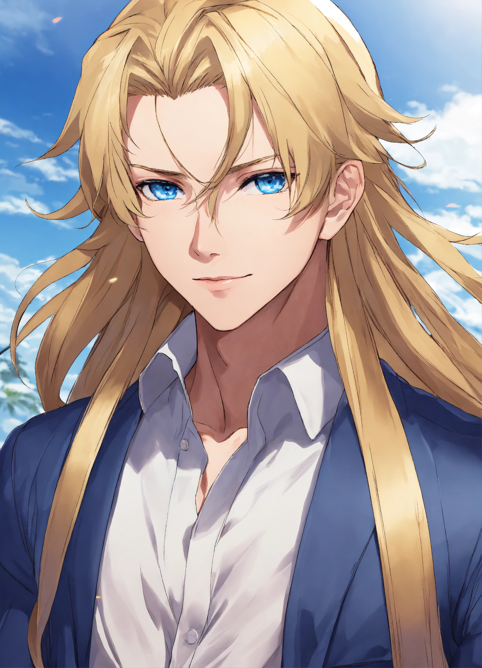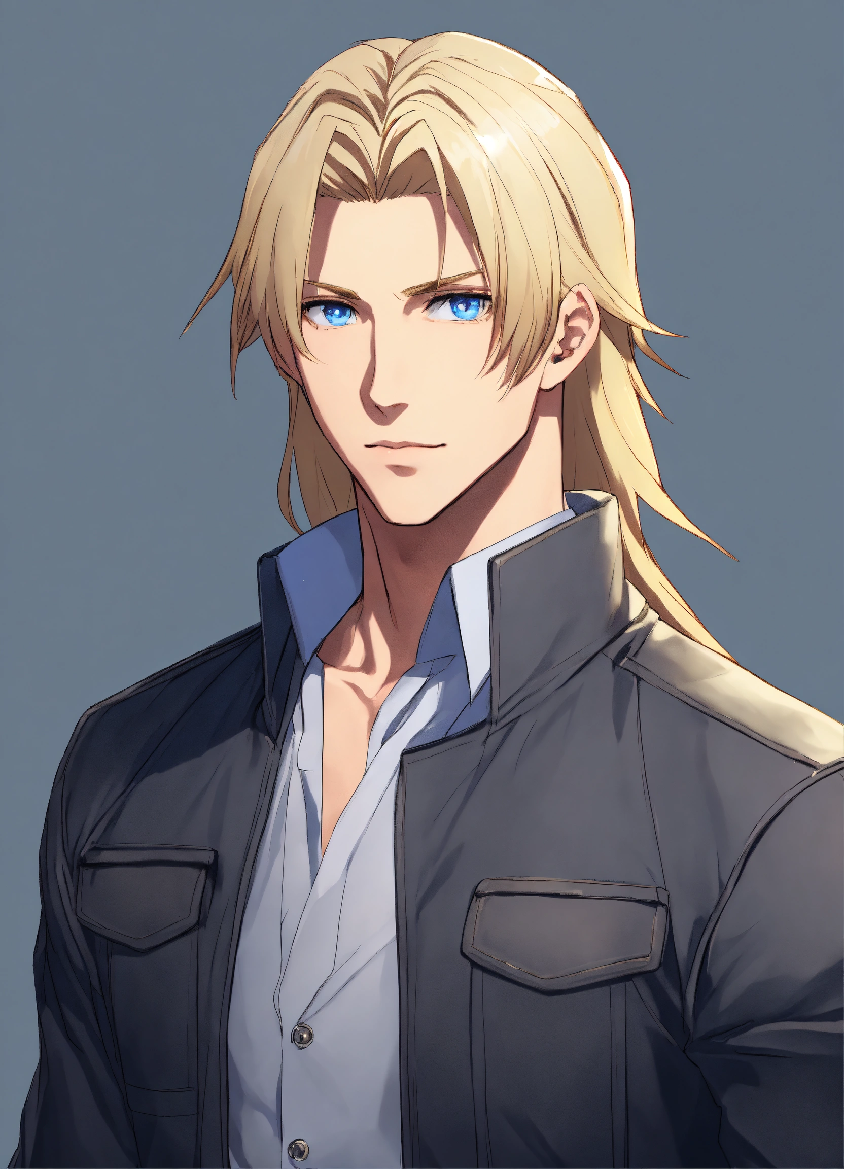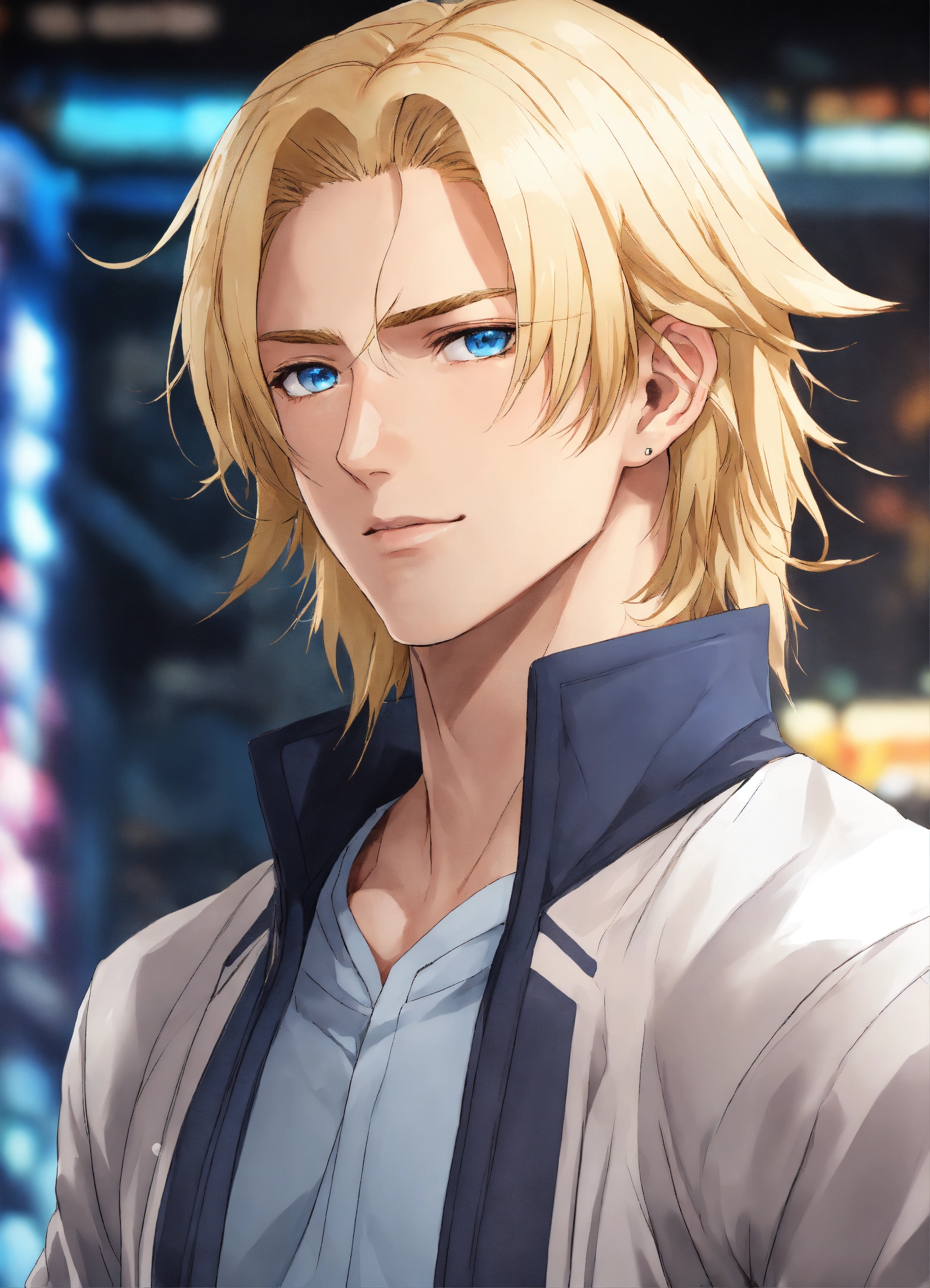 Man, 30 years old, blond, shoulder-length straight hair. blue eyes. athletic build. height 190 anime reskin style