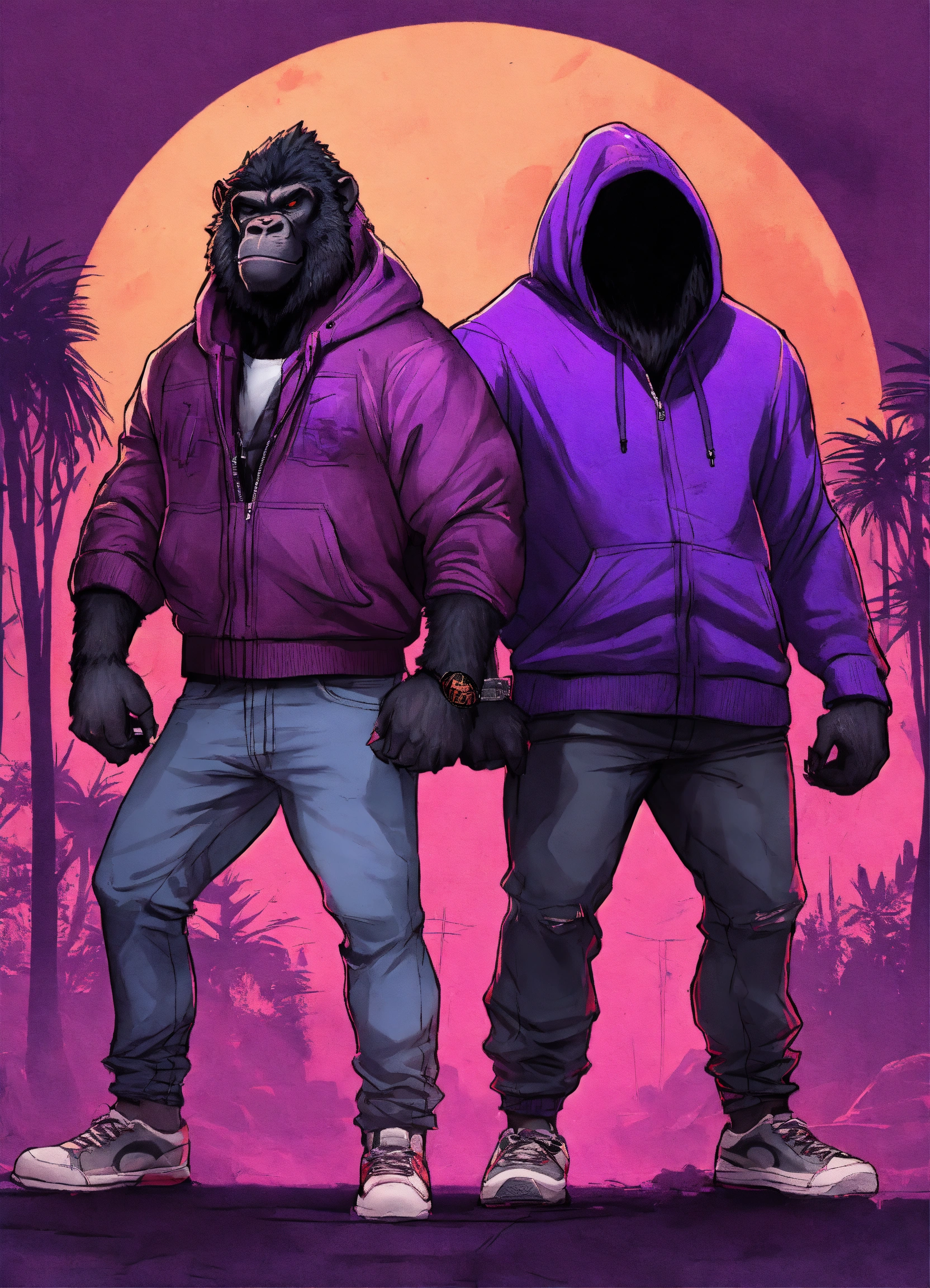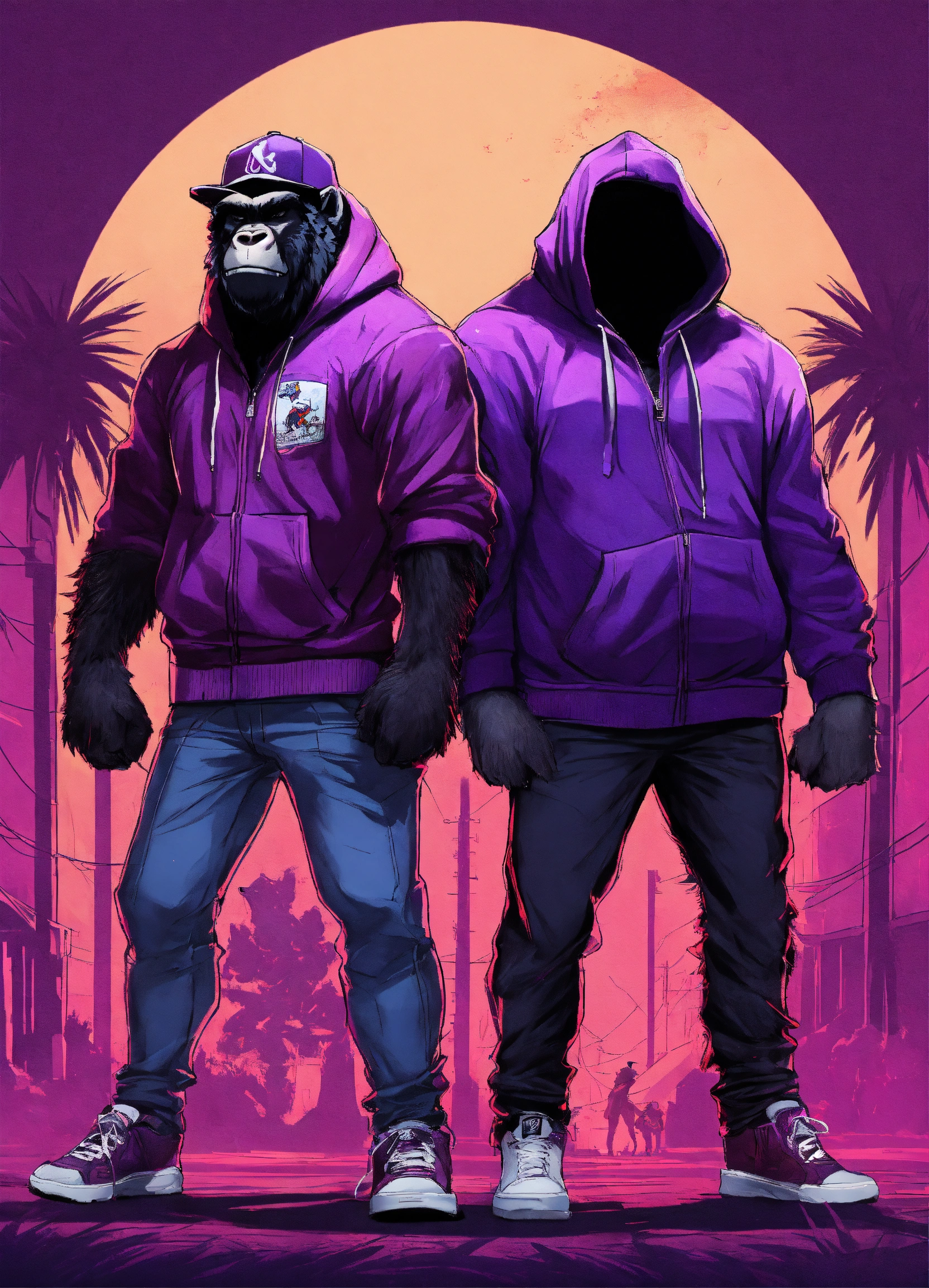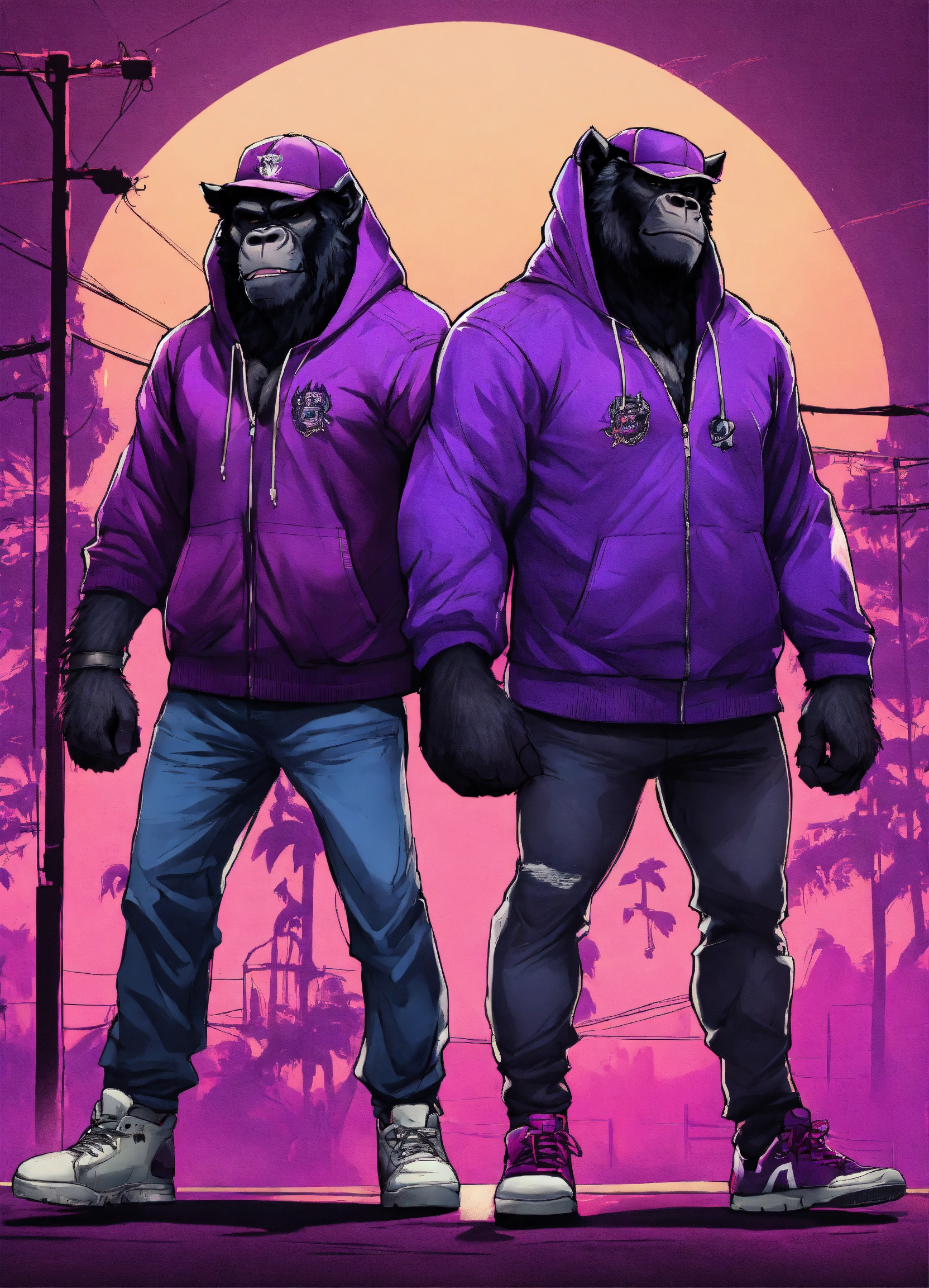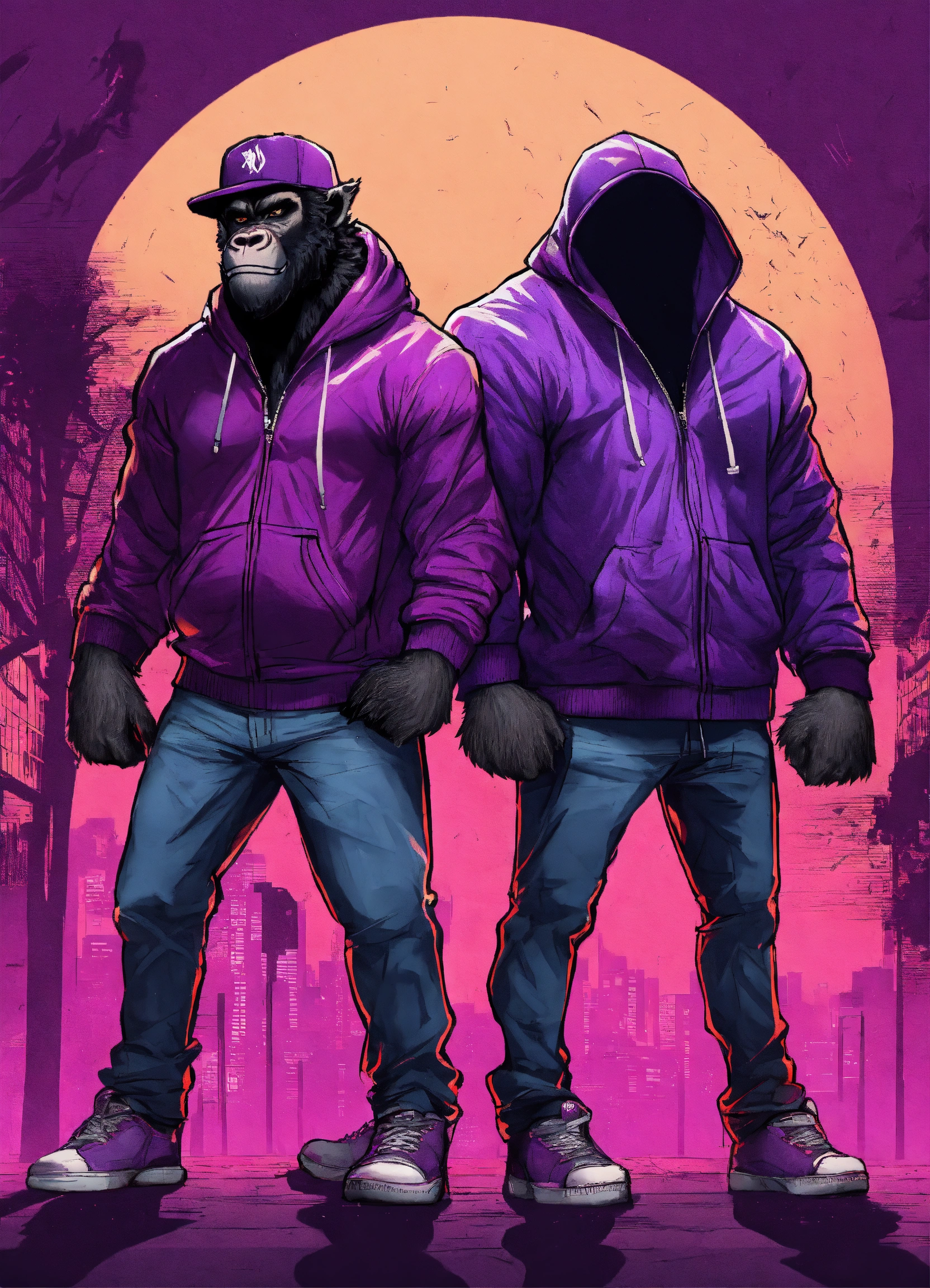 Gangster werewolf and a gangster gorilla wearing hoodies and baseball cap purple standing back to back