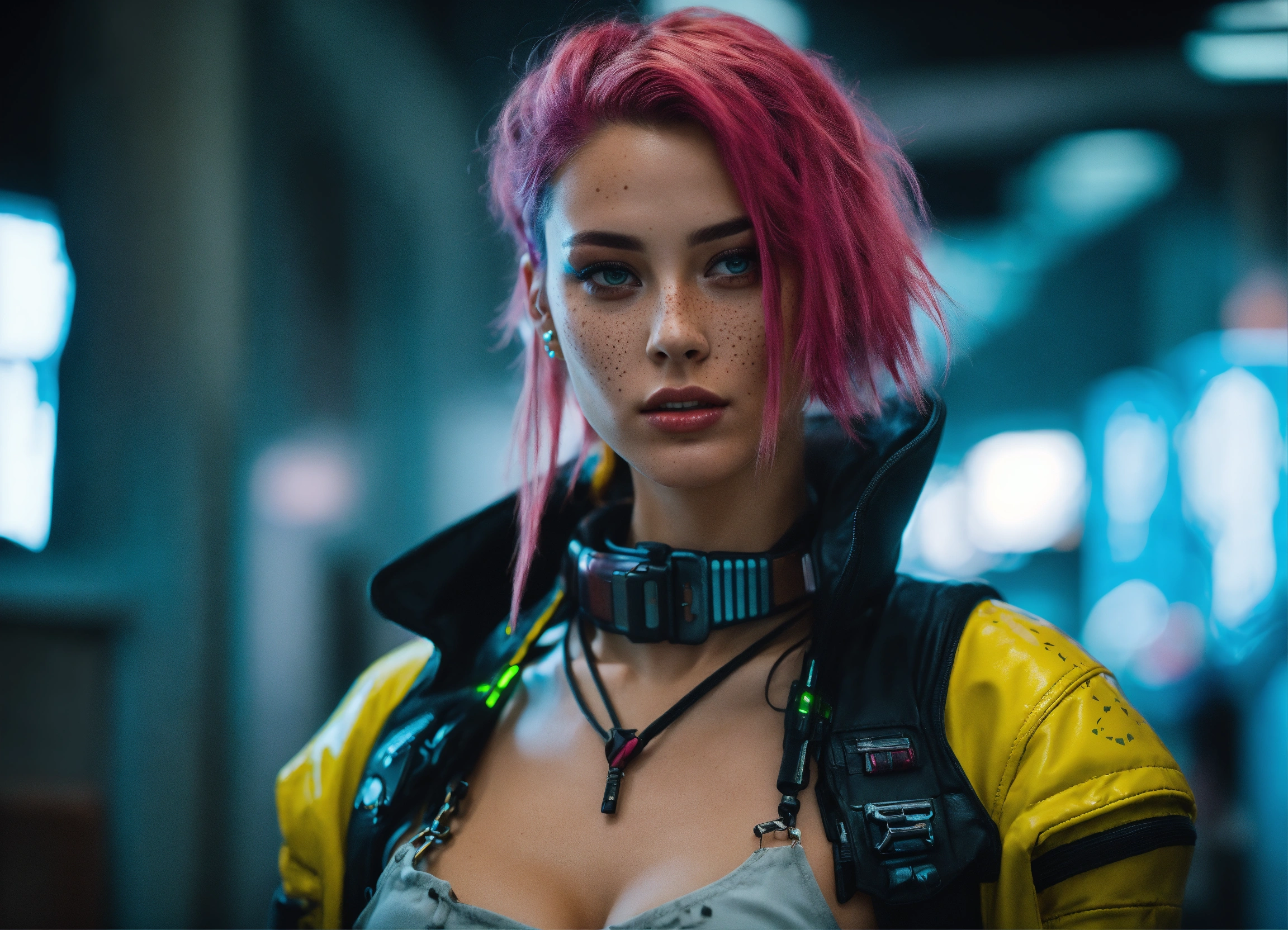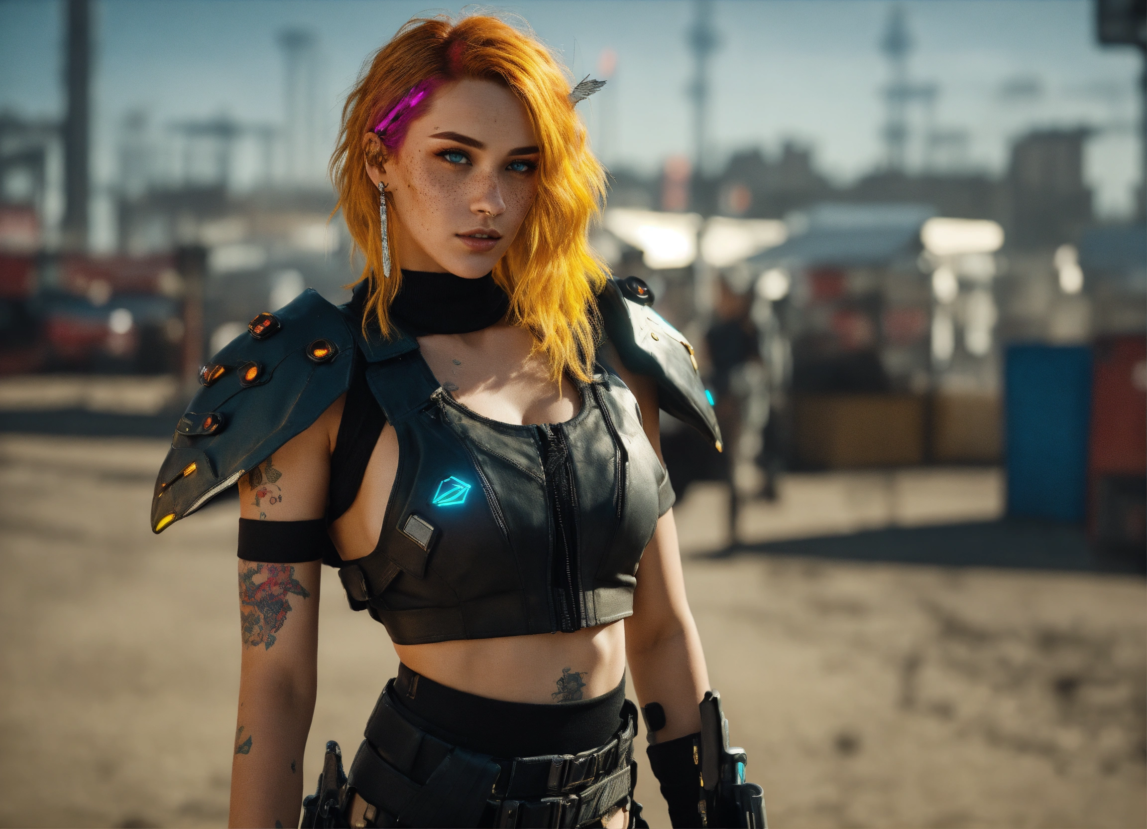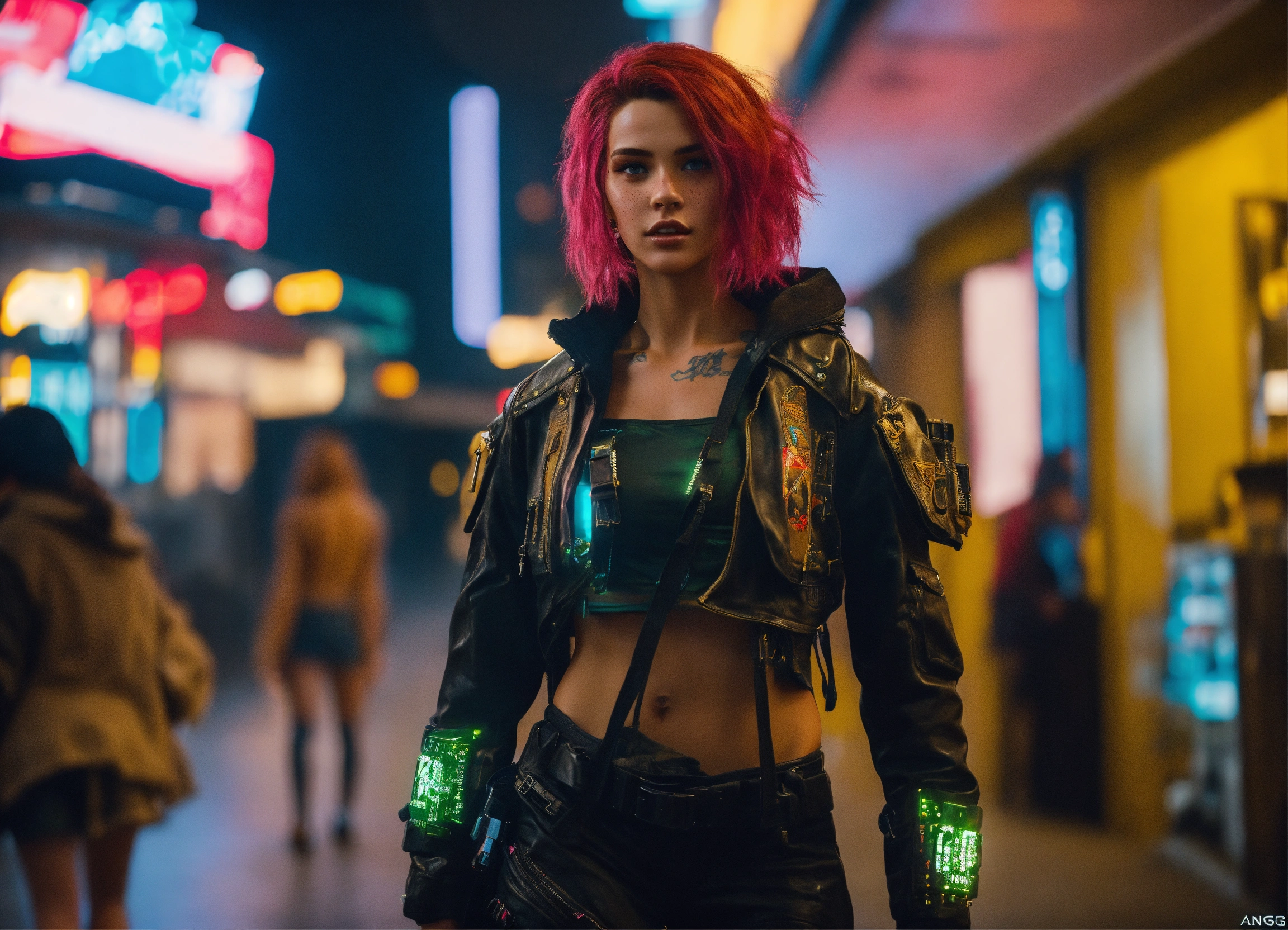 Real life photo of a supermodel with freckles full body front view 25 year old with big angelwing's wearing cyberpunk 2077 clothes