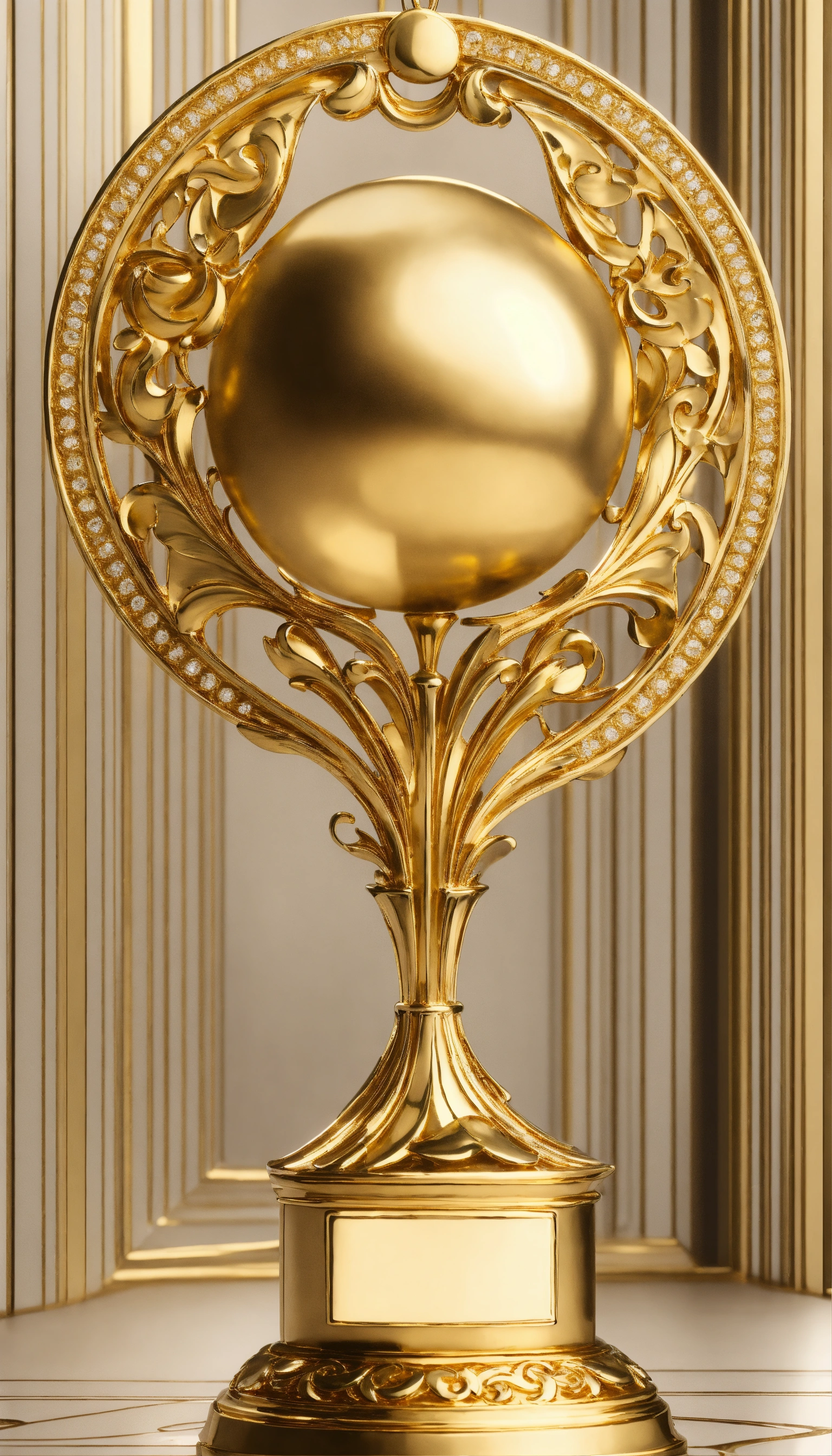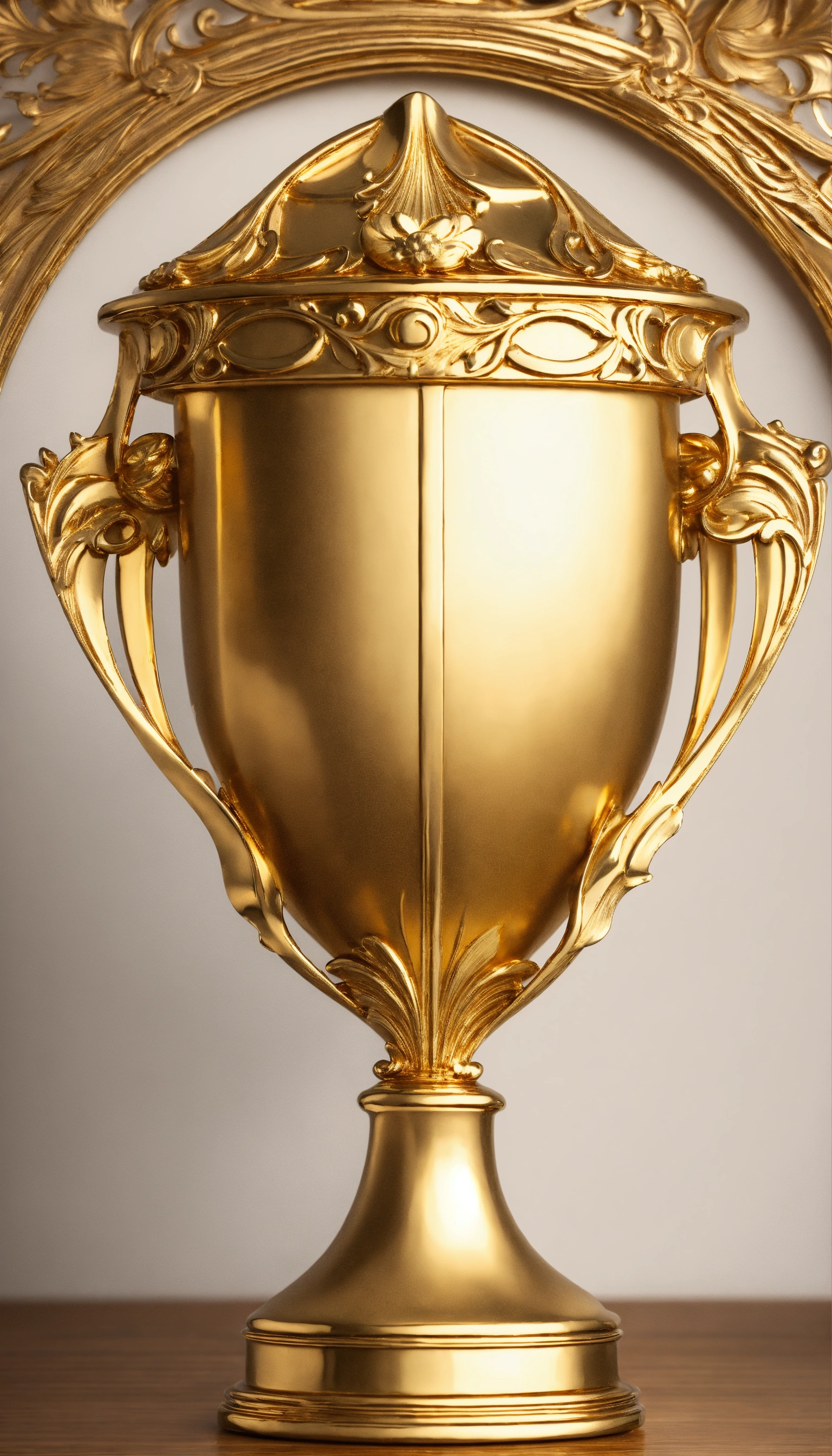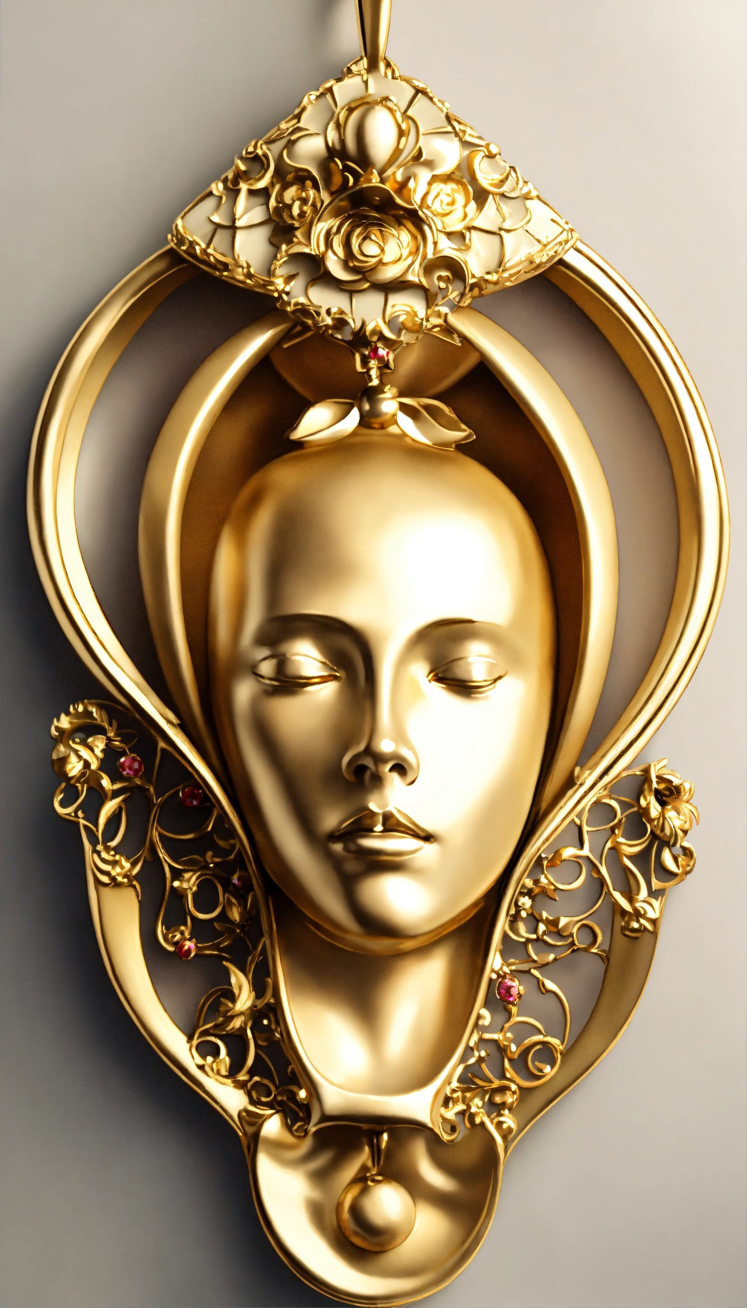 Gold trophy as art nouveau pendentif, hyperrealistic gold material, studio off white photo background