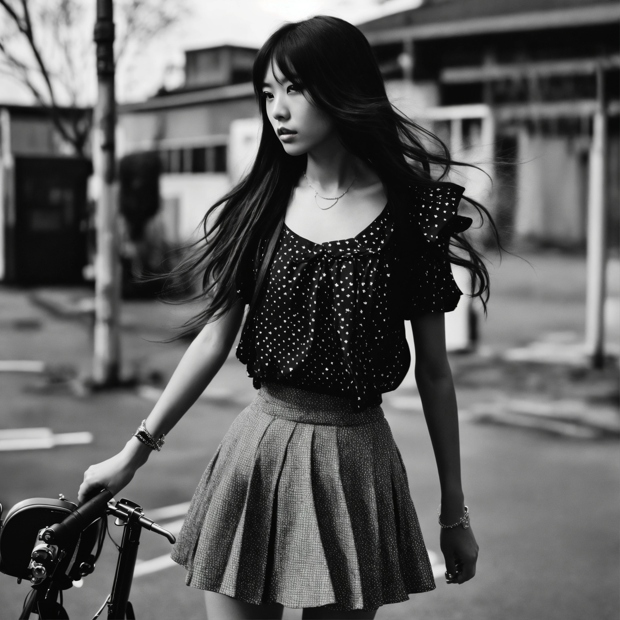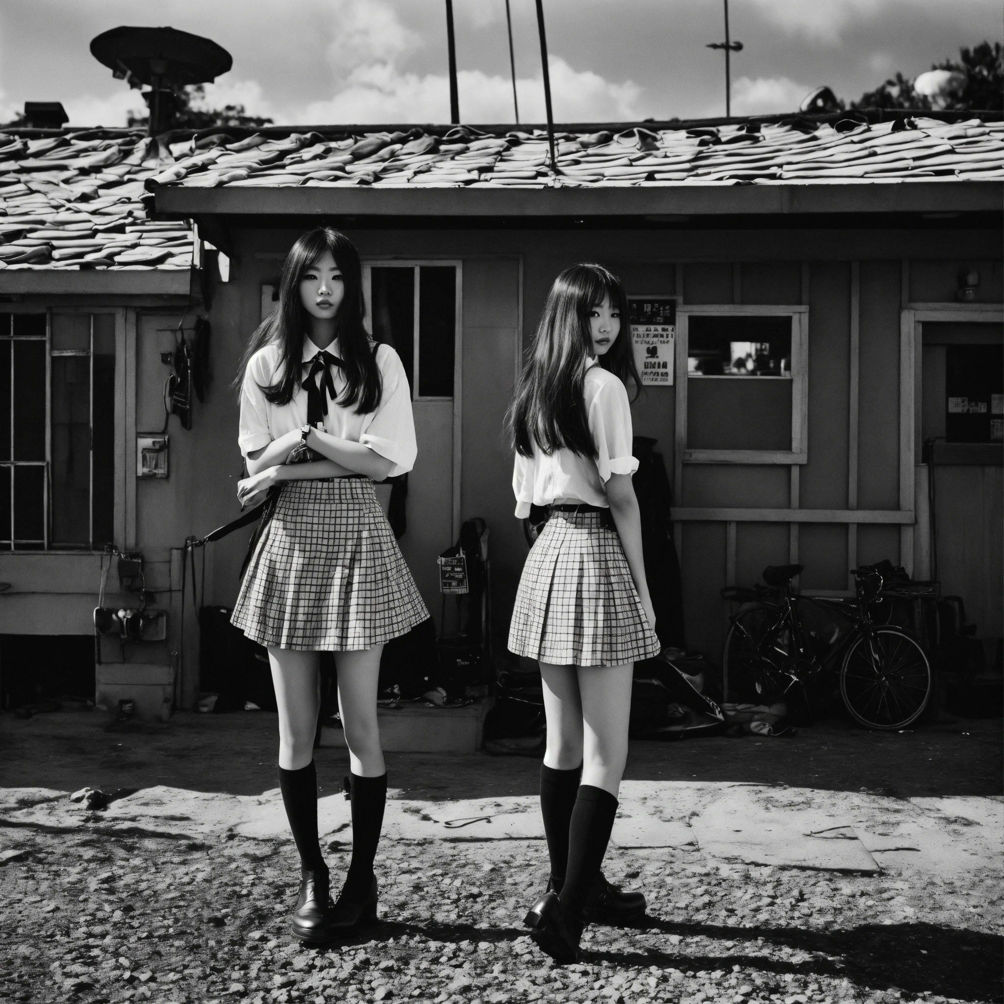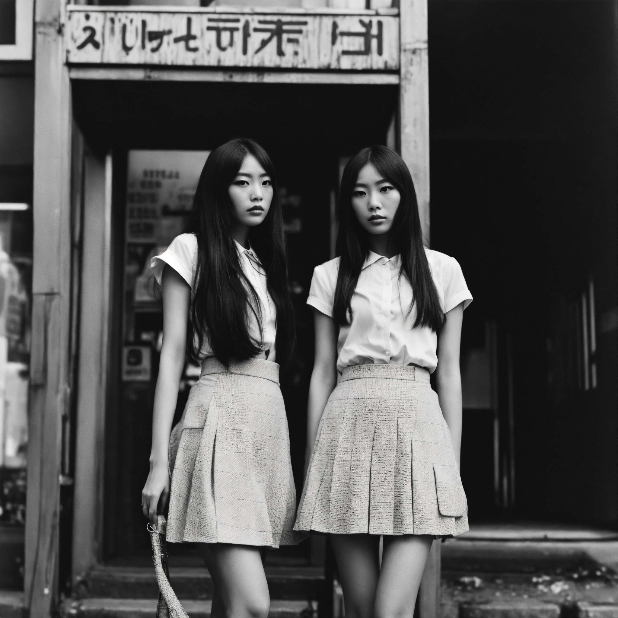 Extremely detailed photographic image, grained image, beautifully composed, monochrome image, contemporary fashionable image, fashionable magazine photography, leica summicron 35mm f2.0, kodak 400tx, fashion photography, fashionable model, two beautiful japanese idol high school girls wearing a mini skirt, with long hair blowing in the wind, both staring into the camera, with no intimacy, a objective close-up portrait like diane arbus