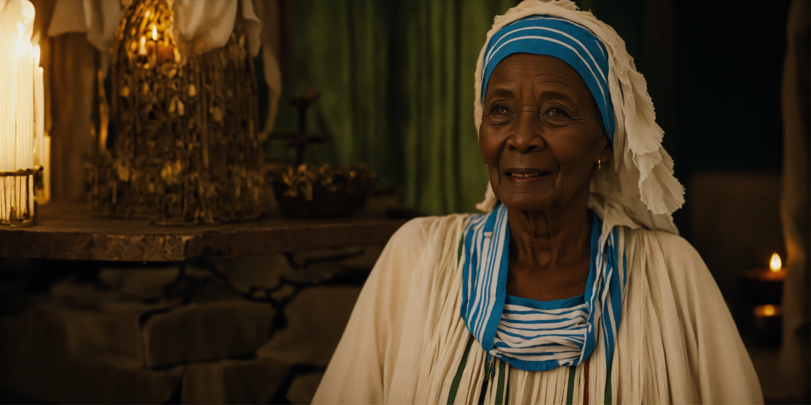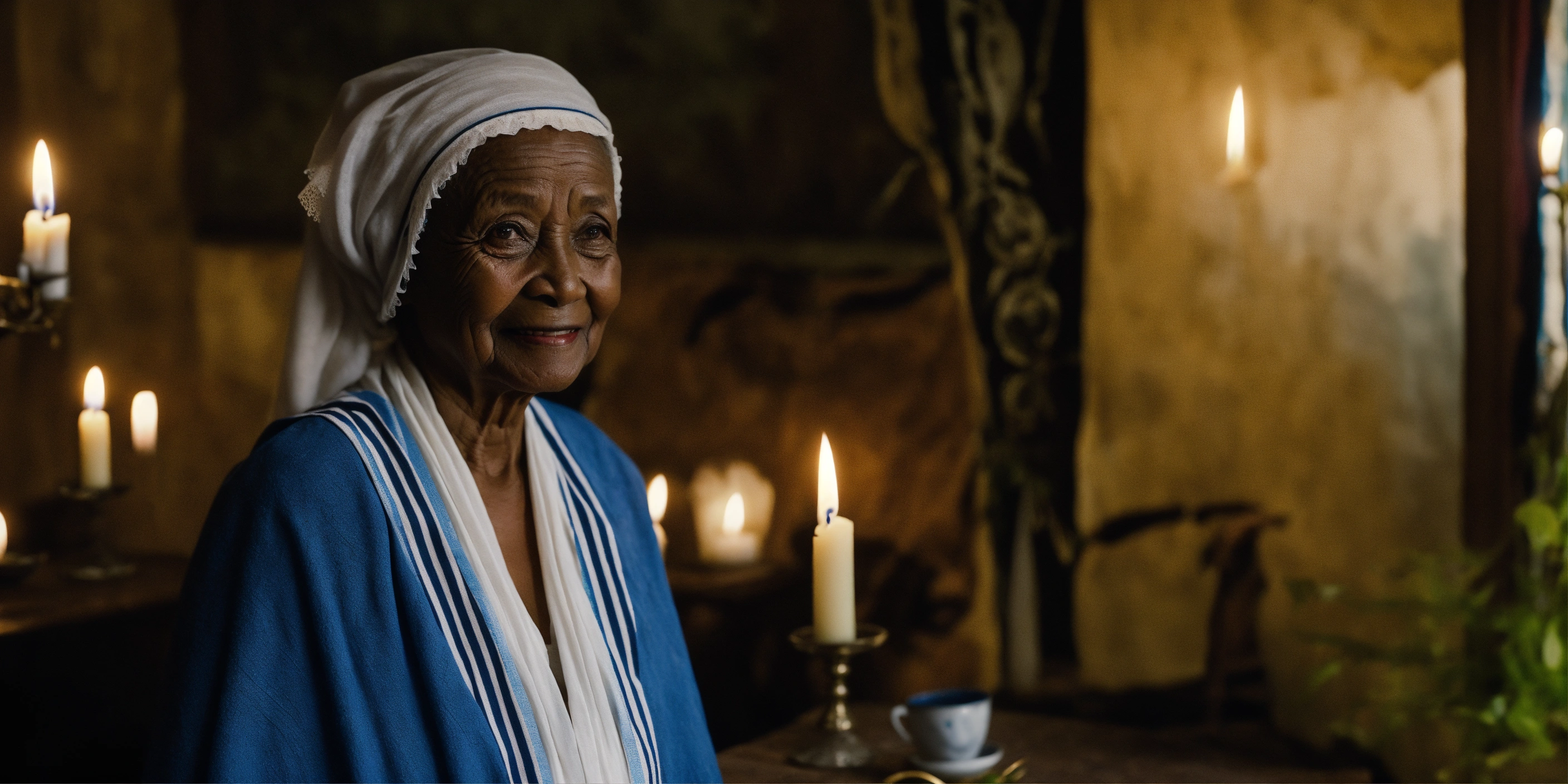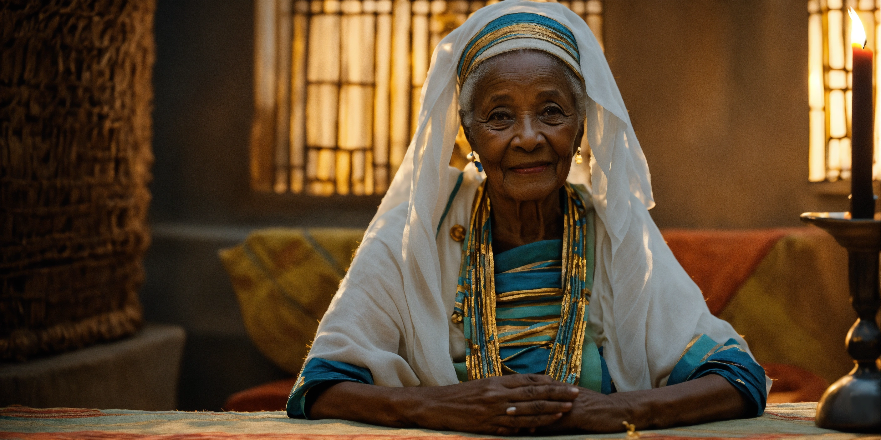 Illustrate a picture of an old woman, a 70-year-old ethiopian black, standing near a table. she is wearing a simple rough pleated white cotton garment and a white veil with blue stripes on its edge. the garments have natural fringes. she has a kind, trusting, and the joyful expression on her face. she is in a pretty candle-lit temple. fantasy. photorealistic 8k
