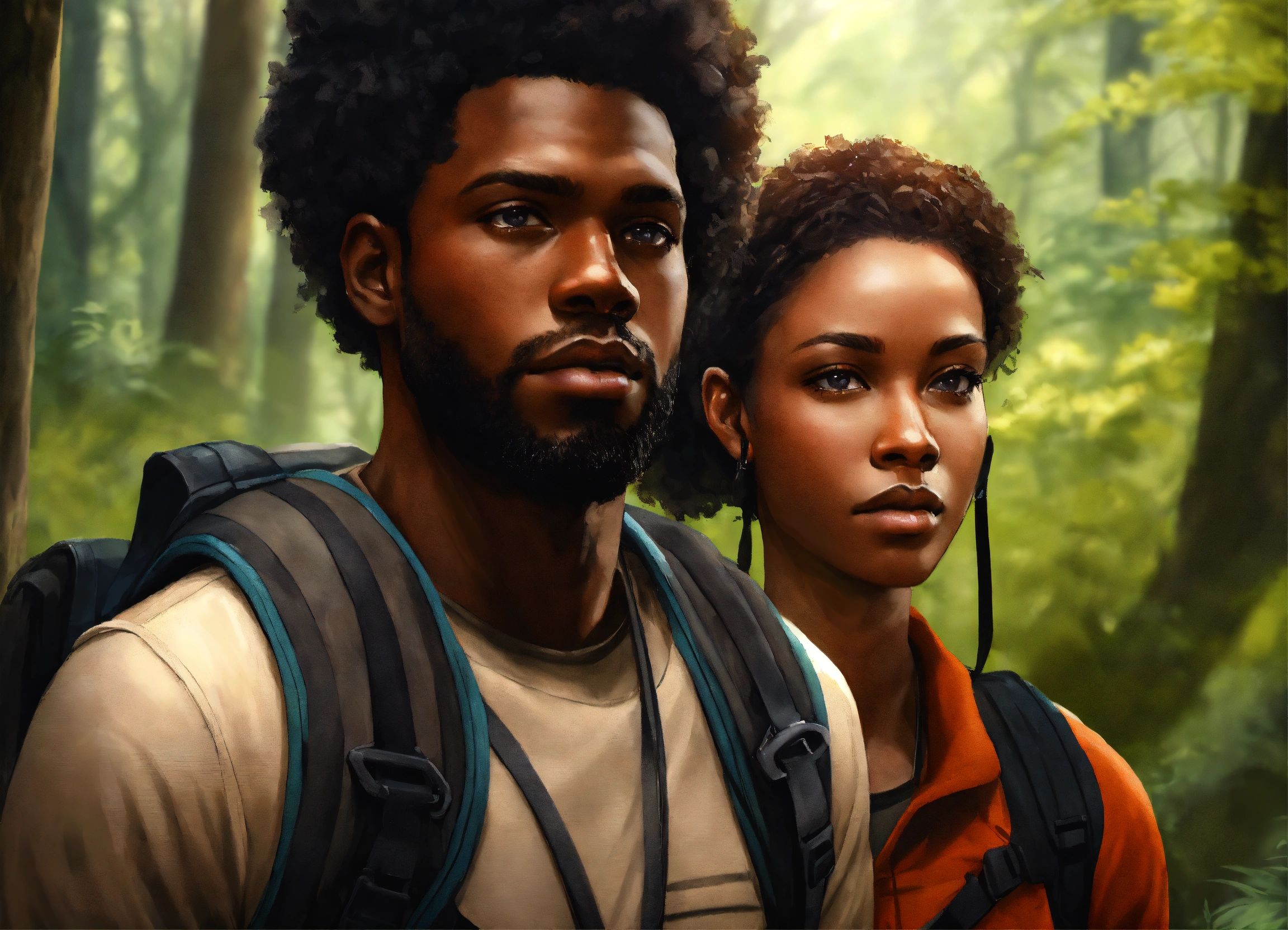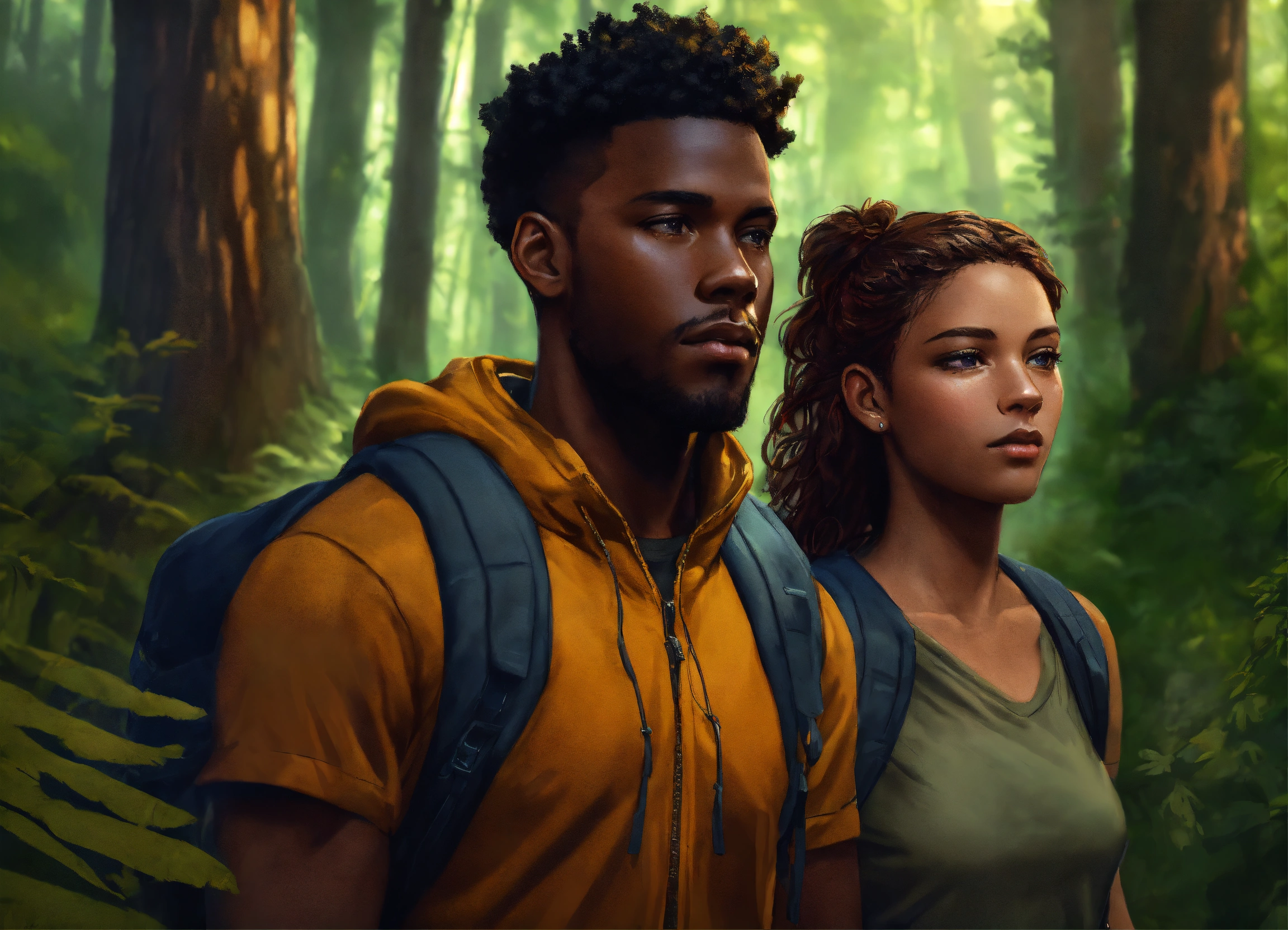 A black male and a female hikers lost in the woods, close up, dark ambient, deep forest background, concept art, design, digital painting, highly detailed, sharp focus, smooth, art by greg rutkowsky