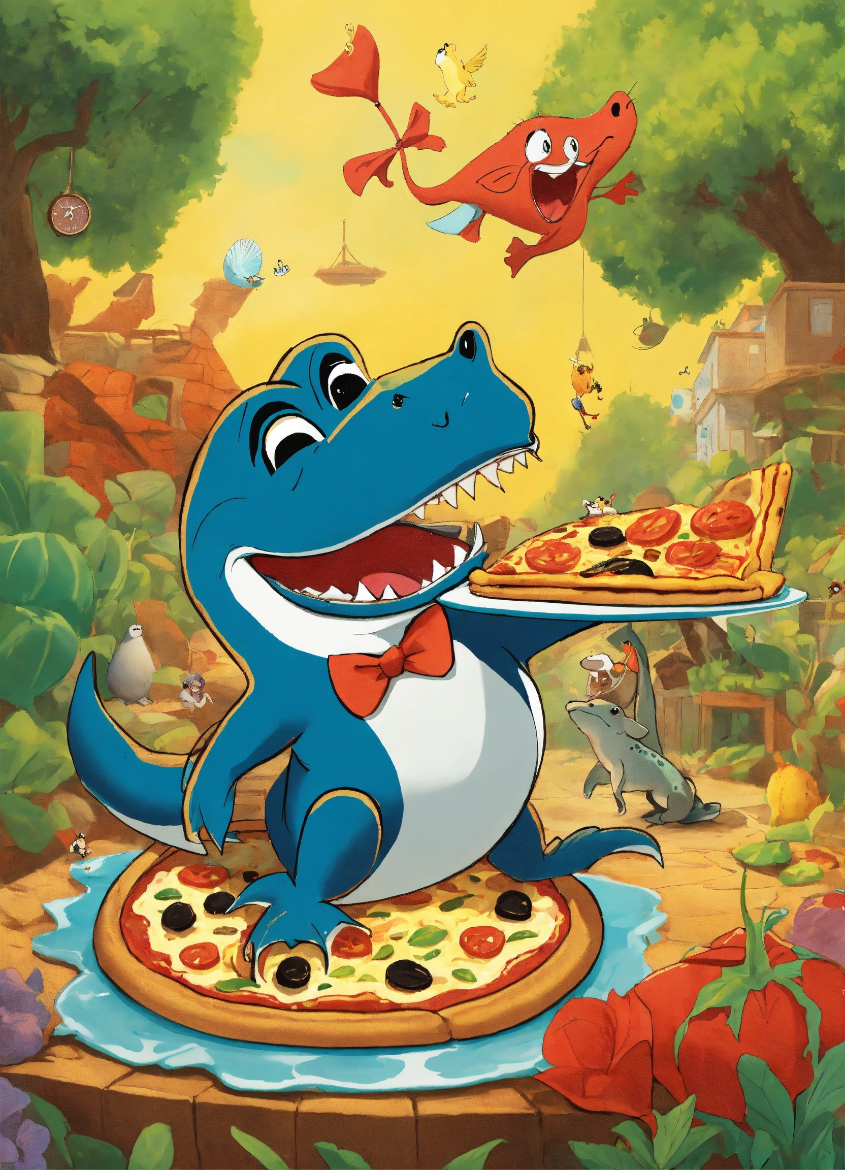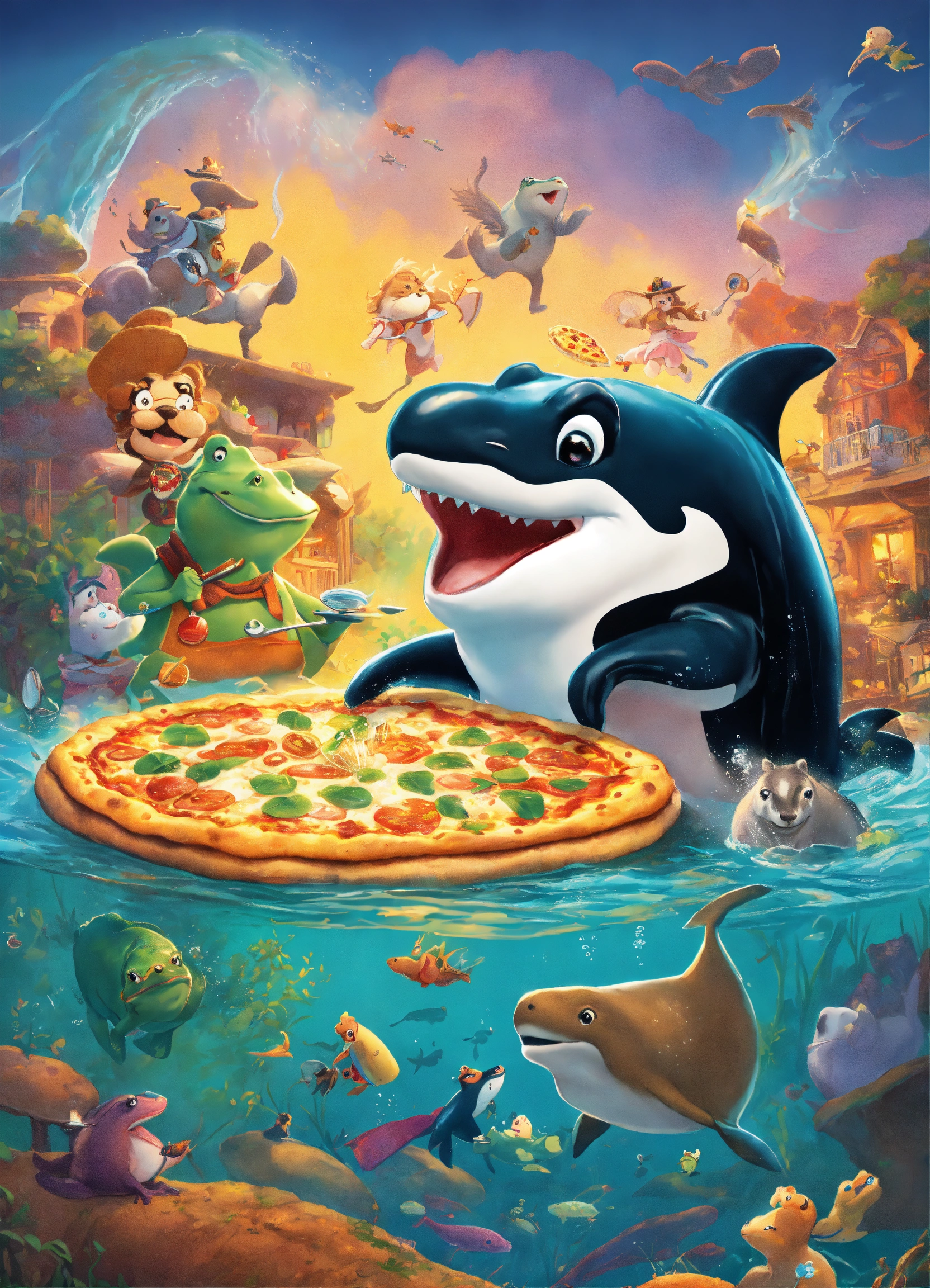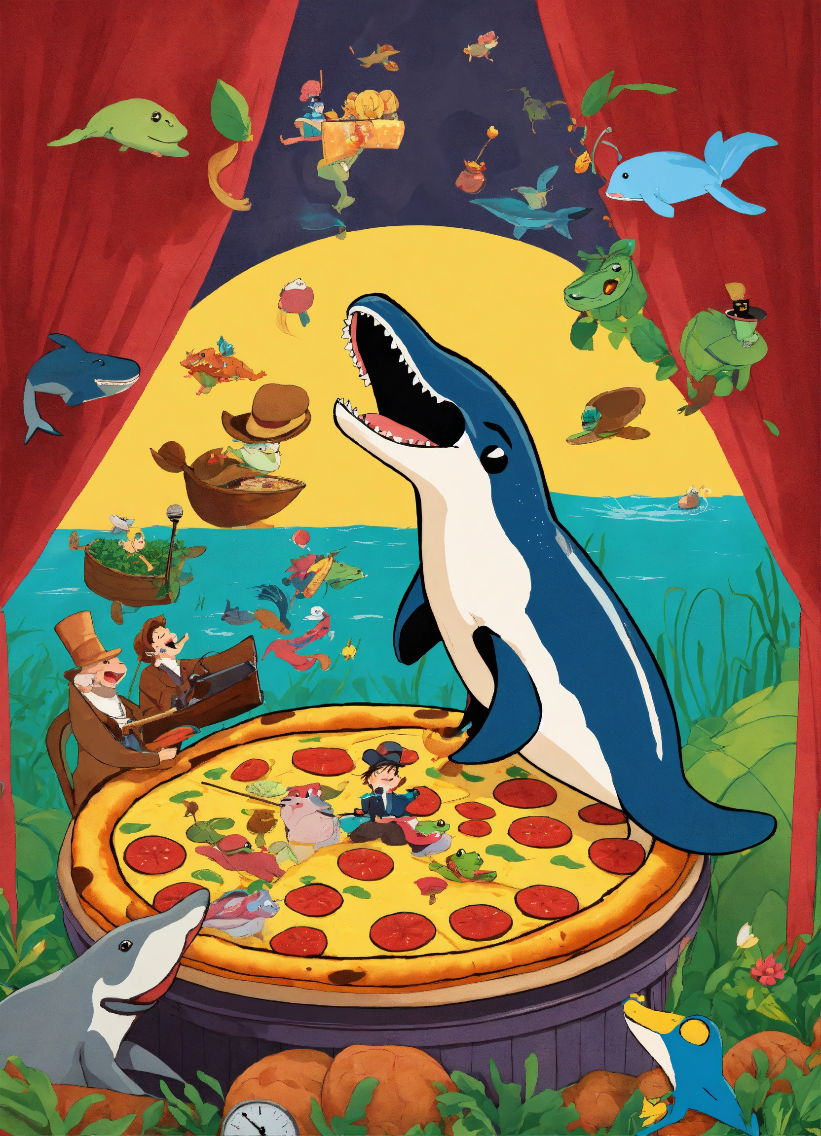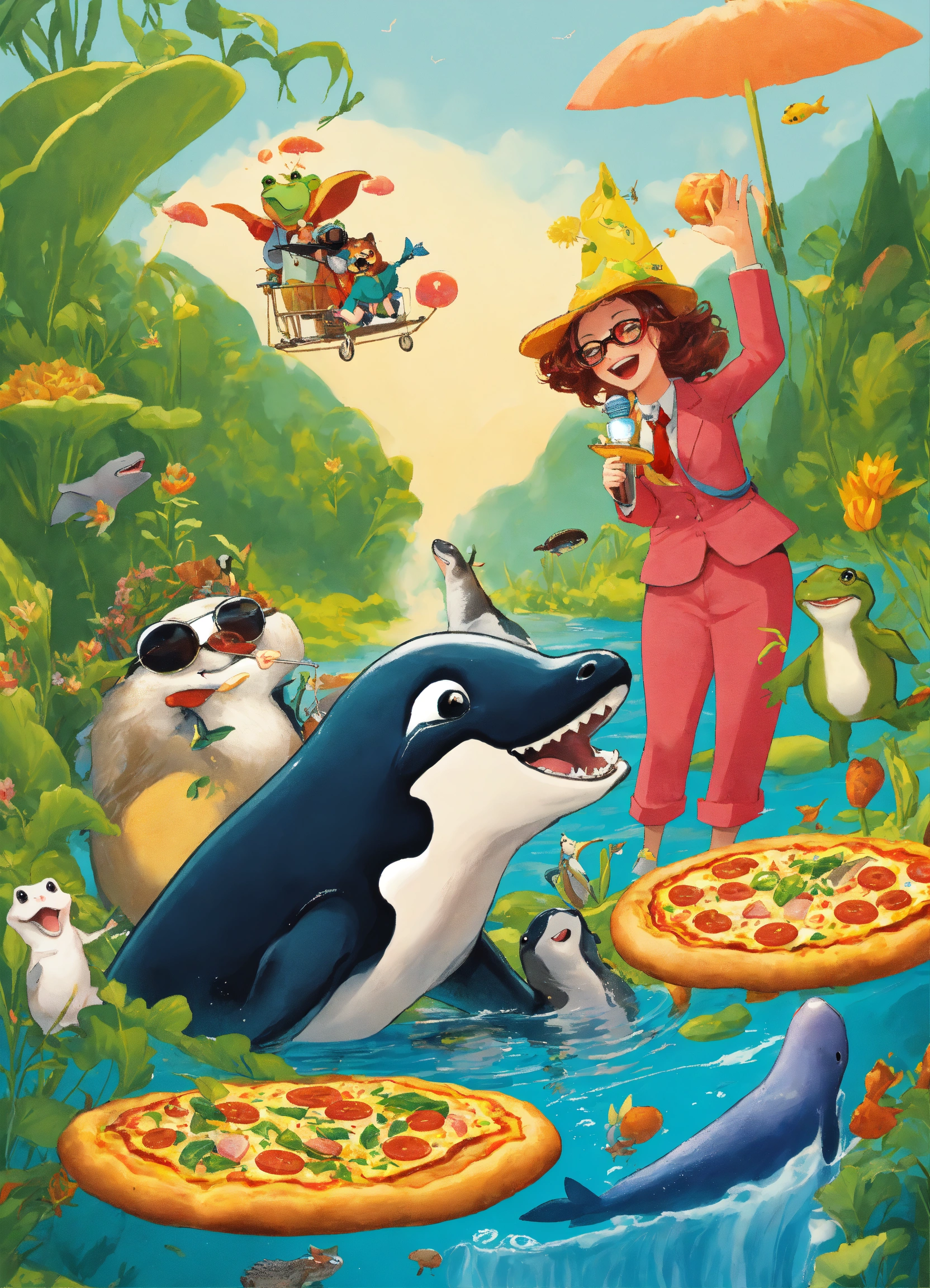 1960's graphic art style, nostalgic imagery. extremely detailed image that includes everything in this description whimsical and lively image that brings together a myriad of characters in a grand, animated celebration. center stage is the cheesy pizza slice holding a microphone, sharing a joke with the sophisticated investigator alligator. around them, a clock with a fork and knife is rushing for more seconds, while a joyful frog munches on bugs on a lily pad. nearby, a playful pony with a sore throat is attempting to sing in a choir with various amused farm animals. in the background, a blushing potato stares at another potato with sunglasses, a proud scarecrow waves an award surrounded by clapping crops, and a musical whale plays the flute in a harmonious underwater orca-stra. above, playful otters create cheerful chaos, causing a cascade of laughter amongst the rest of the characters, all set in a vibrant, cartoonish, and exaggerated world of joy and humor.