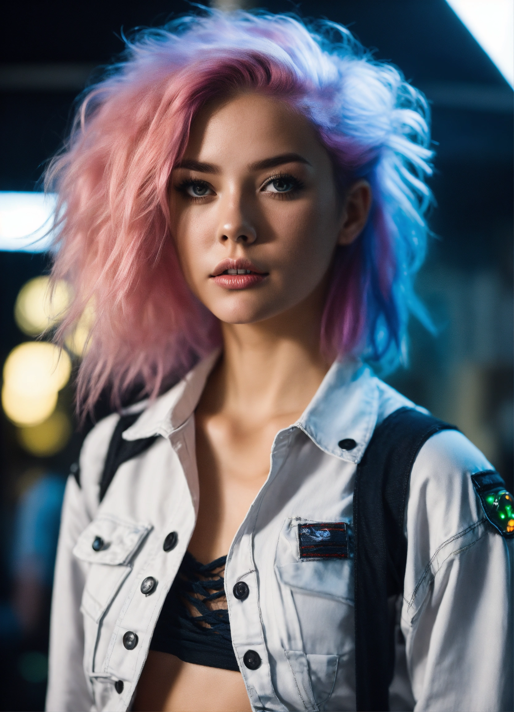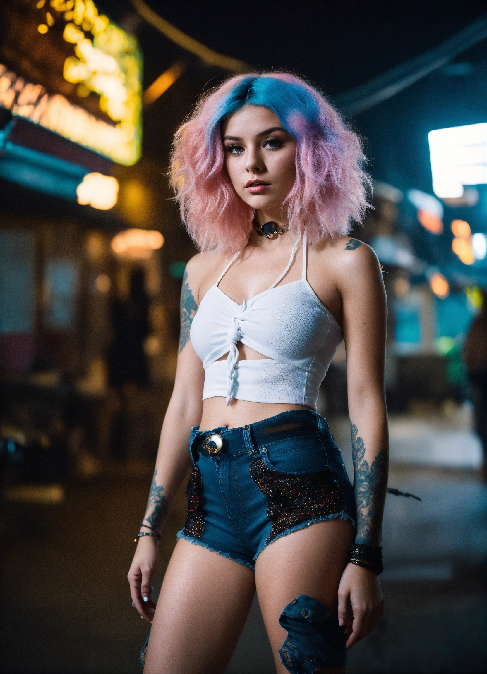 A real photo of a hot 25 year old spacegirl with bright hair. she is wearing a white knotted fishnet blouse, tight short black denim hotpants. she looks very nervous while she stands in a future alien town